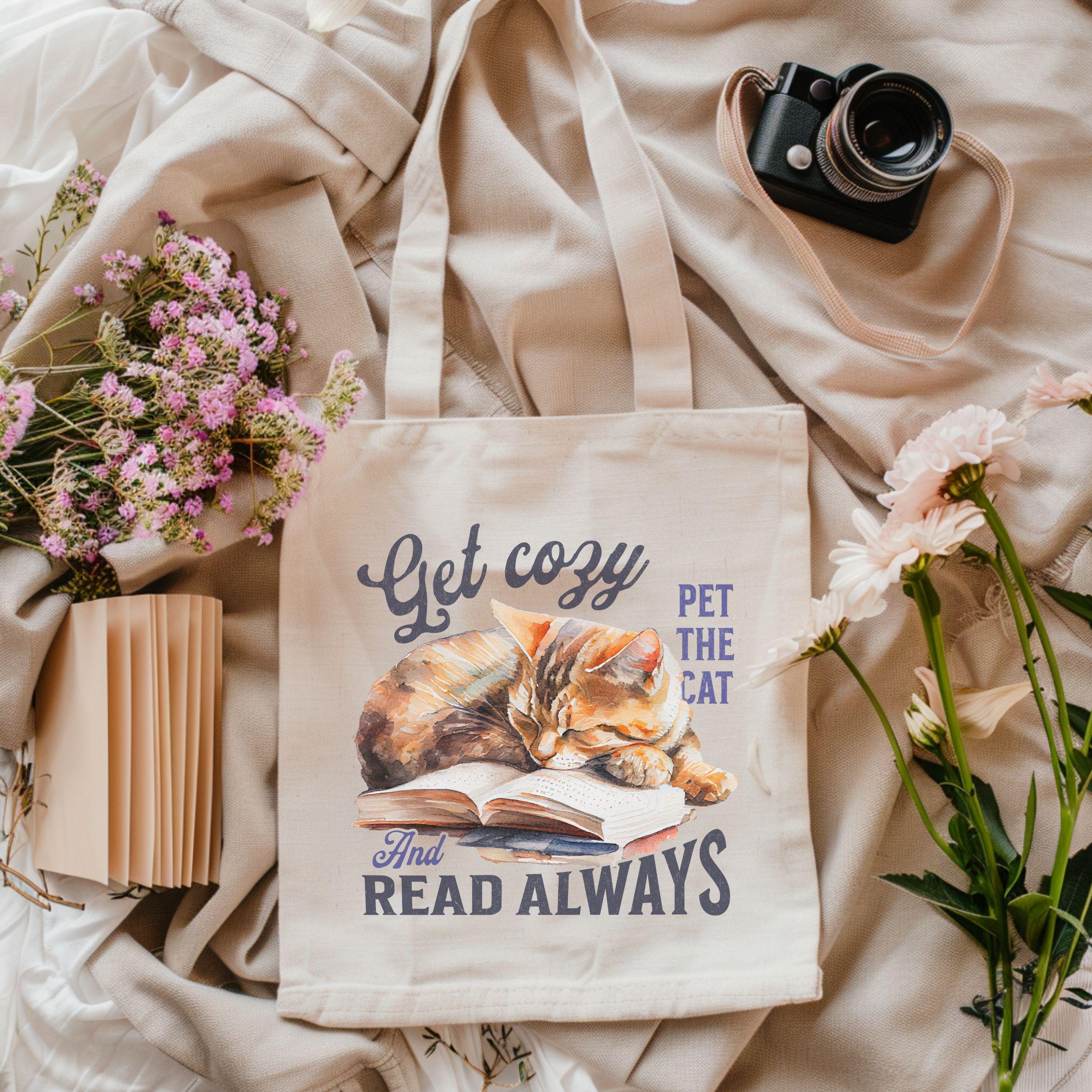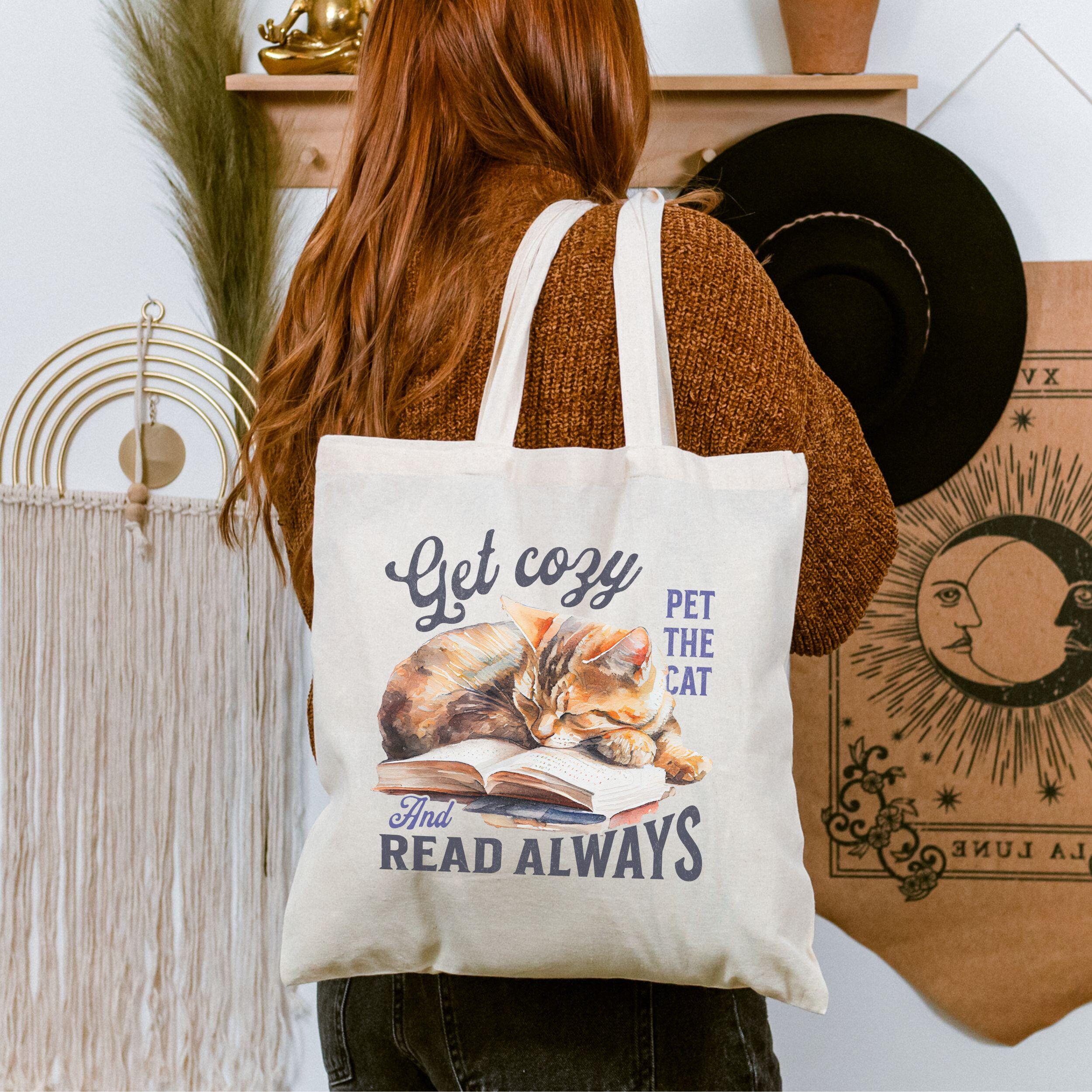 This tote bag exudes a cozy and relaxing vibe, perfect for cat lovers who enjoy curling up with a good book. Ideal for students, book lovers, and cat enthusiasts. Great for gifting on birthdays, holidays, and book lover's celebrations.