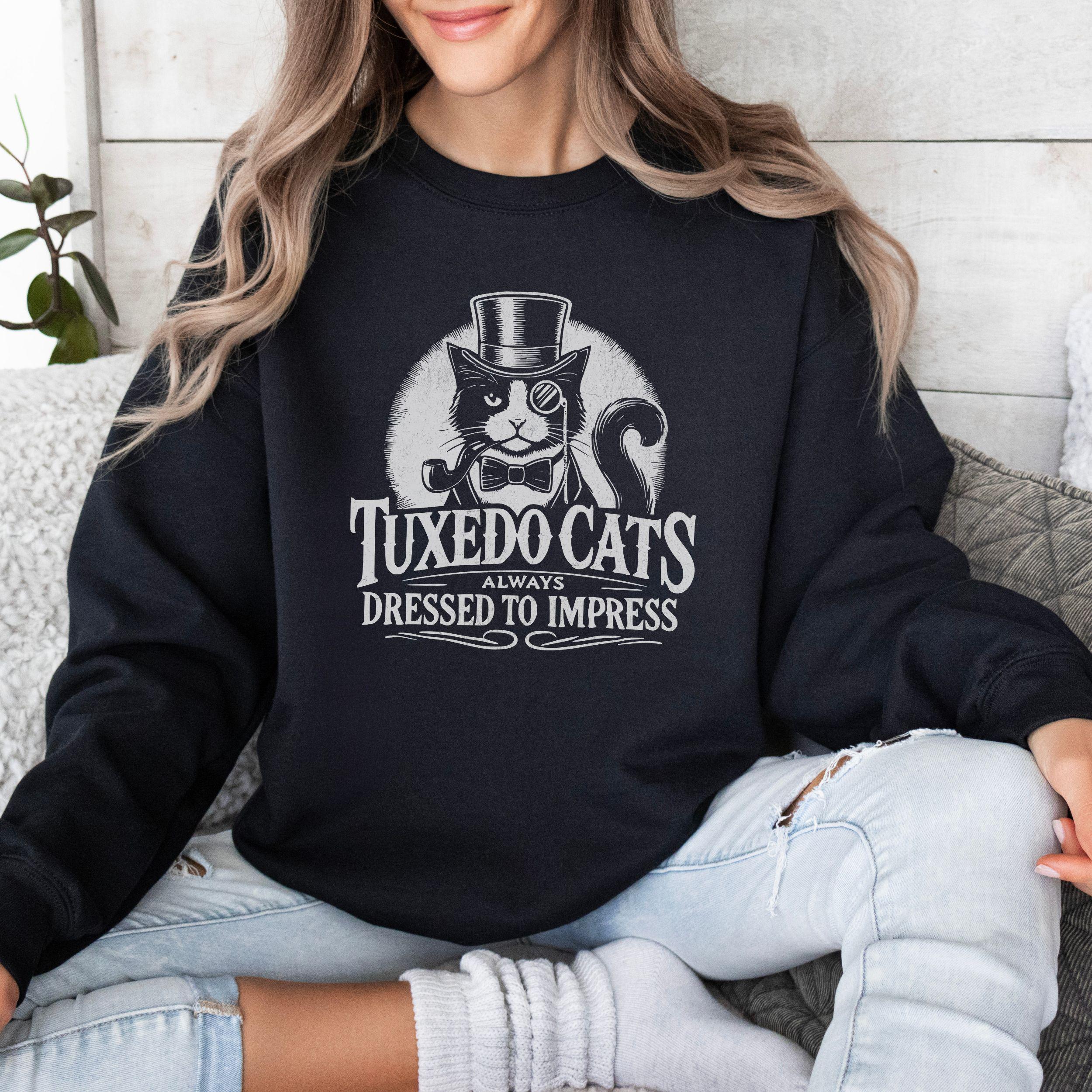This vintage-inspired sweatshirt features a tuxedo cat dressed to impress with a hat, pipe, and monocle. It exudes a playful and sophisticated vibe, perfect for cat lovers who appreciate unique and quirky designs.
