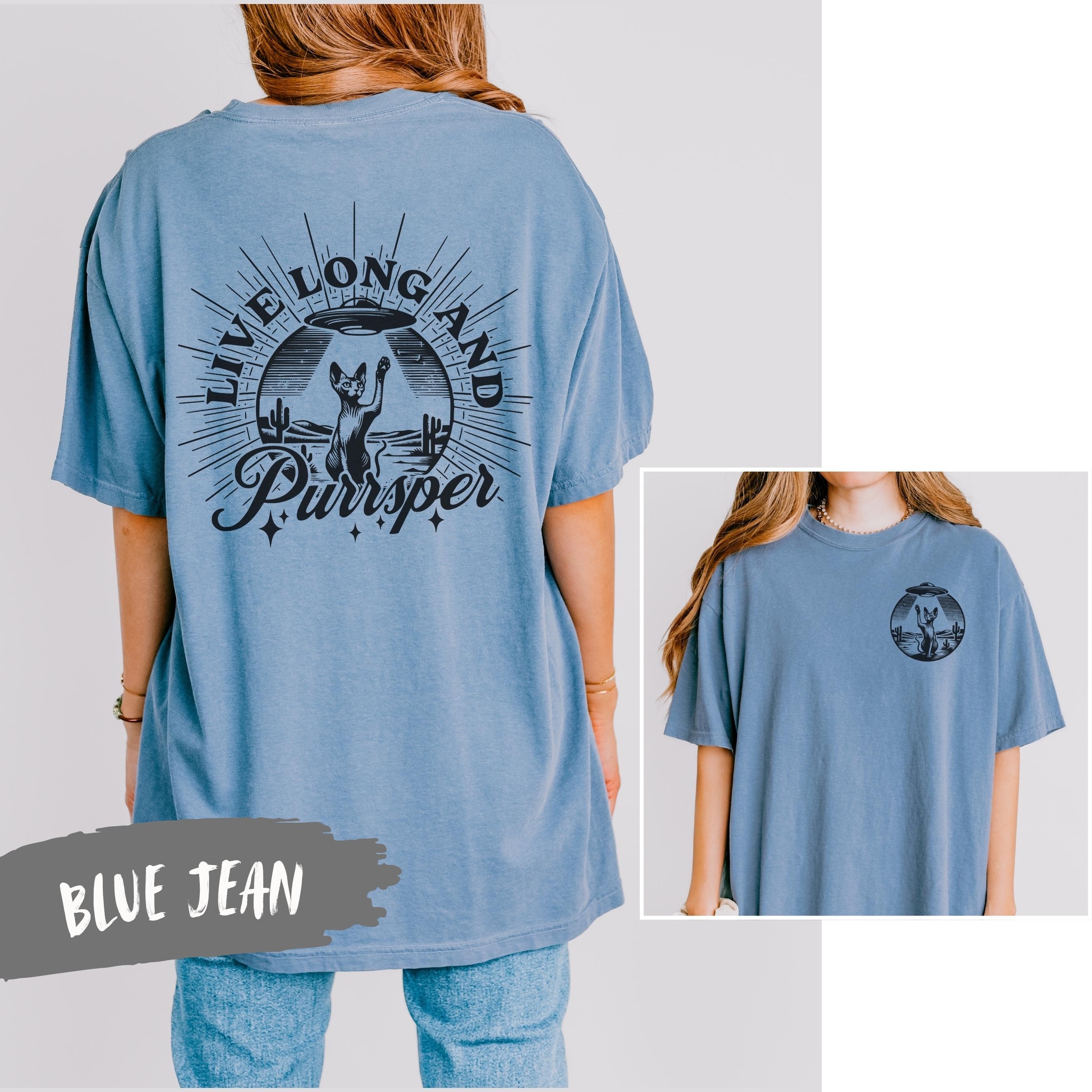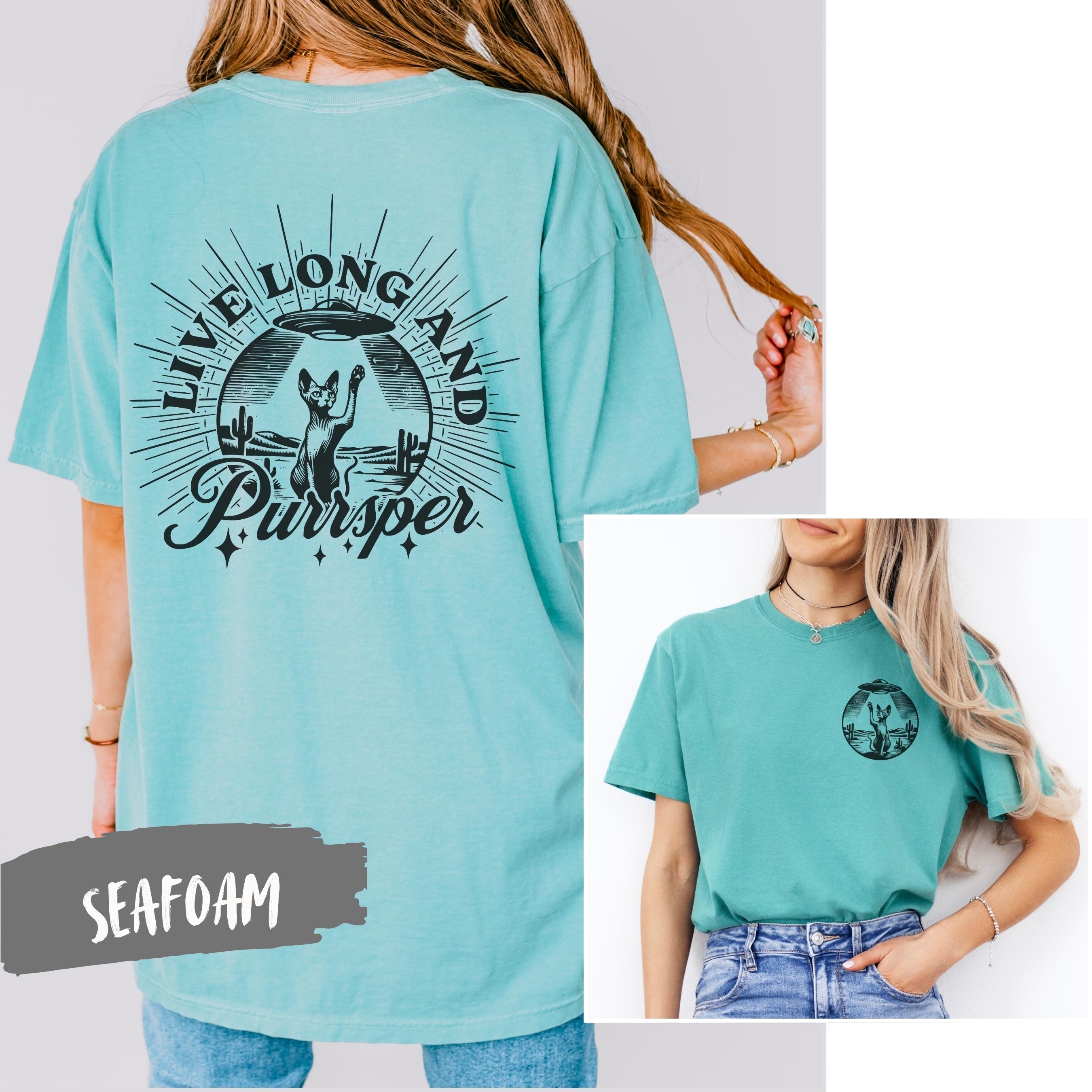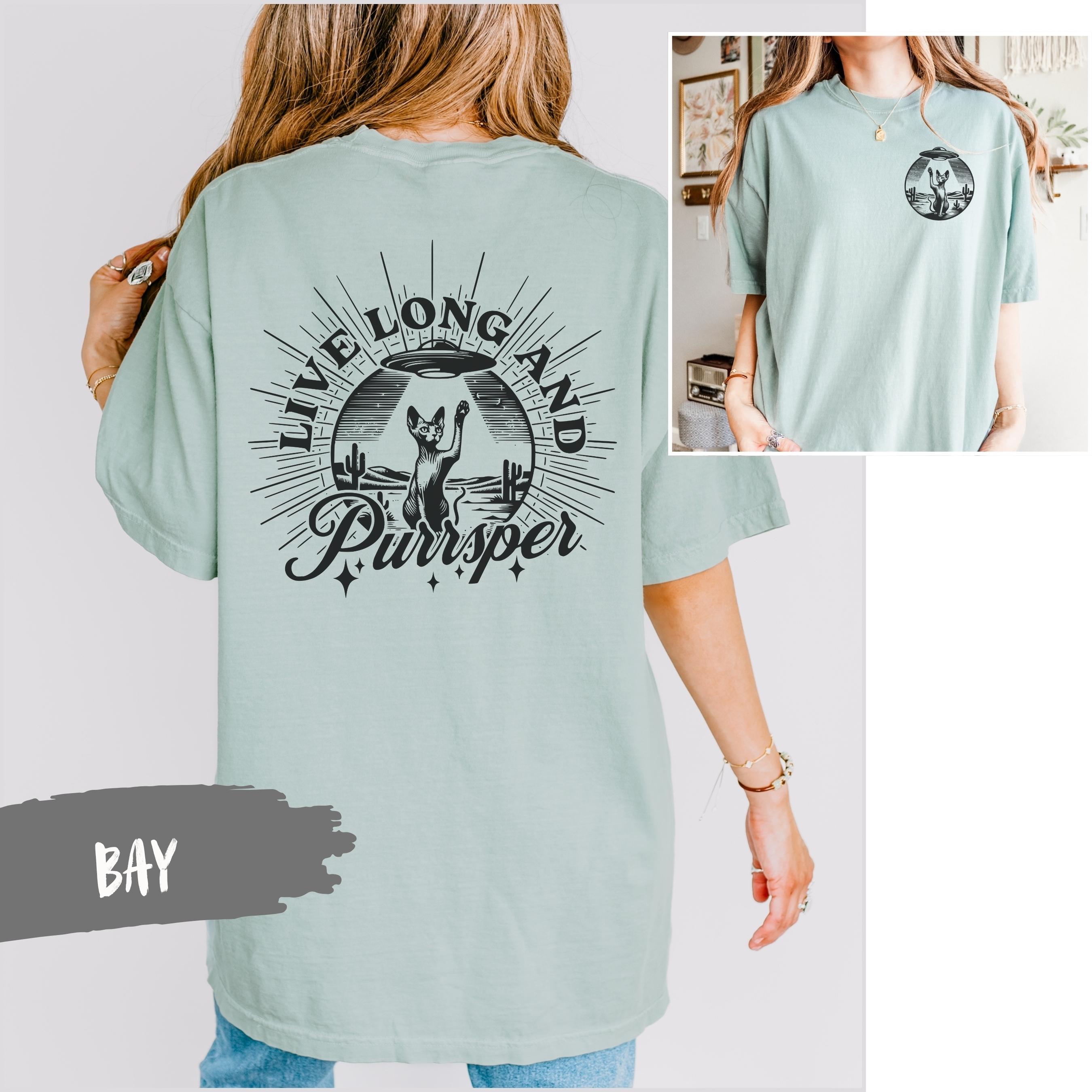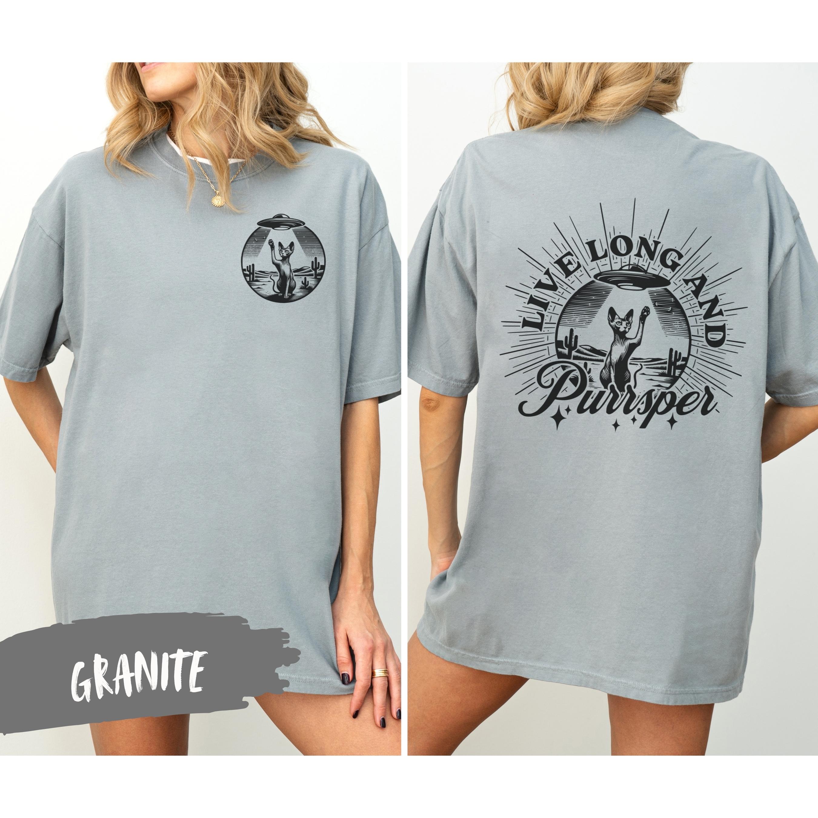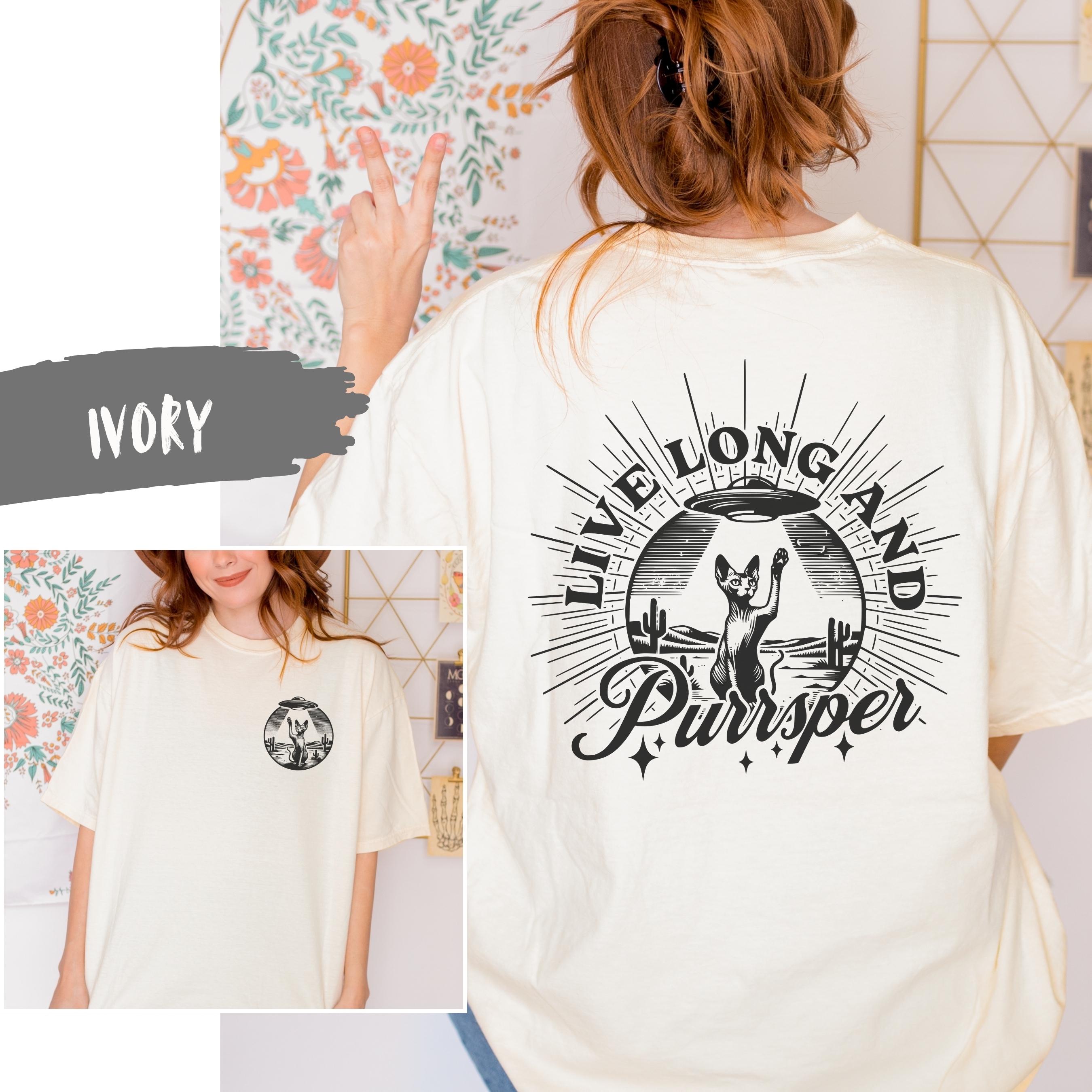 Whimsical Sphynx cat UFO T-shirt with the funny phrase “Live Long and Purrsper”. This shirt gives off a playful and quirky vibe, perfect for cat lovers and those who enjoy unique, lighthearted designs. Ideal for casual wear or as a fun conversation starter. Perfect for hairless cat lovers, sci-fi enthusiasts, and those celebrating Cat Day or UFO Day.
