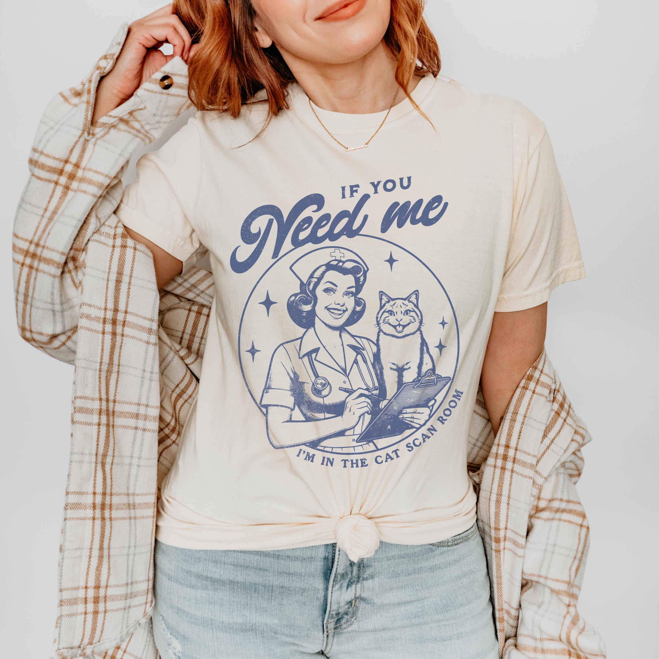 Vintage-style funny nurse T-shirt for cat lovers, perfect for those who enjoy a relaxed and comfortable fit in both casual and semi-formal settings.