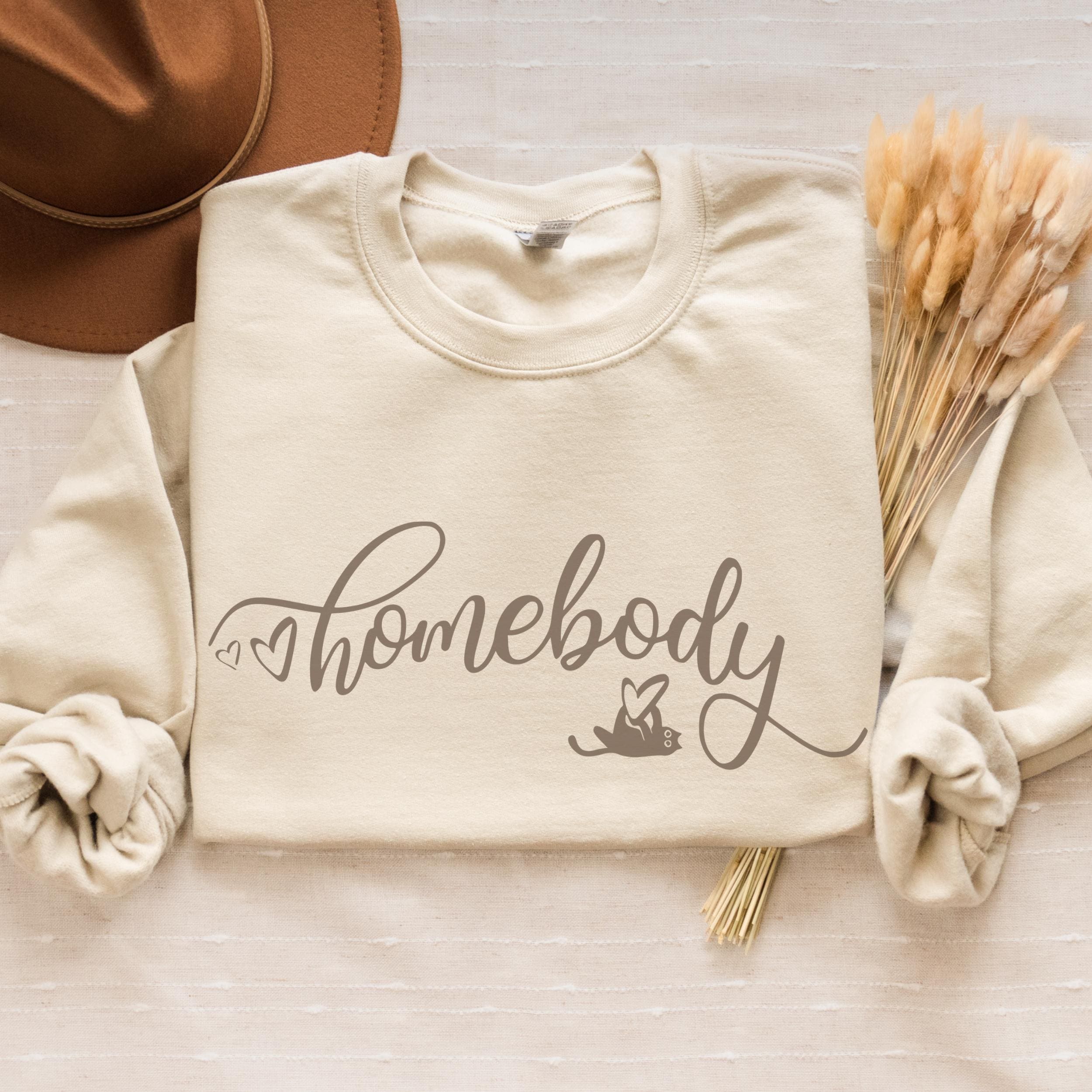 Cozy cat lover sweatshirt with minimalist “homebody” script design, perfect for lounging at home curled up with your cat. Ideal for adults who enjoy comfort and simple, stylish designs. Perfect for holidays, birthdays, and everyday wear.