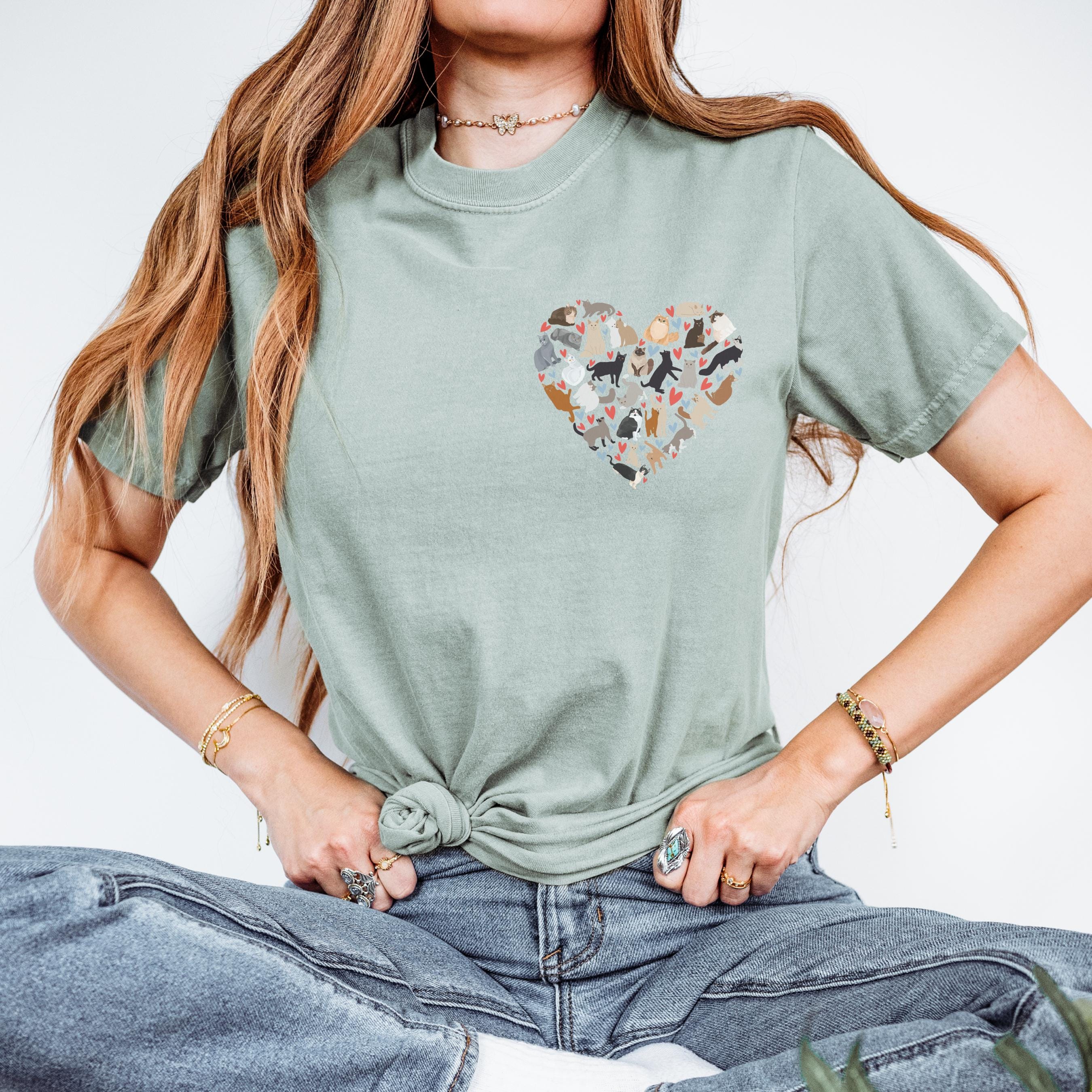 Calling all cat moms, feline fanatics, and heart-eyed kitty people—this one’s for you. Featuring a soft and sweet heart made entirely of playful kitties and tiny blue and red hearts, this cozy Comfort Colors tee is the purrfect way to show off your cat love. A thoughtful and wearable cat lovers gift that feels as good as it looks.