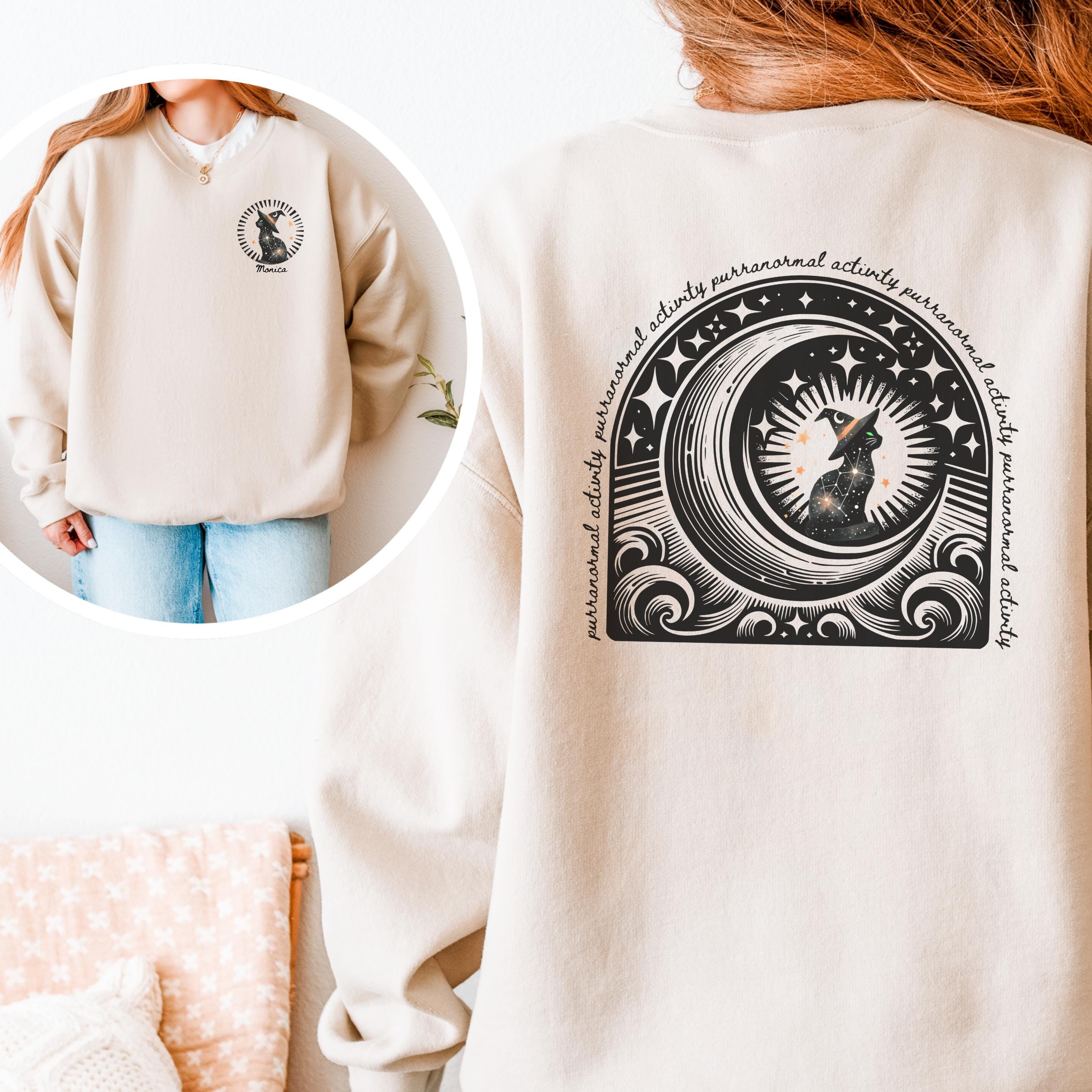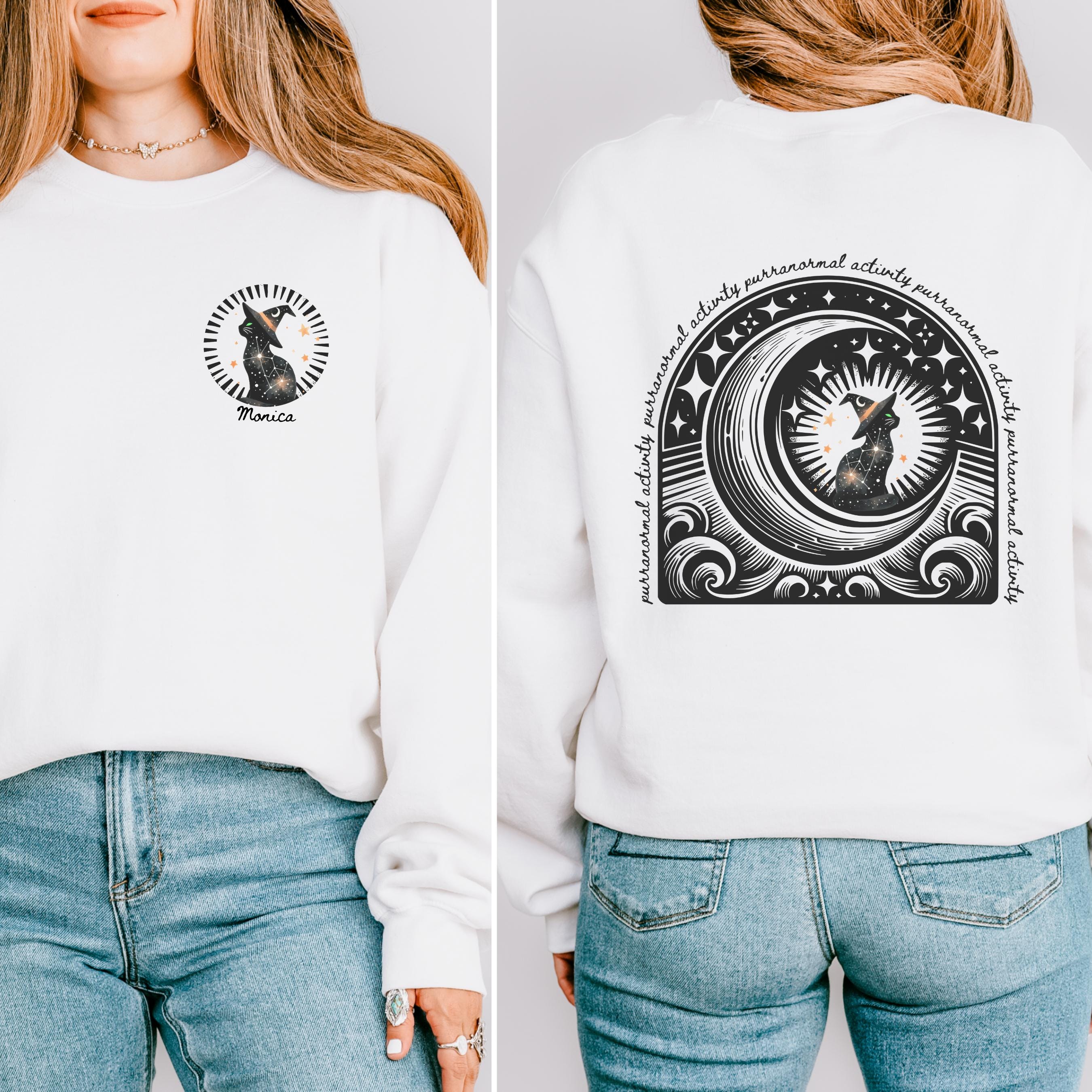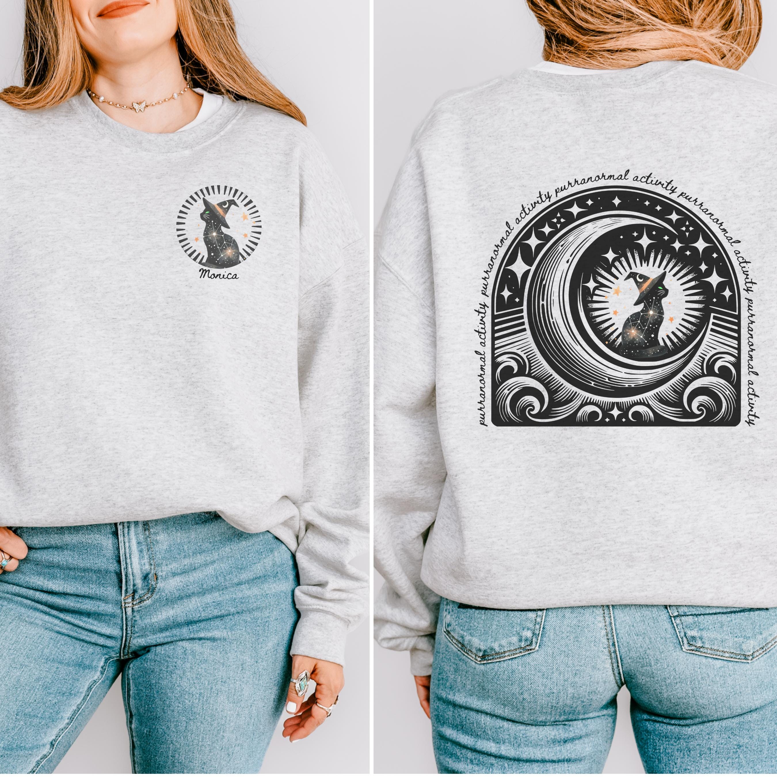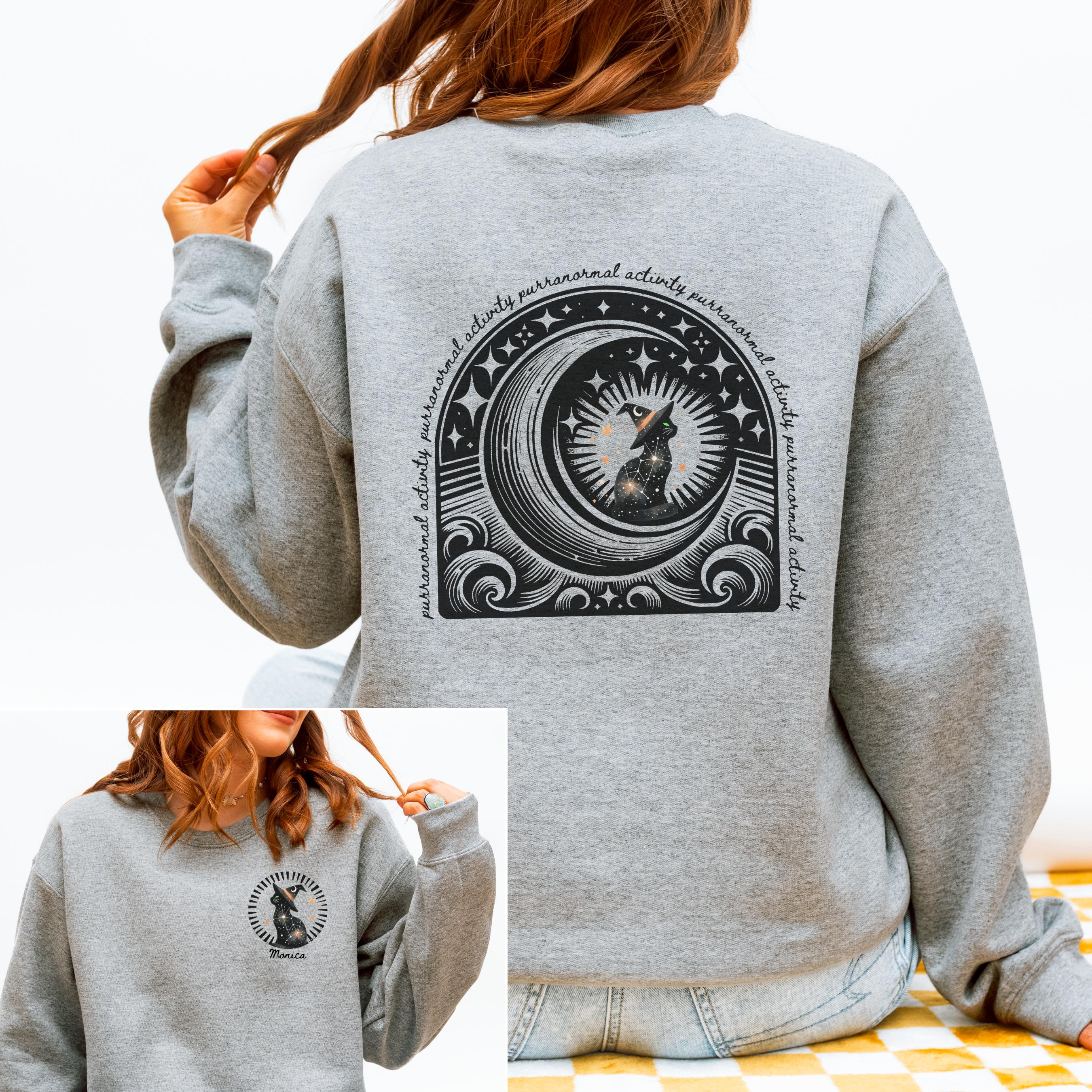 ✨ Stay cozy and spooky with this witchy black cat sweatshirt featuring a pocket-sized front design, bold back print, and the option to personalize it with your name. Perfect for Halloween lovers, cat moms, and anyone craving a magical crewneck pullover that stands out all season long.