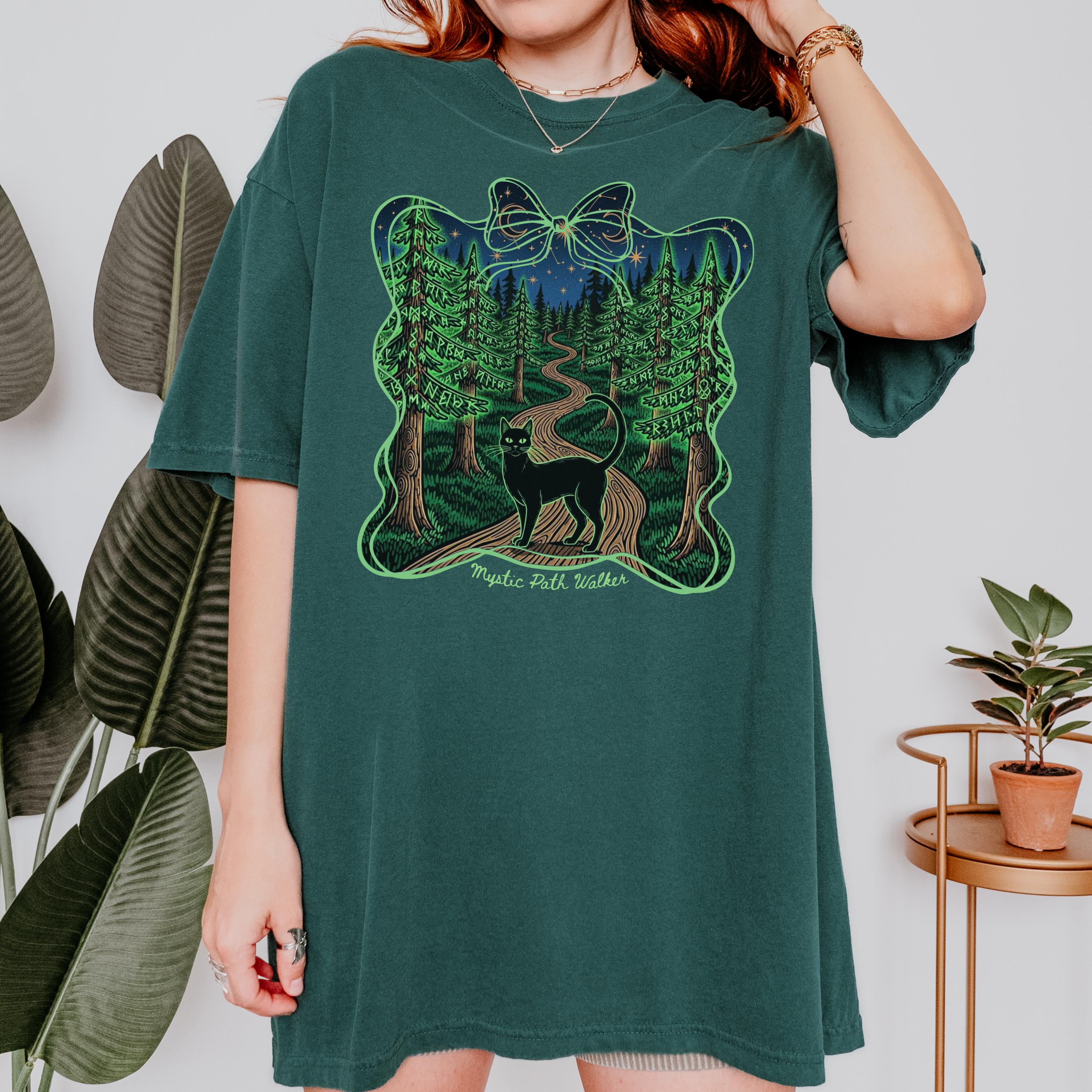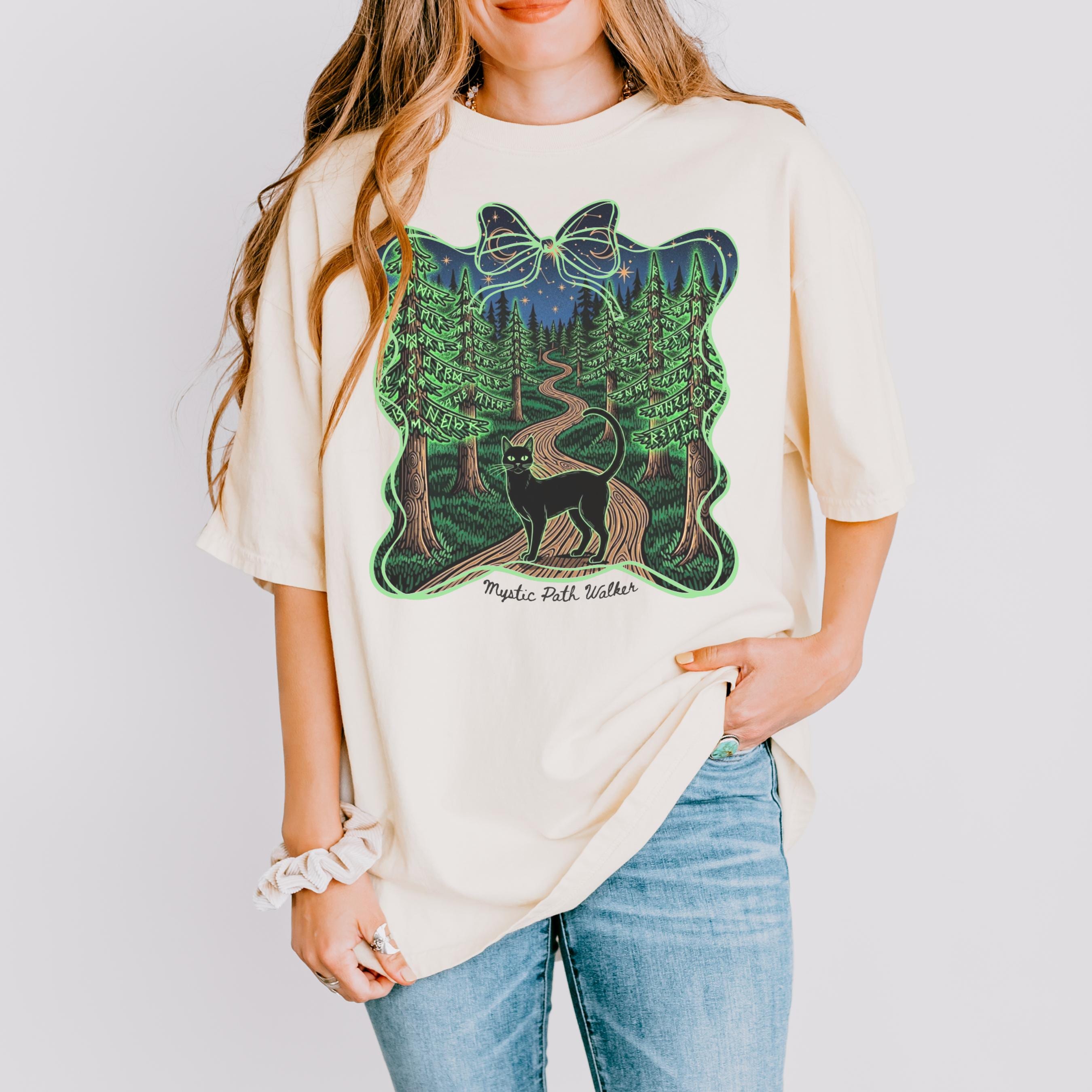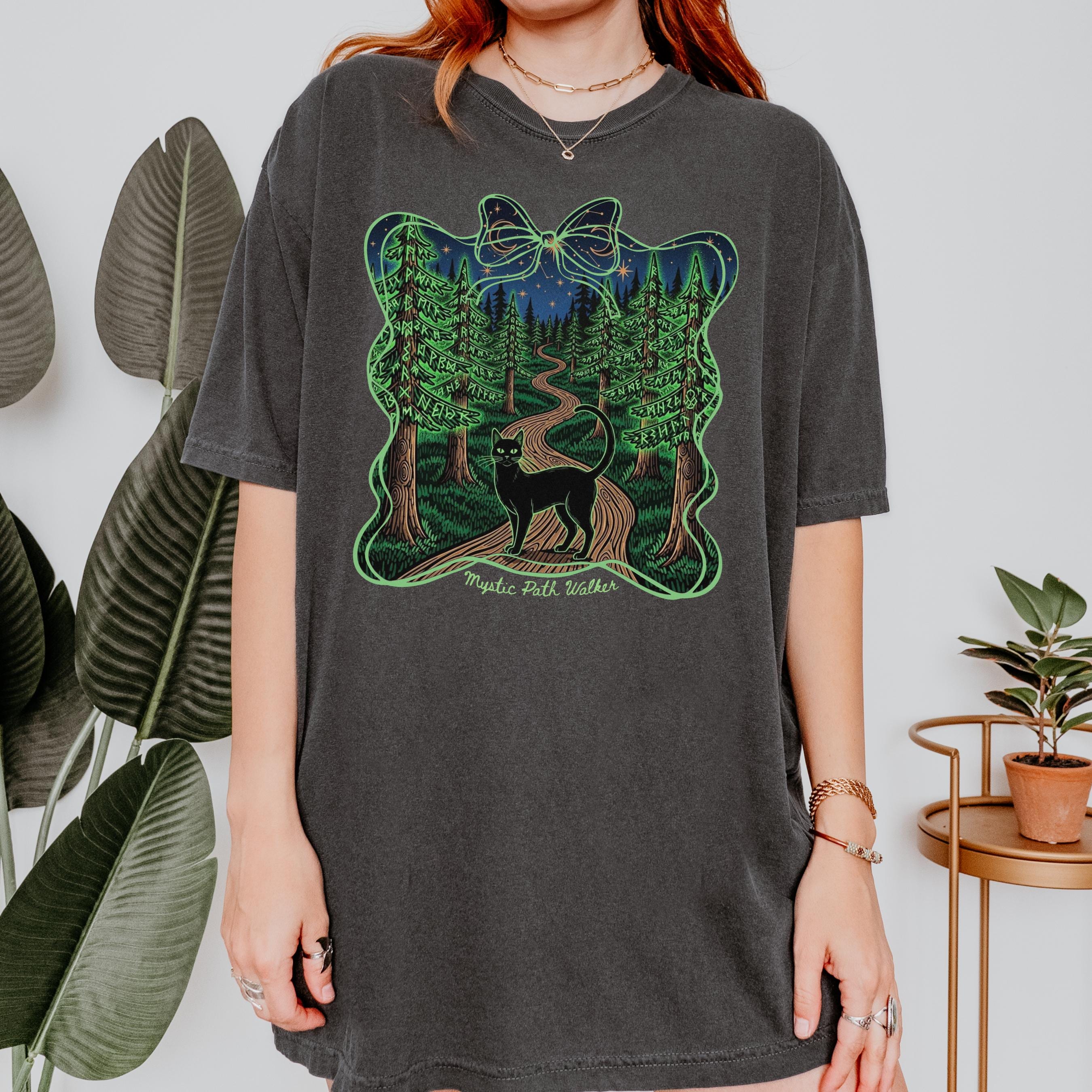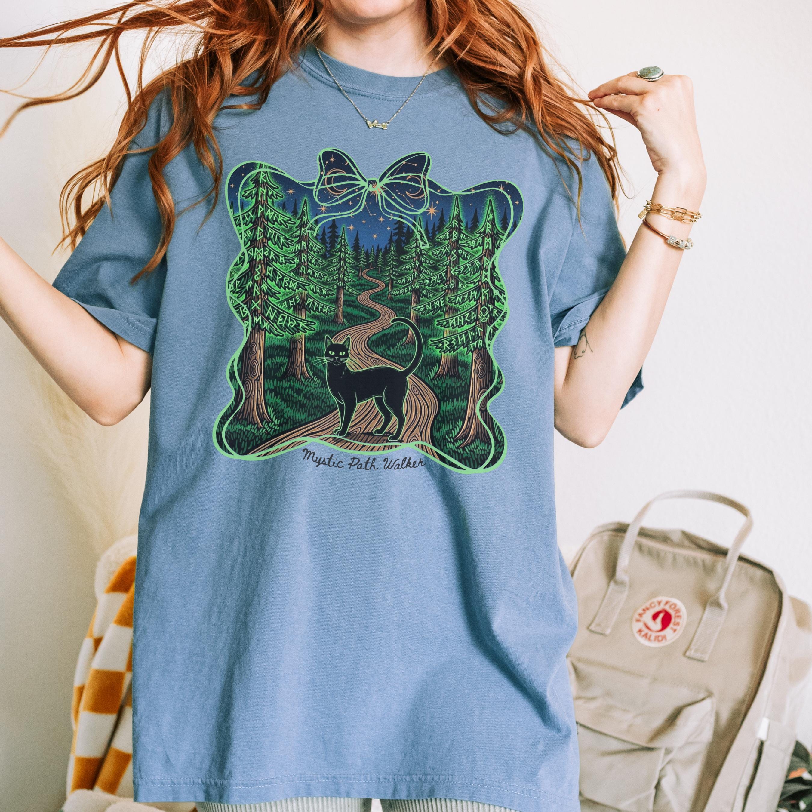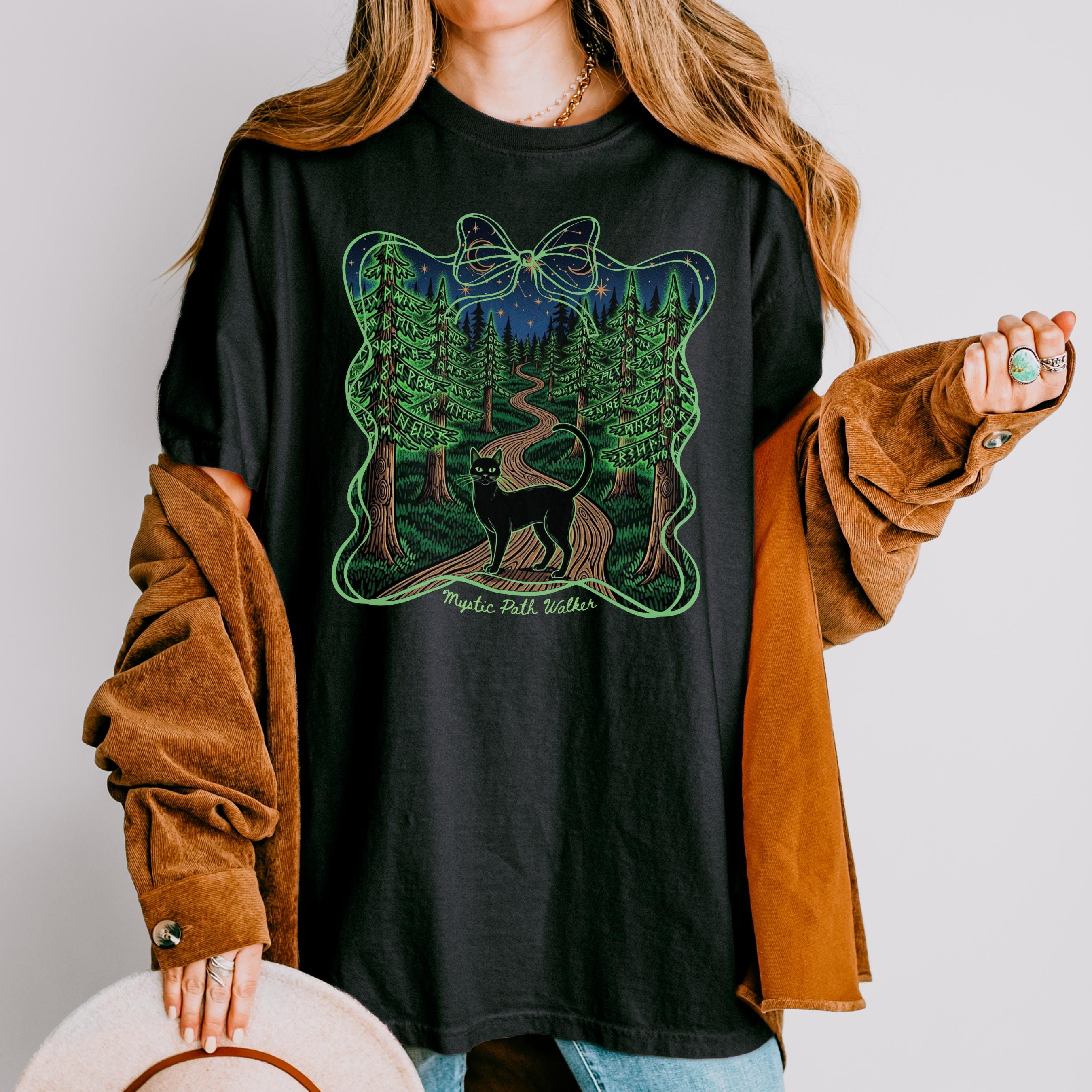 Step into your mystical era with this witchy black cat shirt. Printed on a soft, garment-dyed tee, this witchy graphic tee with moon and stars combines vintage comfort with celestial cat magic. It’s a wardrobe staple for cat lovers, witches, or anyone with a mystical streak—and makes an enchanting witchy gift for her, cat mom graphic tee gift, or birthday gift for cat lover.