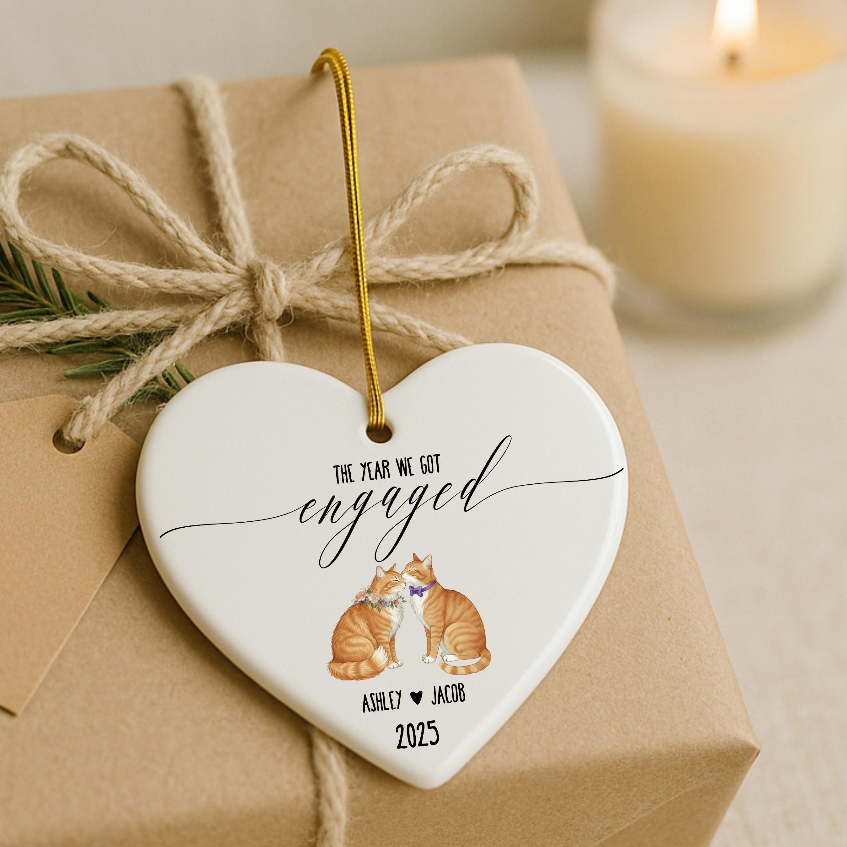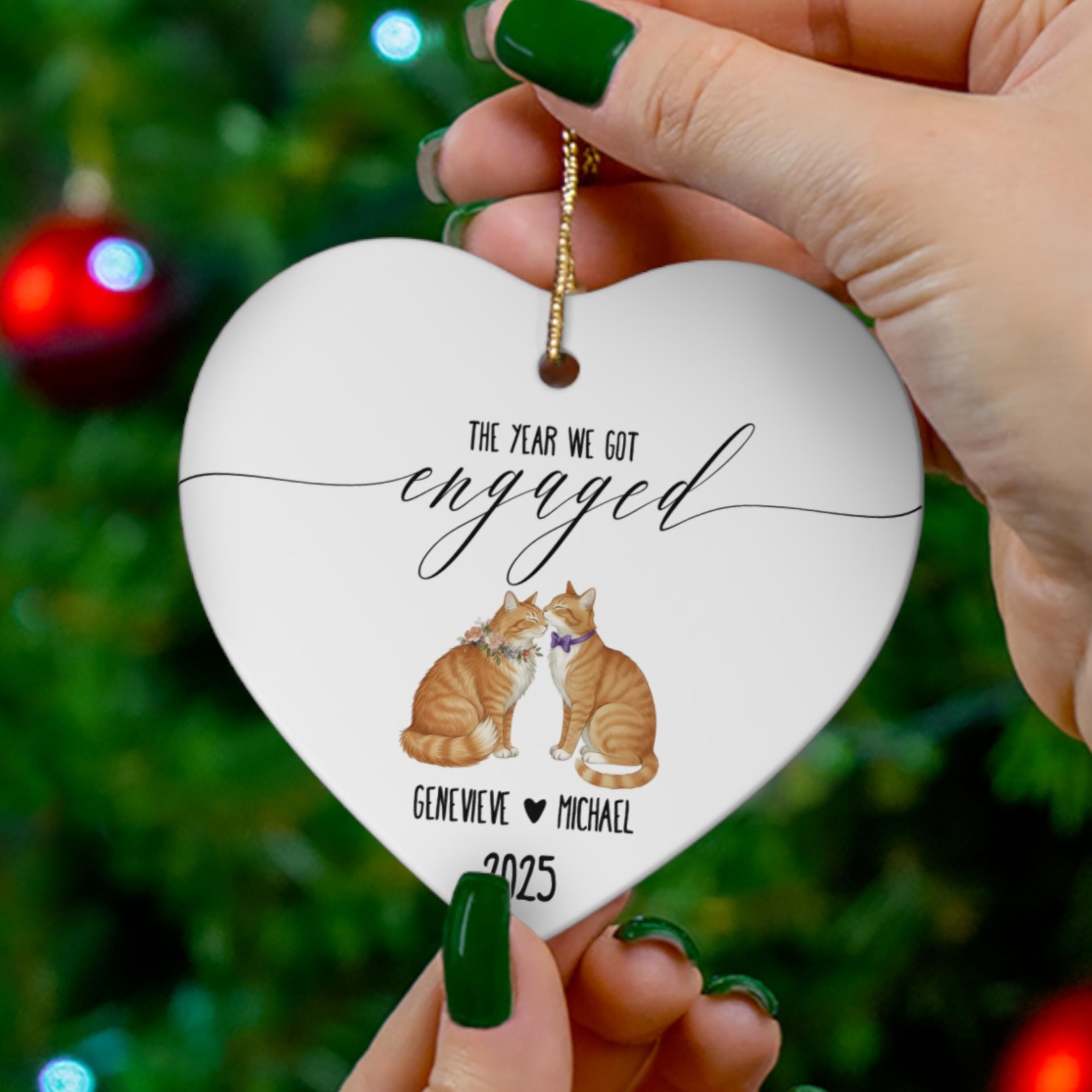 This heart-shaped ceramic ornament is the purr-fect keepsake for engaged couples who share their home (and hearts) with two cuddly cats. Featuring a tender moment between two orange tabby cats, it captures the cozy, committed energy of your feline family—and your forever love. Whether it’s a proposal gift, an engagement celebration, or just a little “we said yes” memory, this ornament is pawsitively adorable.