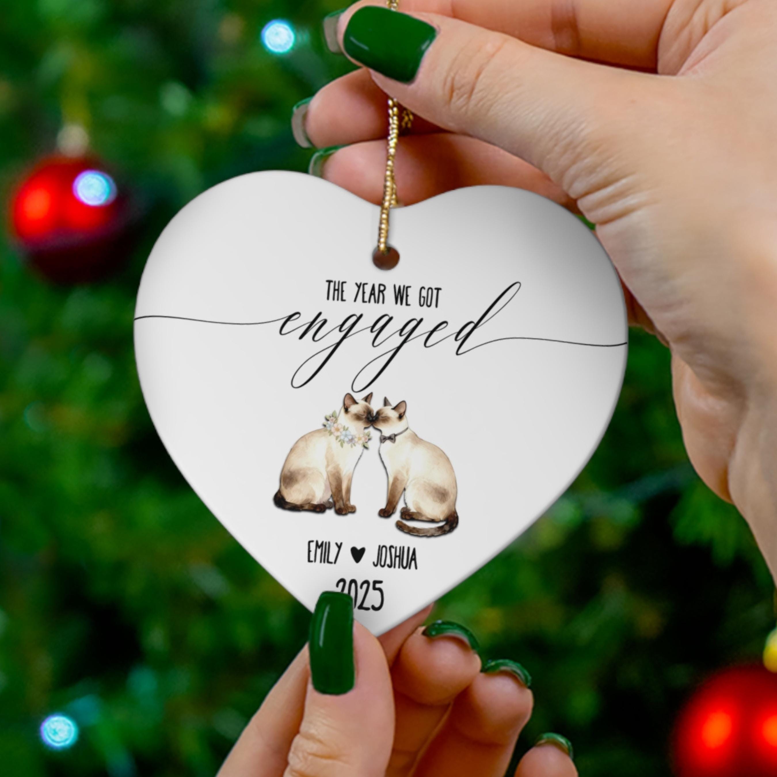 This heart-shaped ceramic ornament is the purr-fect keepsake for engaged couples who share their home (and hearts) with two cuddly cats. Featuring a tender moment between two Siamese cats, it captures the cozy, committed energy of your feline family—and your forever love. Whether it’s a proposal gift, an engagement celebration, or just a little “we said yes” memory, this ornament is pawsitively adorable.