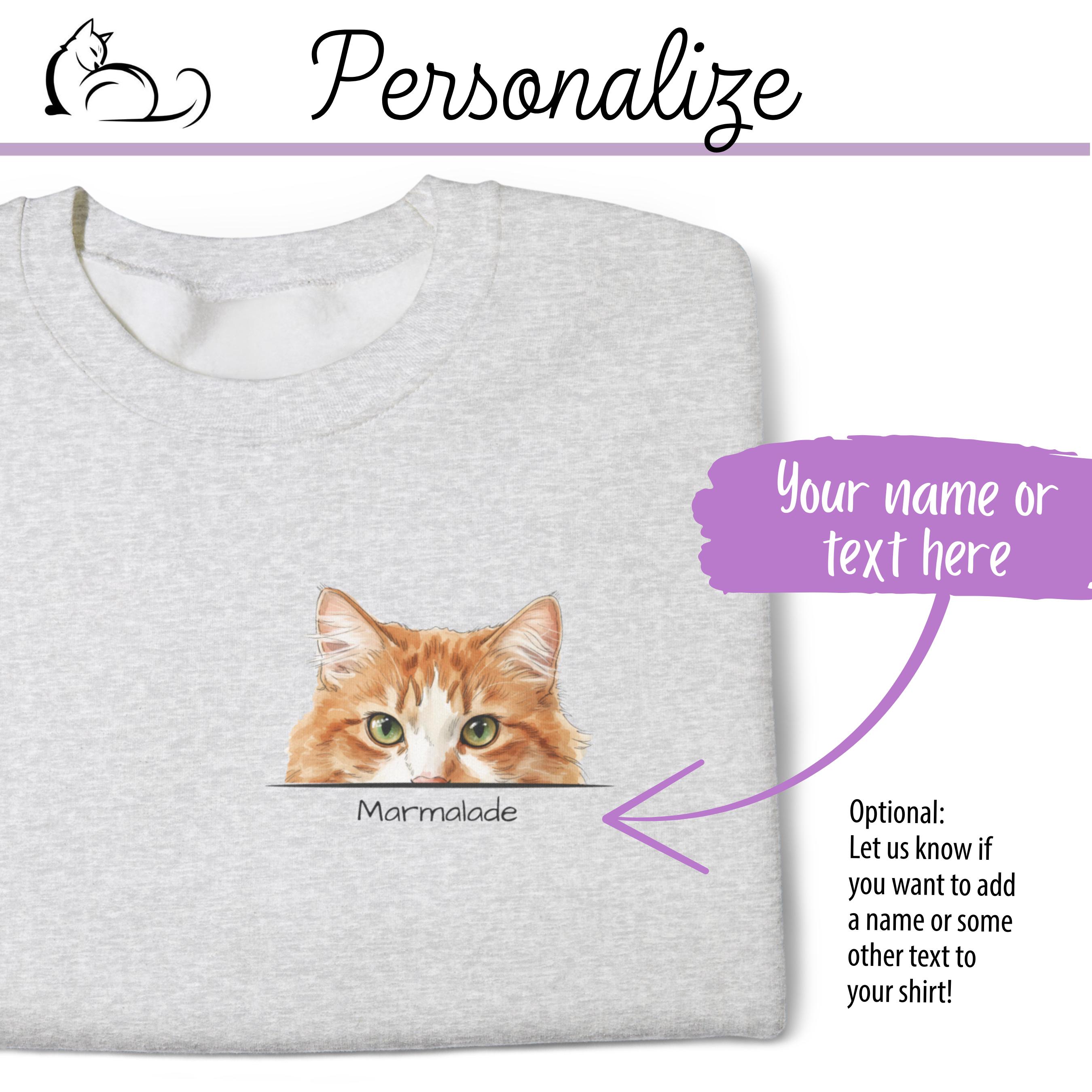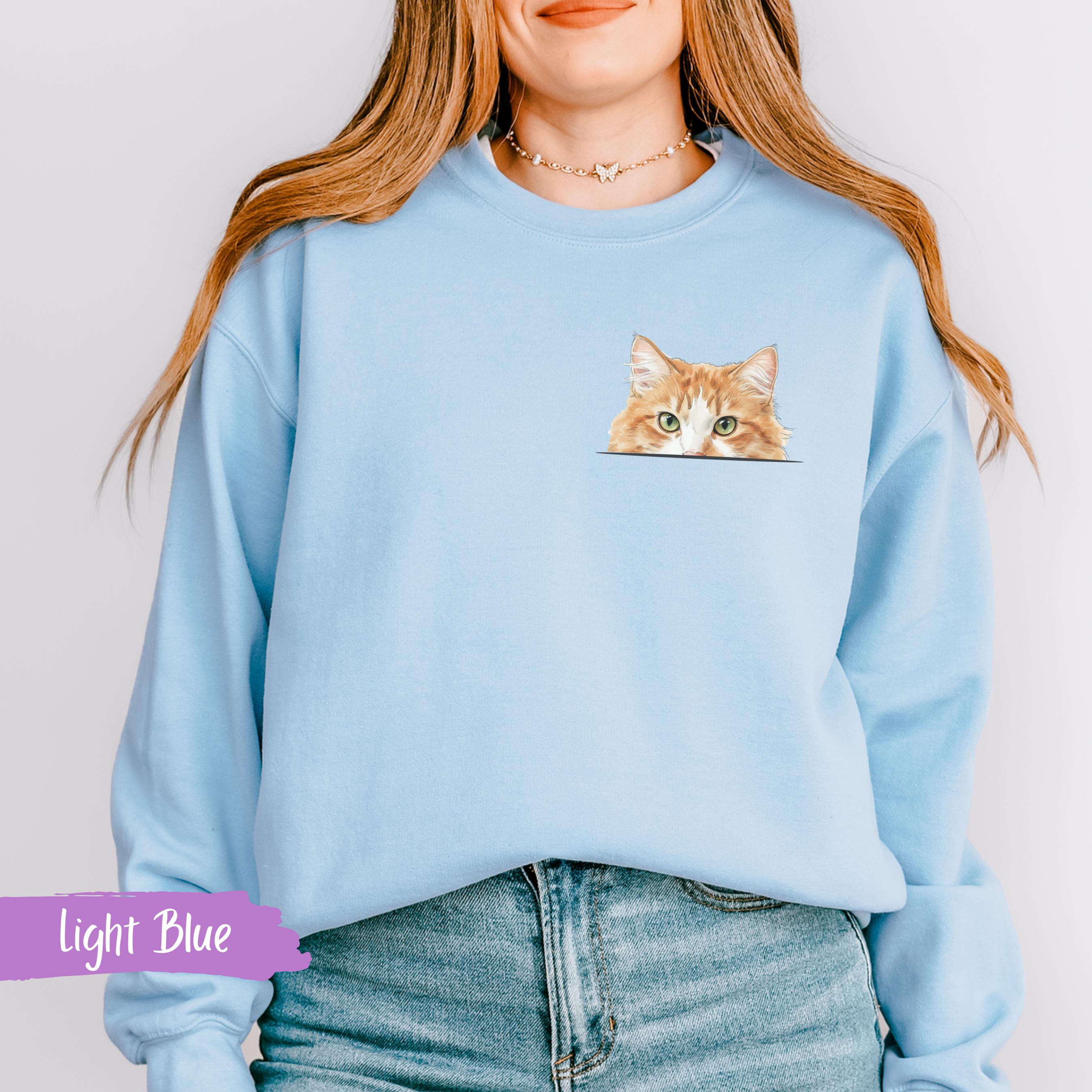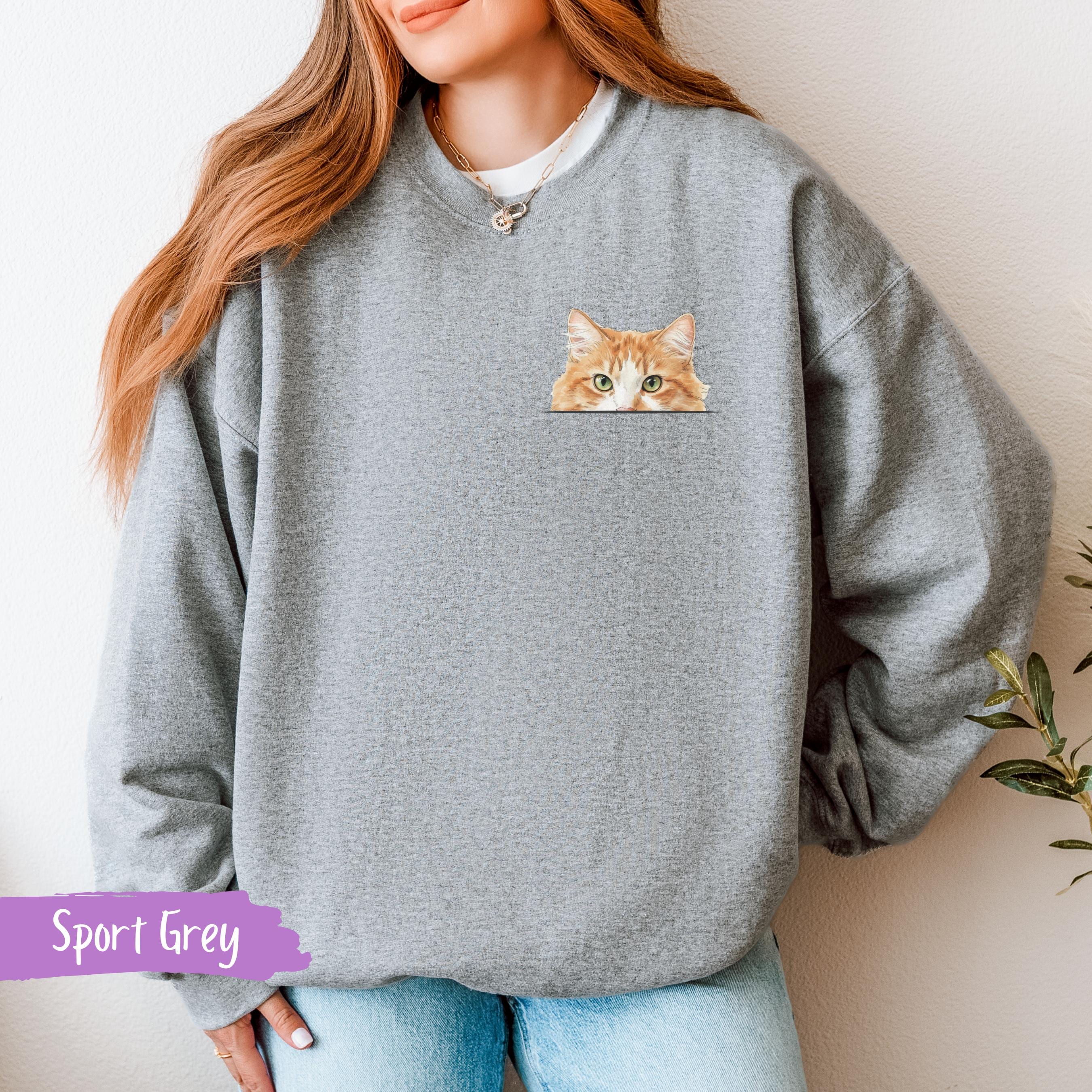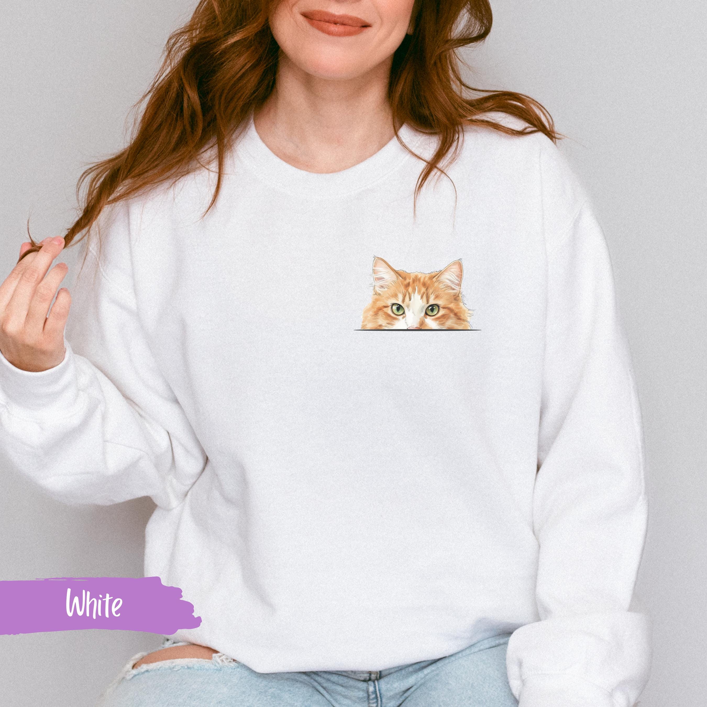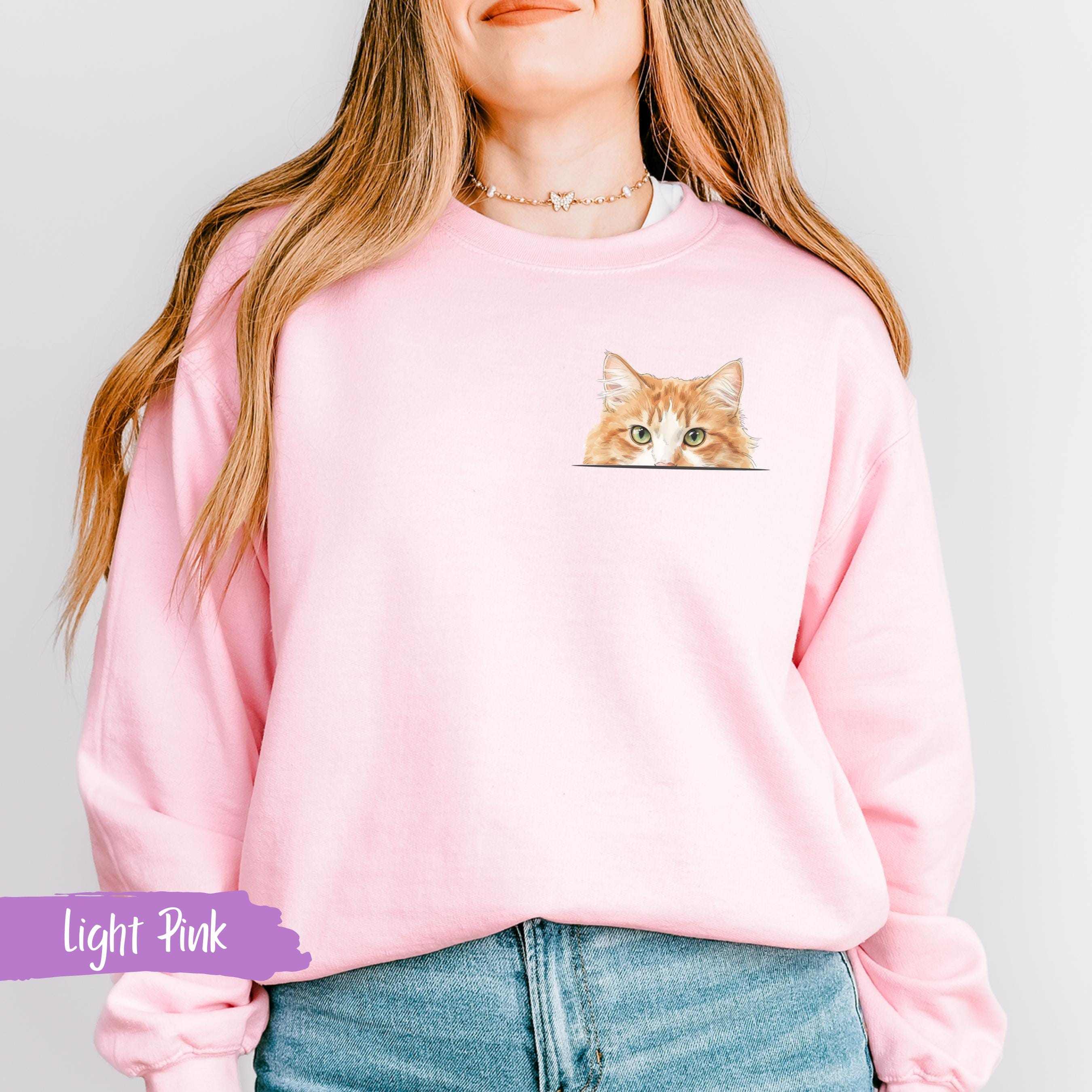Brighten your day with this Peaches & Cream orange cat pocket sweatshirt! Featuring an adorable orange-and-white kitty peeking out from the chest pocket area, this cozy pullover is equal parts playful and comfy. Perfect for cat moms, cat dads, and anyone who adores sweet tabby-style cats.