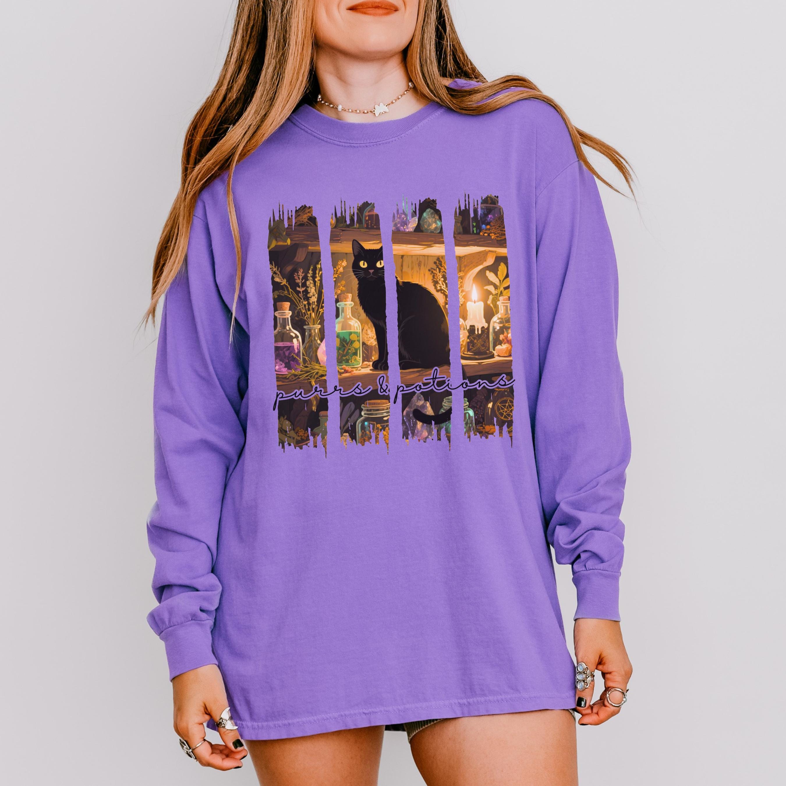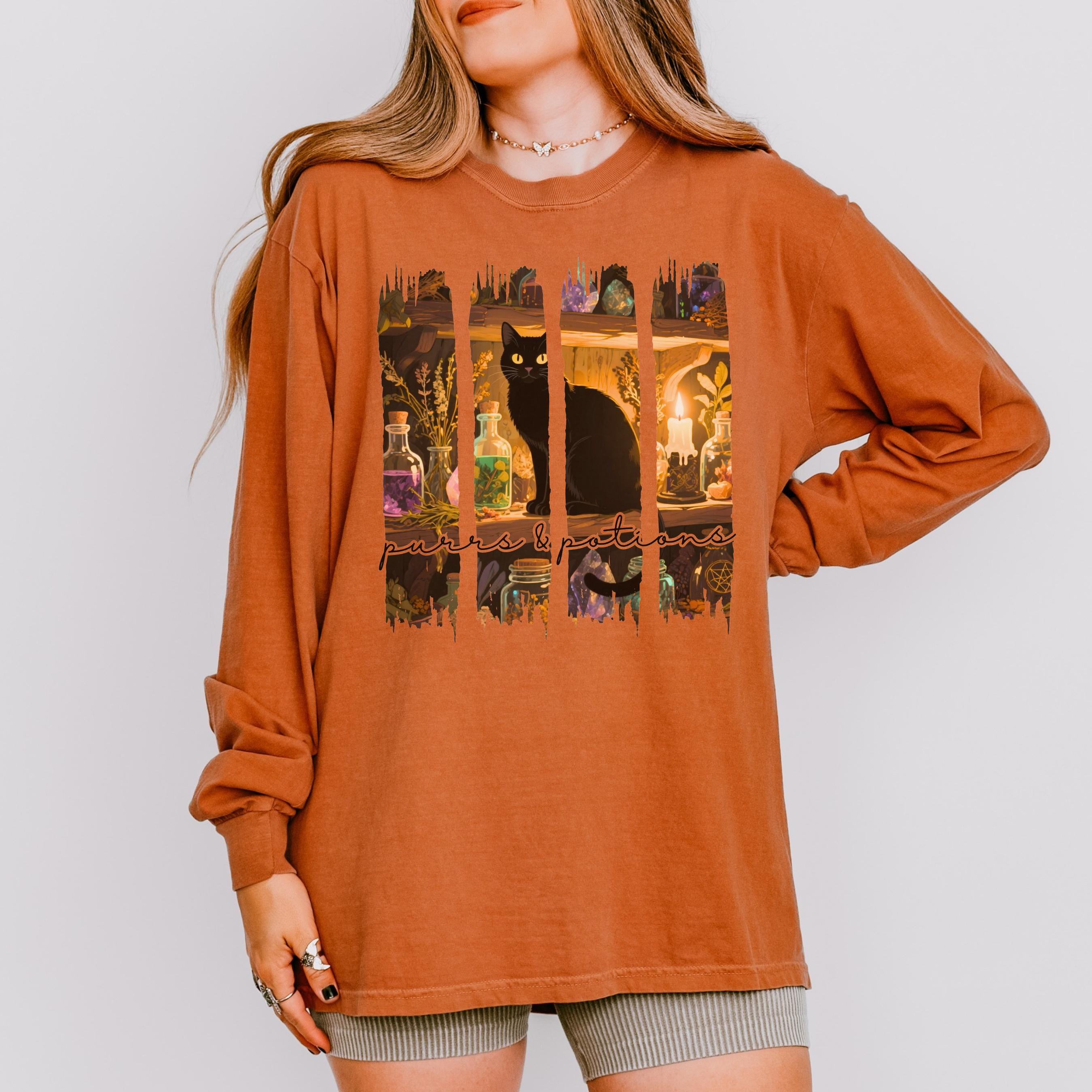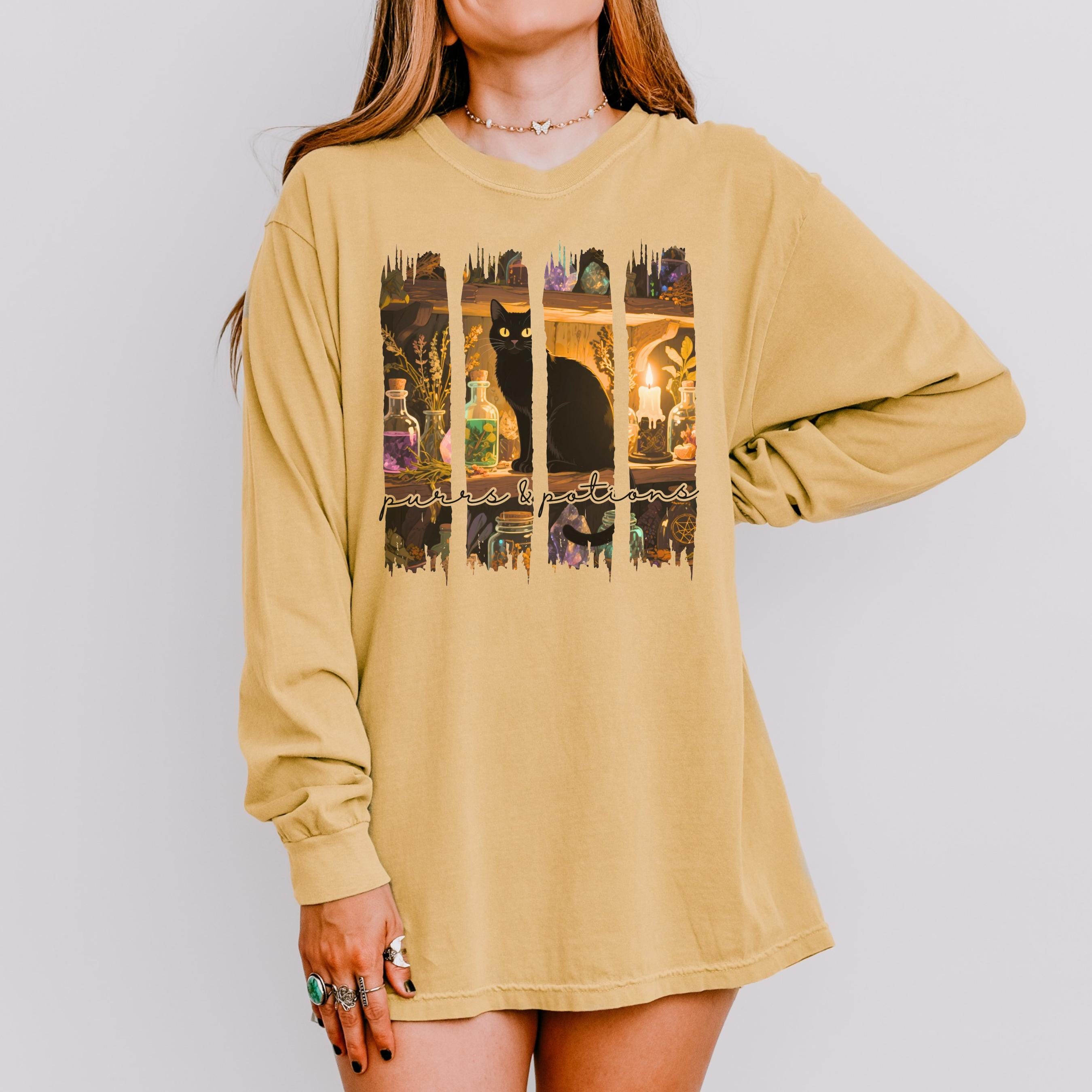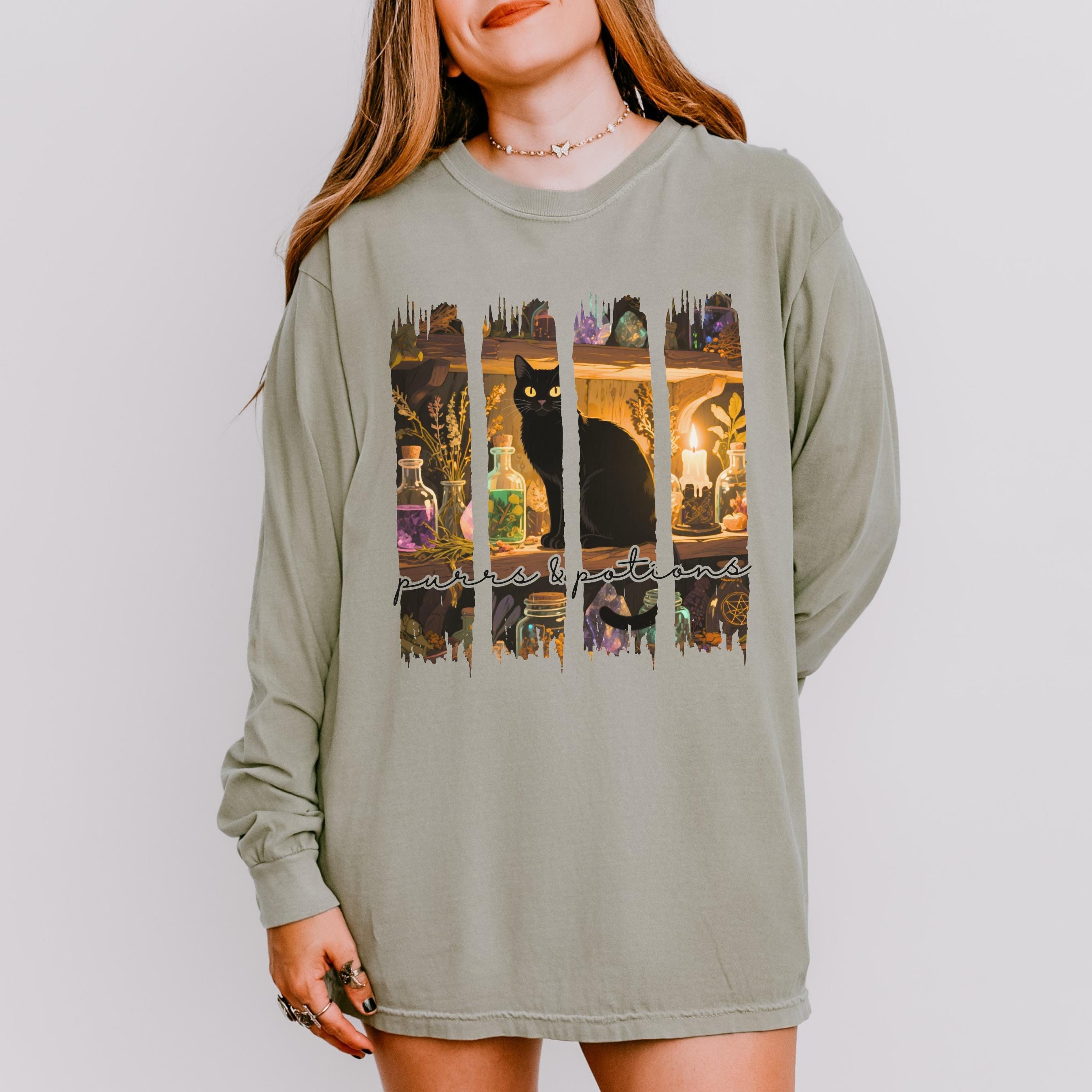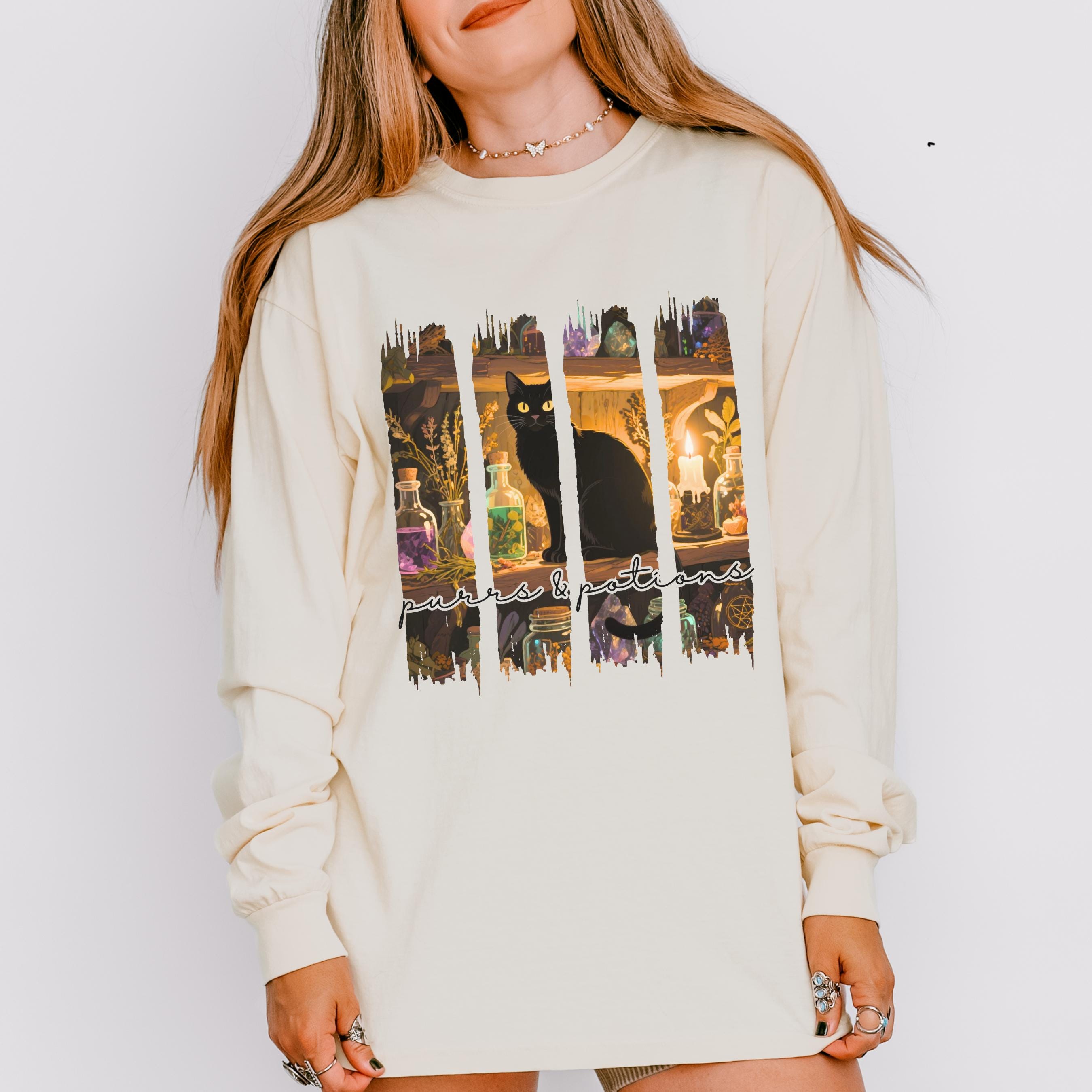 Mystical Witchy Black Cat Long Sleeve Shirt, Comfort Colors Tee, Potion Bottles Halloween Aesthetic, Cozy Witch Vibes Gift