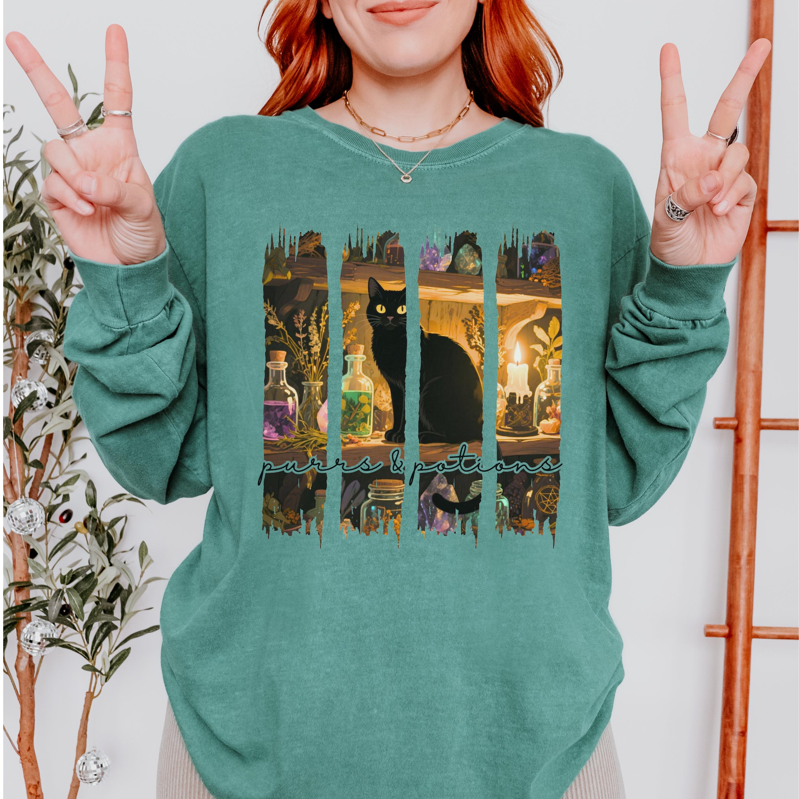 Bring a little magic to your wardrobe with this mystical “Purrs and Potions” long sleeve shirt. Featuring a witchy black cat surrounded by potion bottles and whimsical brushstroke accents, this design is perfect for cat lovers, cottagecore dreamers, and anyone who craves cozy witch vibes. Printed on the famously soft Comfort Colors long sleeve tee, it’s your new go-to for effortless style and comfort.