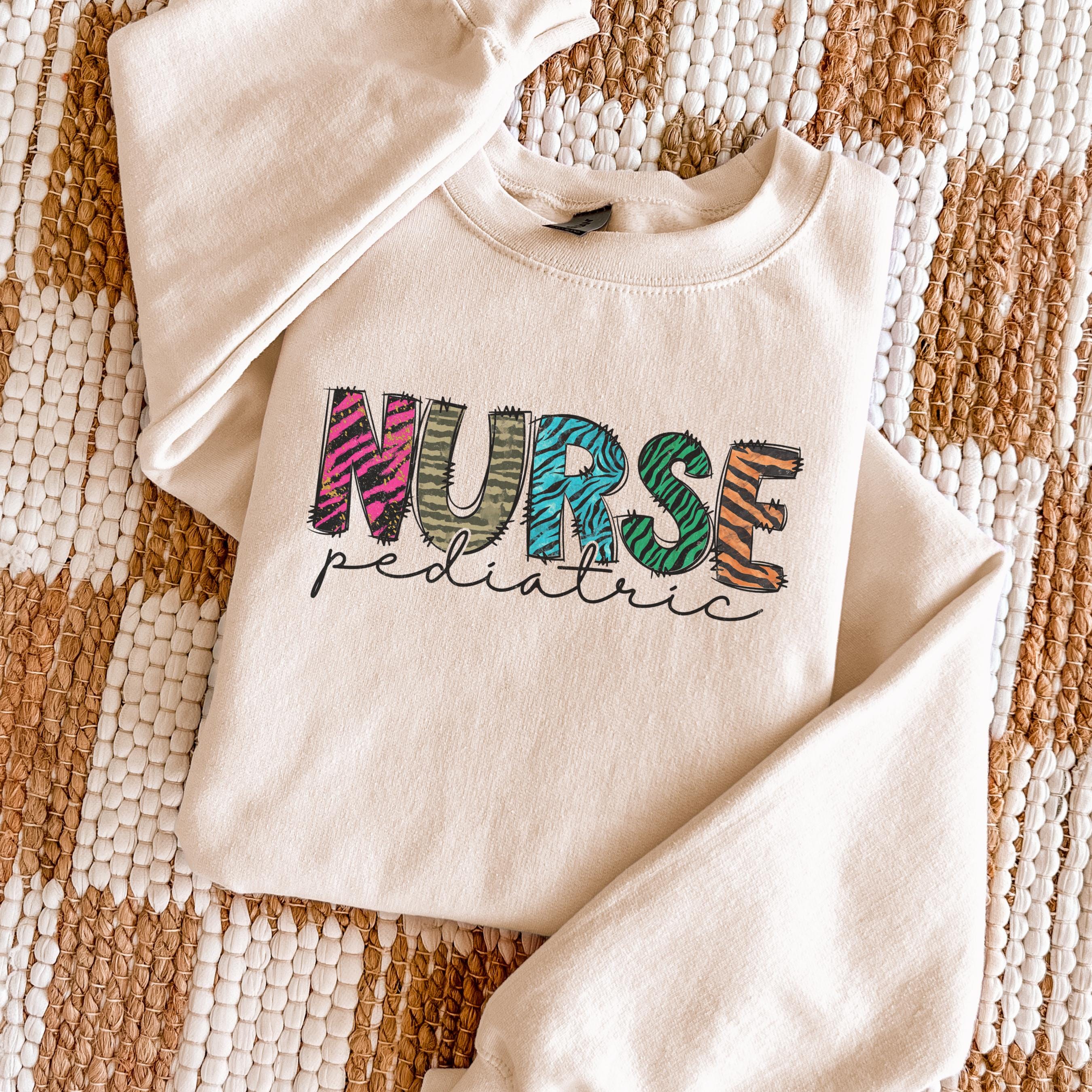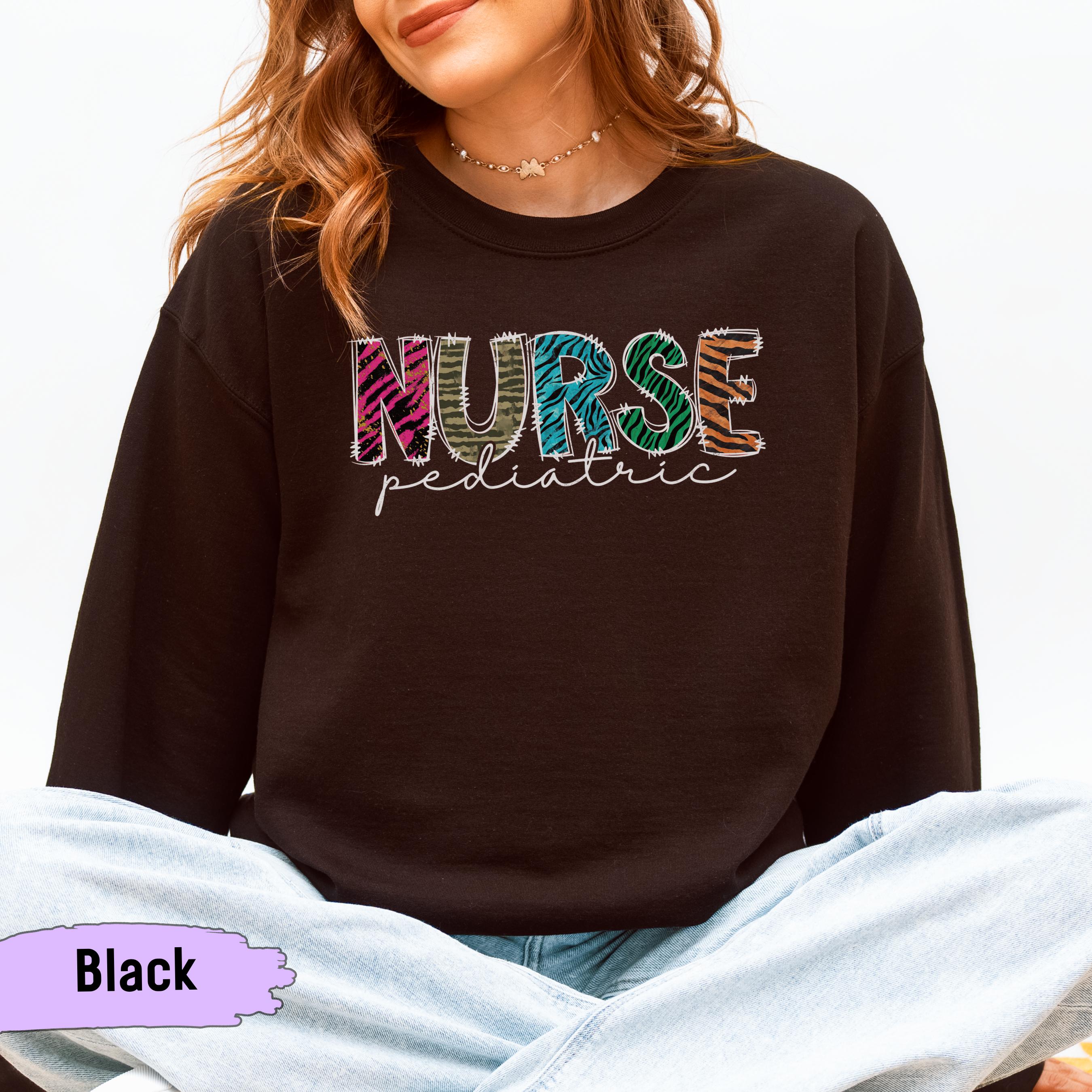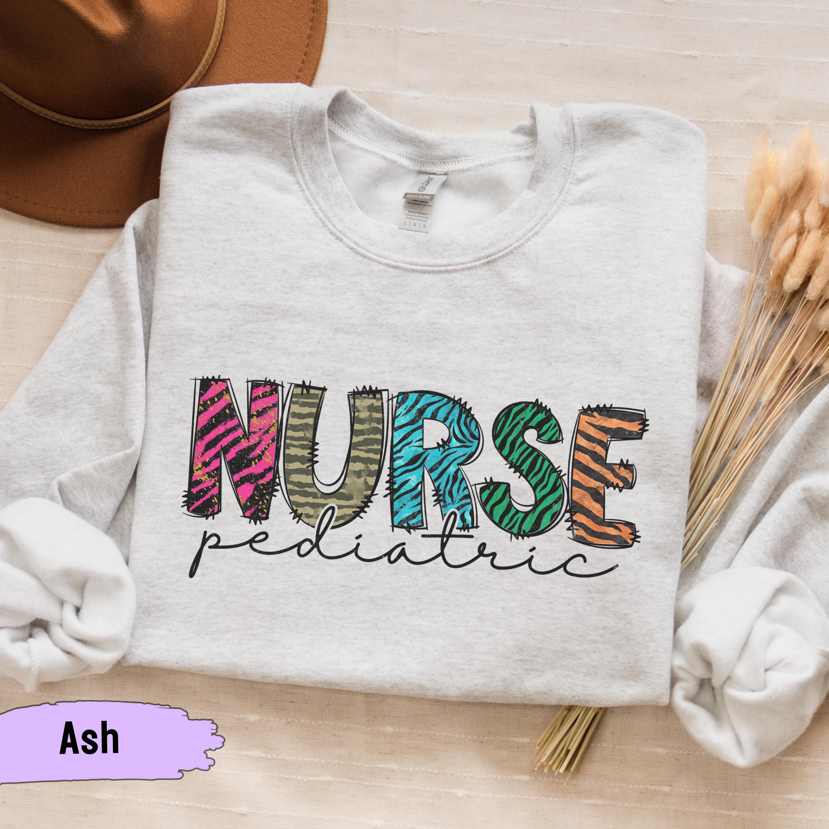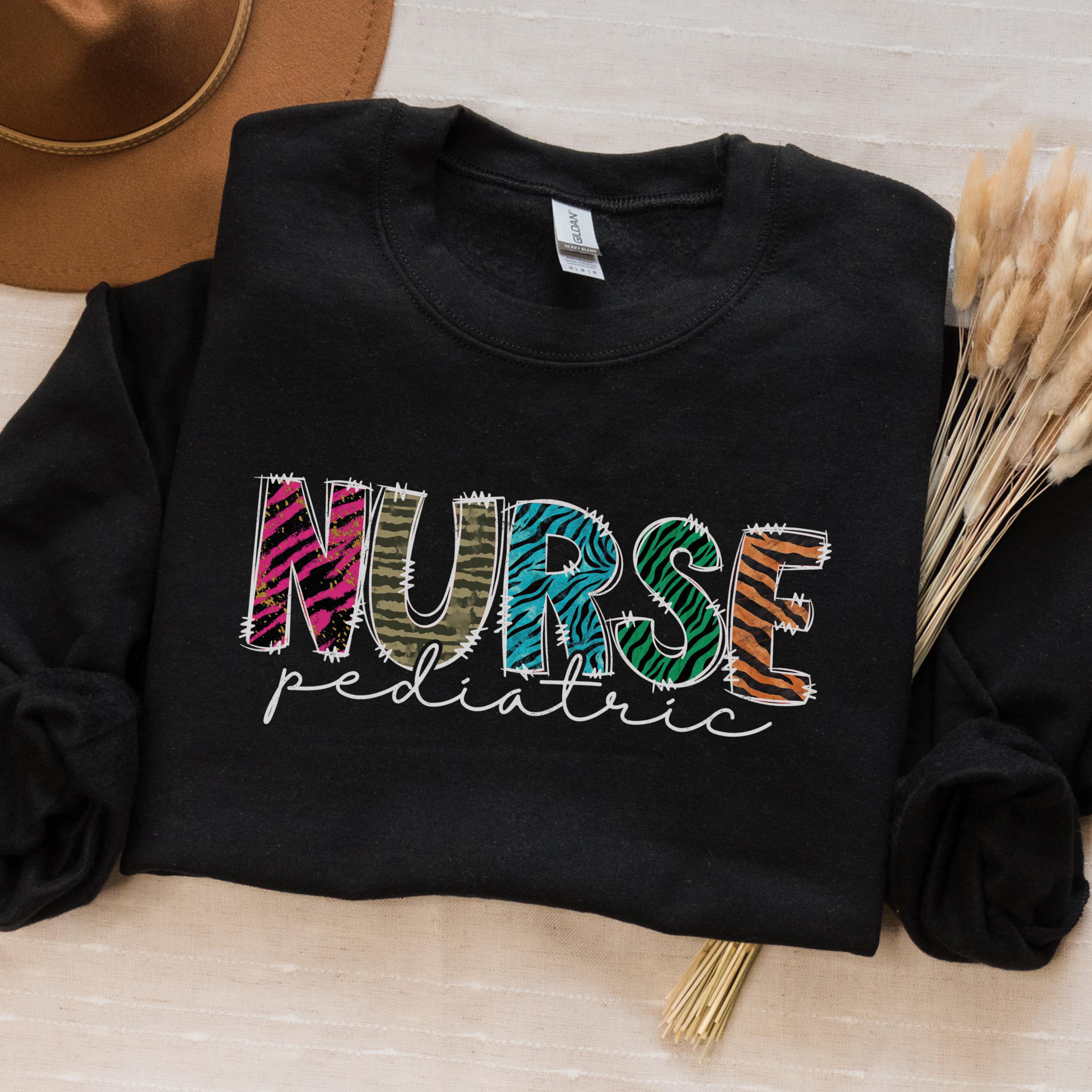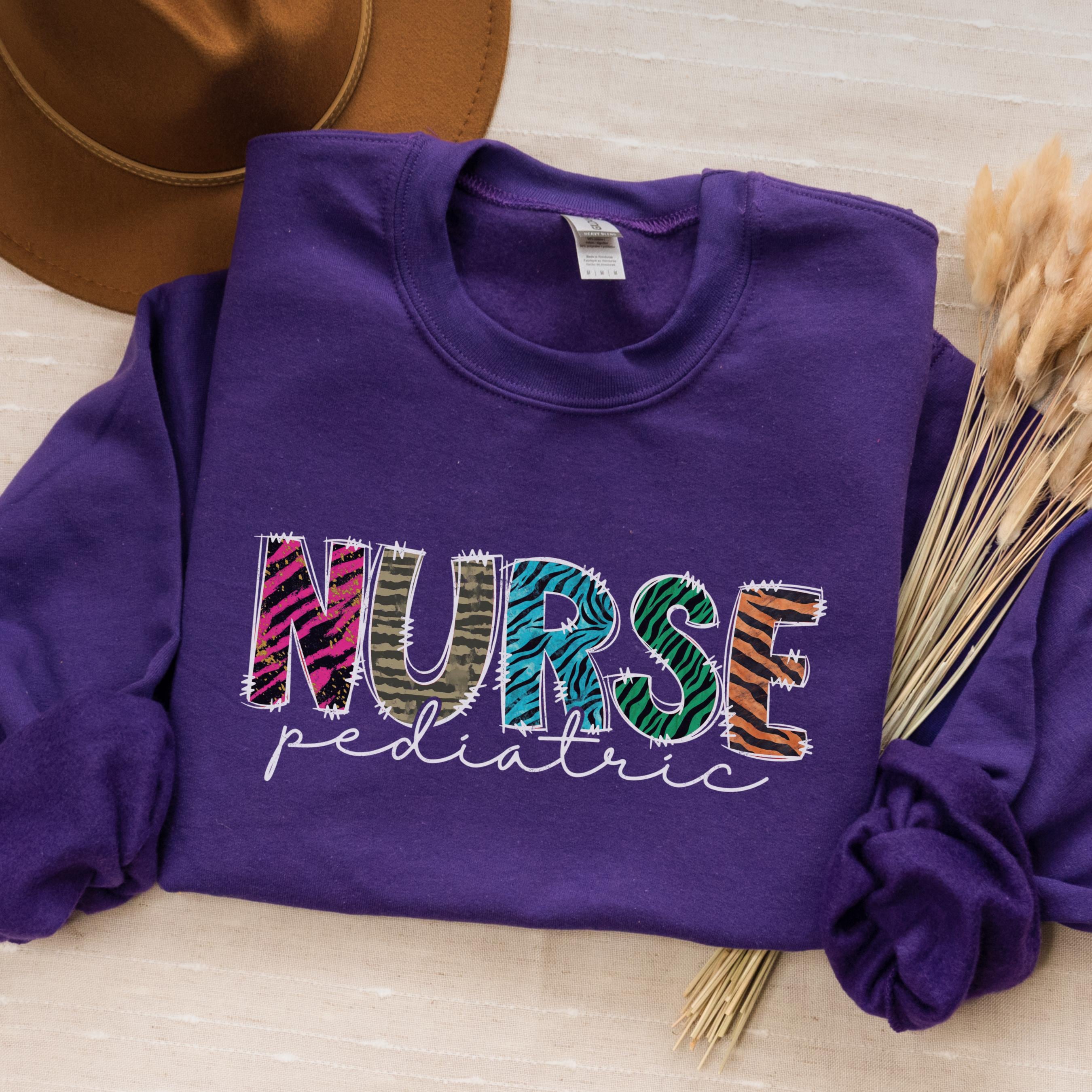 Pediatric Nurse Sweatshirt, Colorful Doodle Font Tiger Stripes Design, Cute Nurse Crewneck