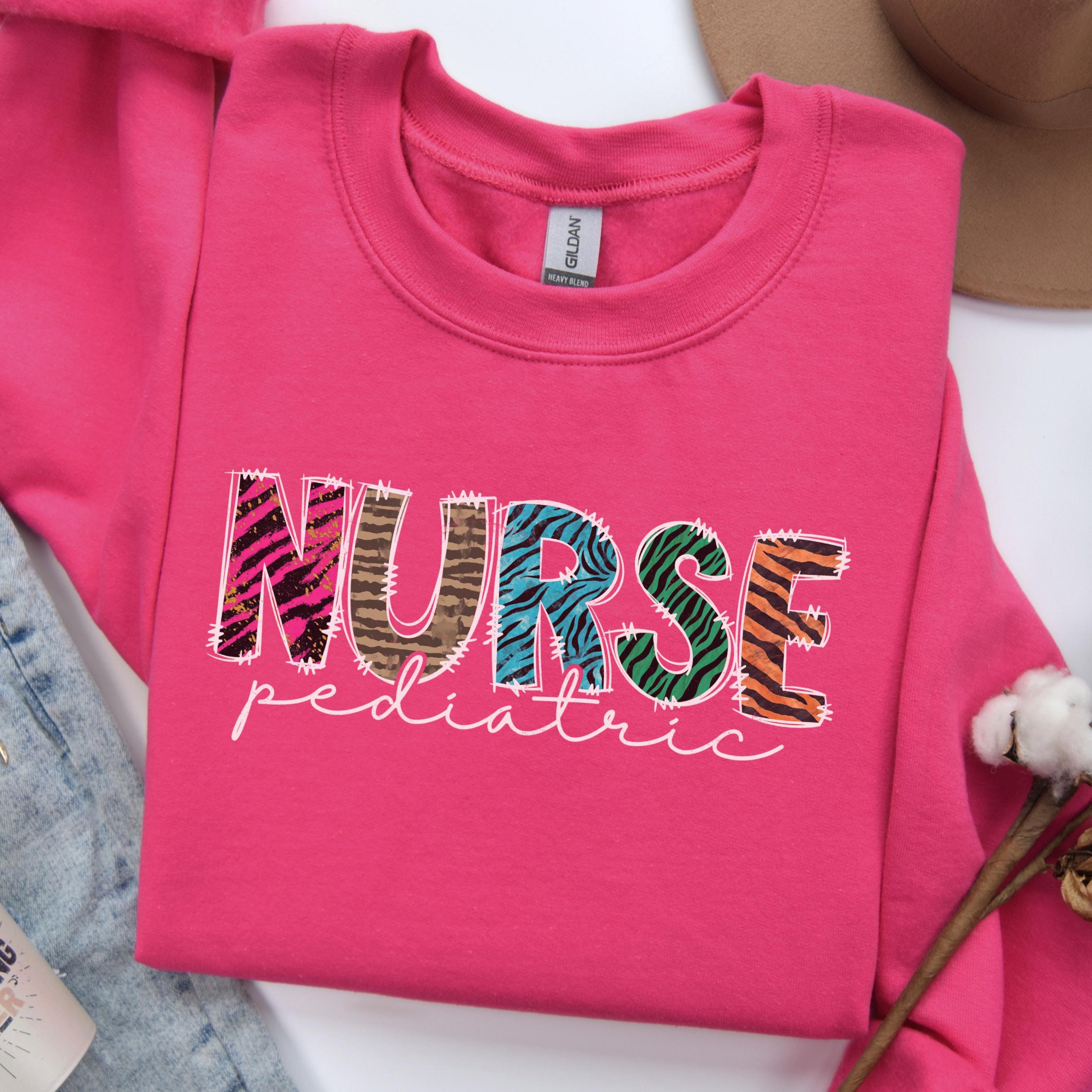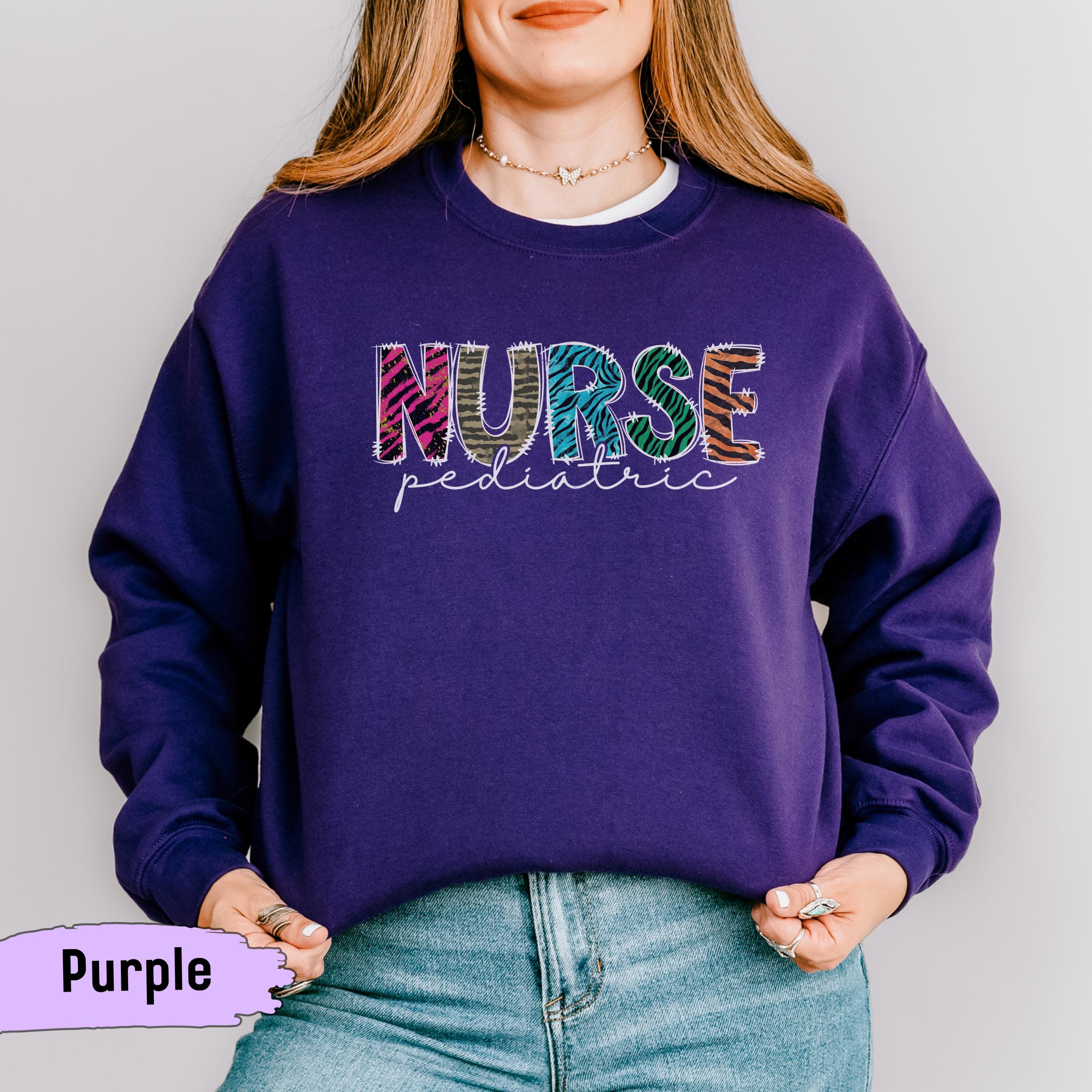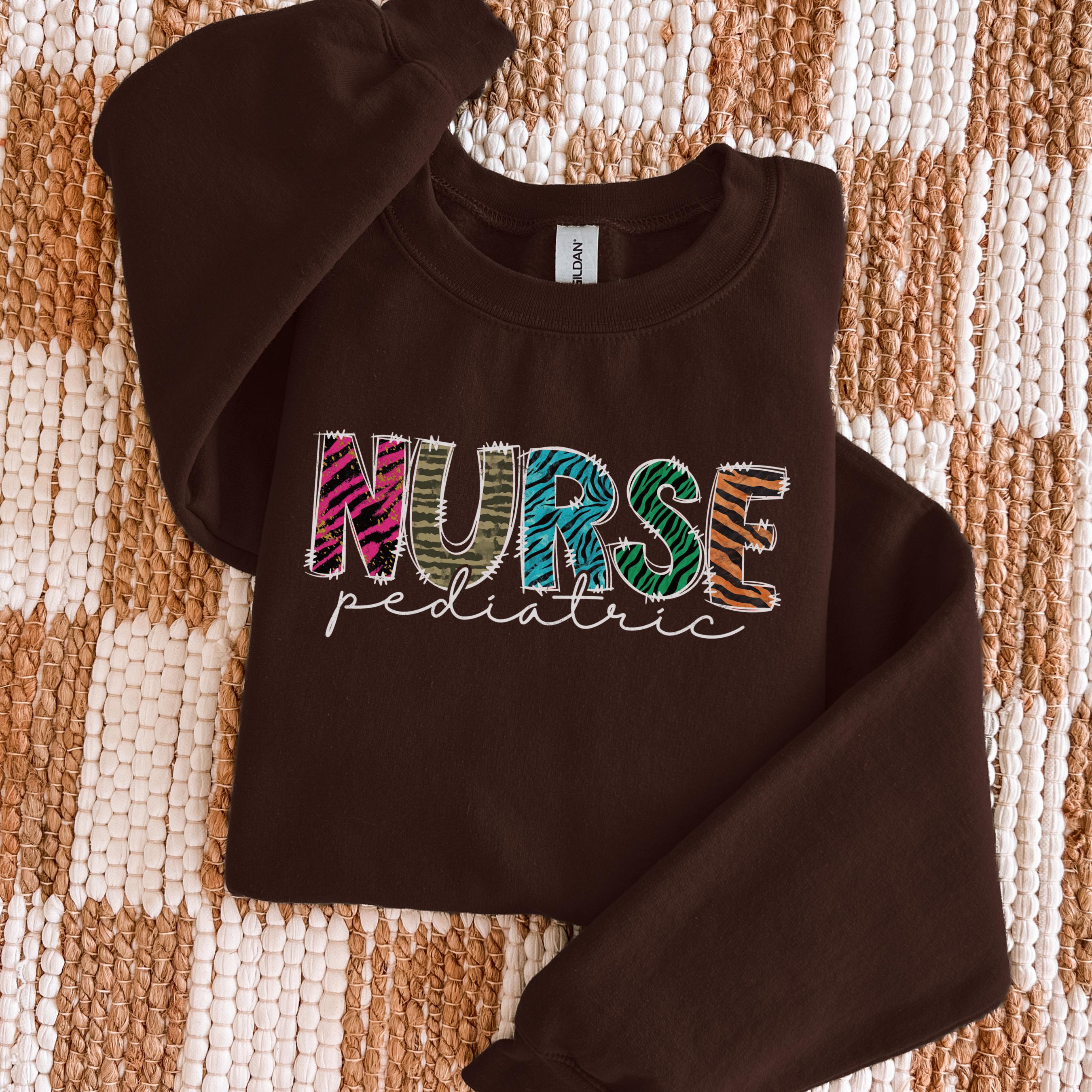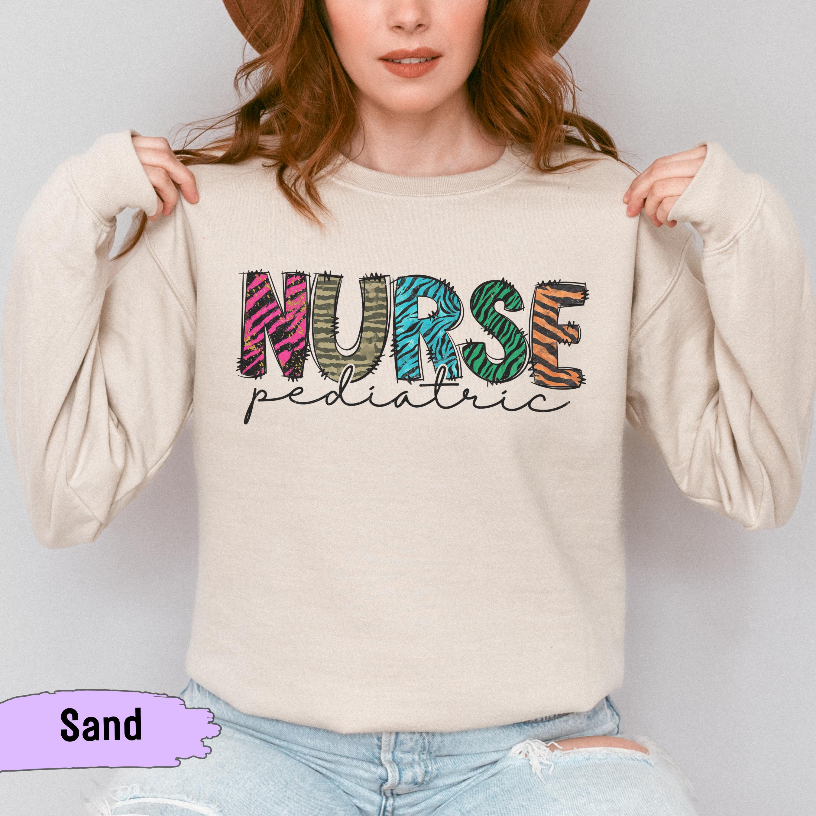 Pediatric Nurse Sweatshirt, Colorful Doodle Font Tiger Stripes Design, Cute Nurse Crewneck
