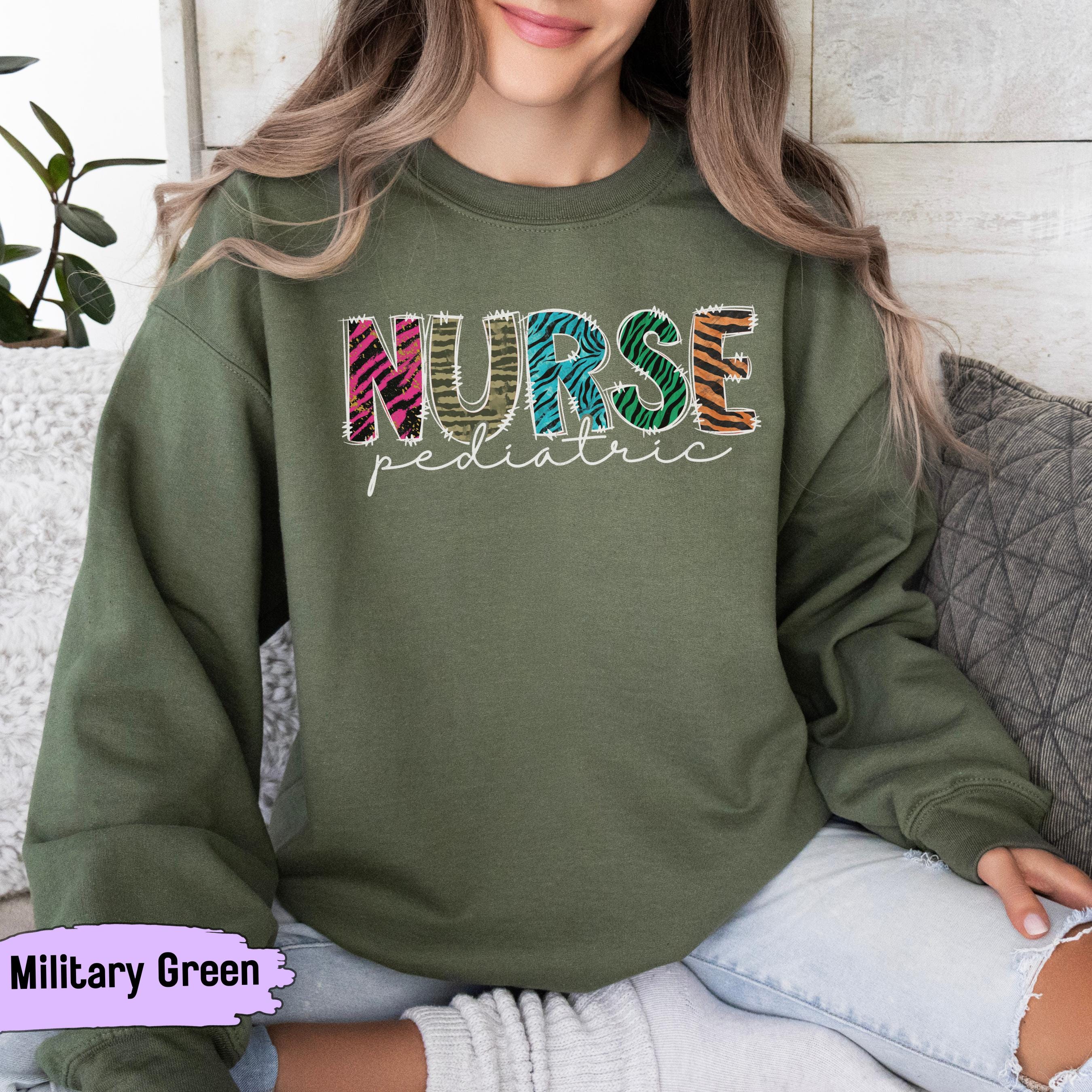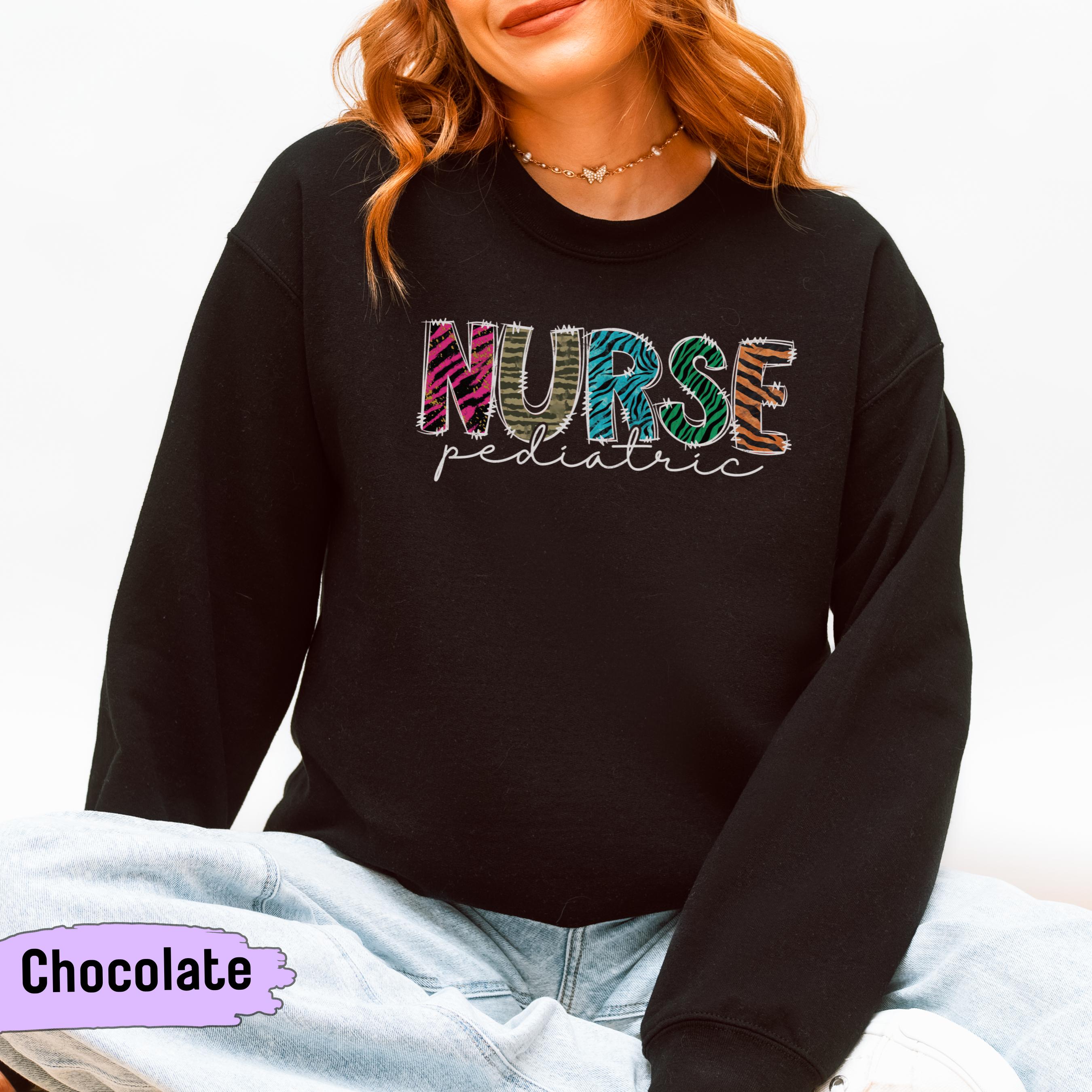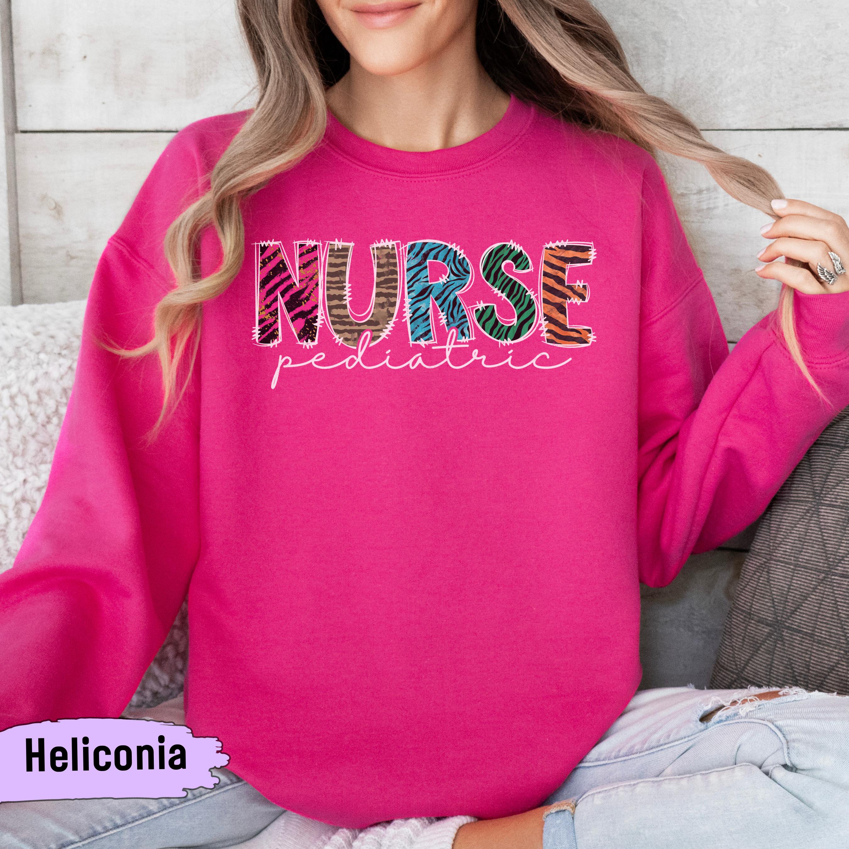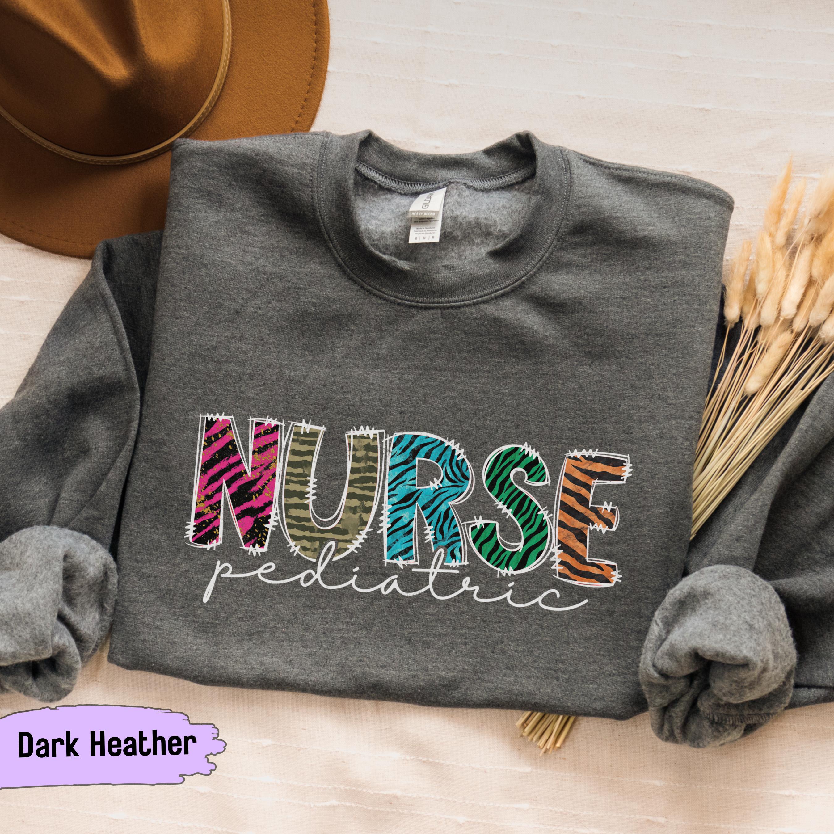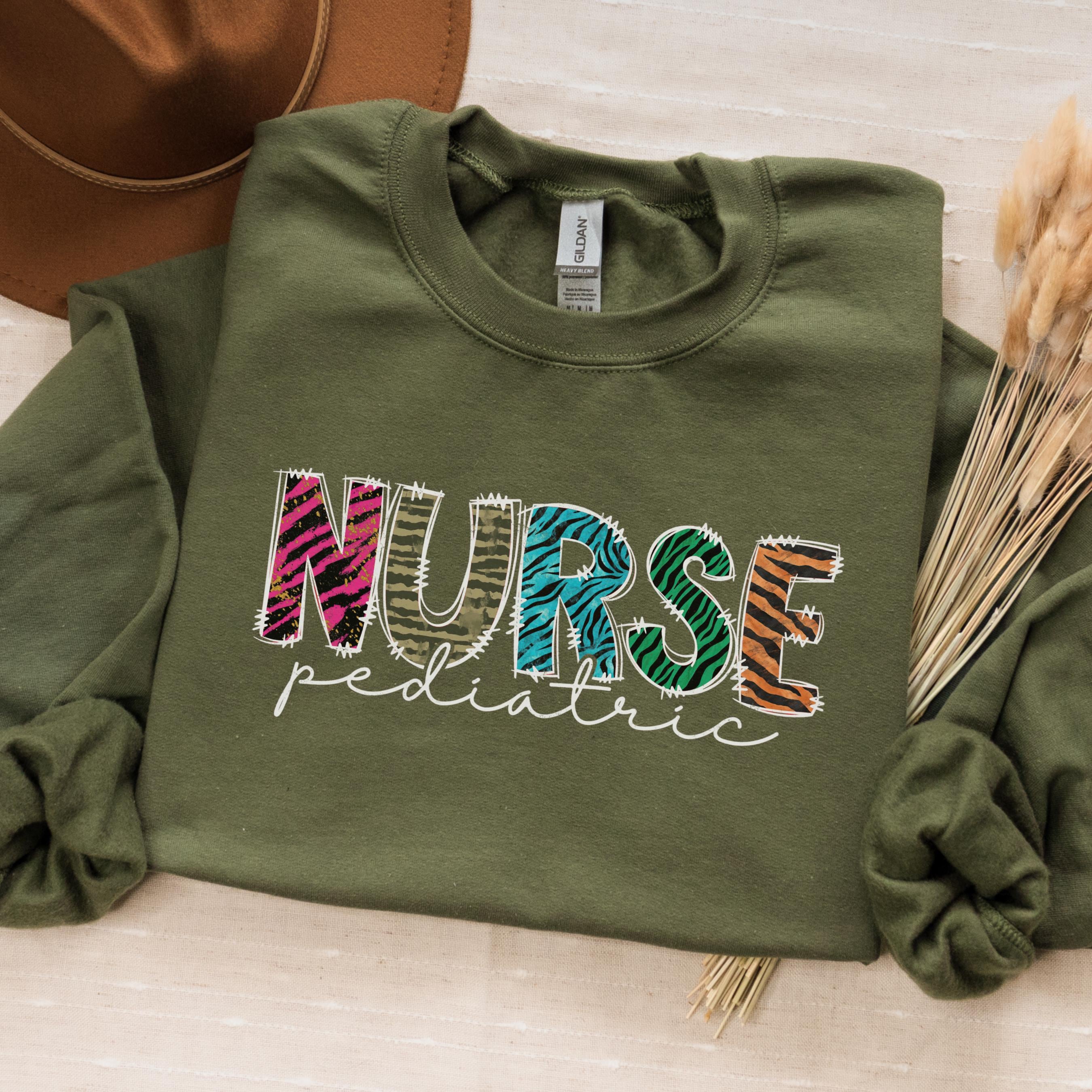 Pediatric Nurse Sweatshirt, Colorful Doodle Font Tiger Stripes Design, Cute Nurse Crewneck