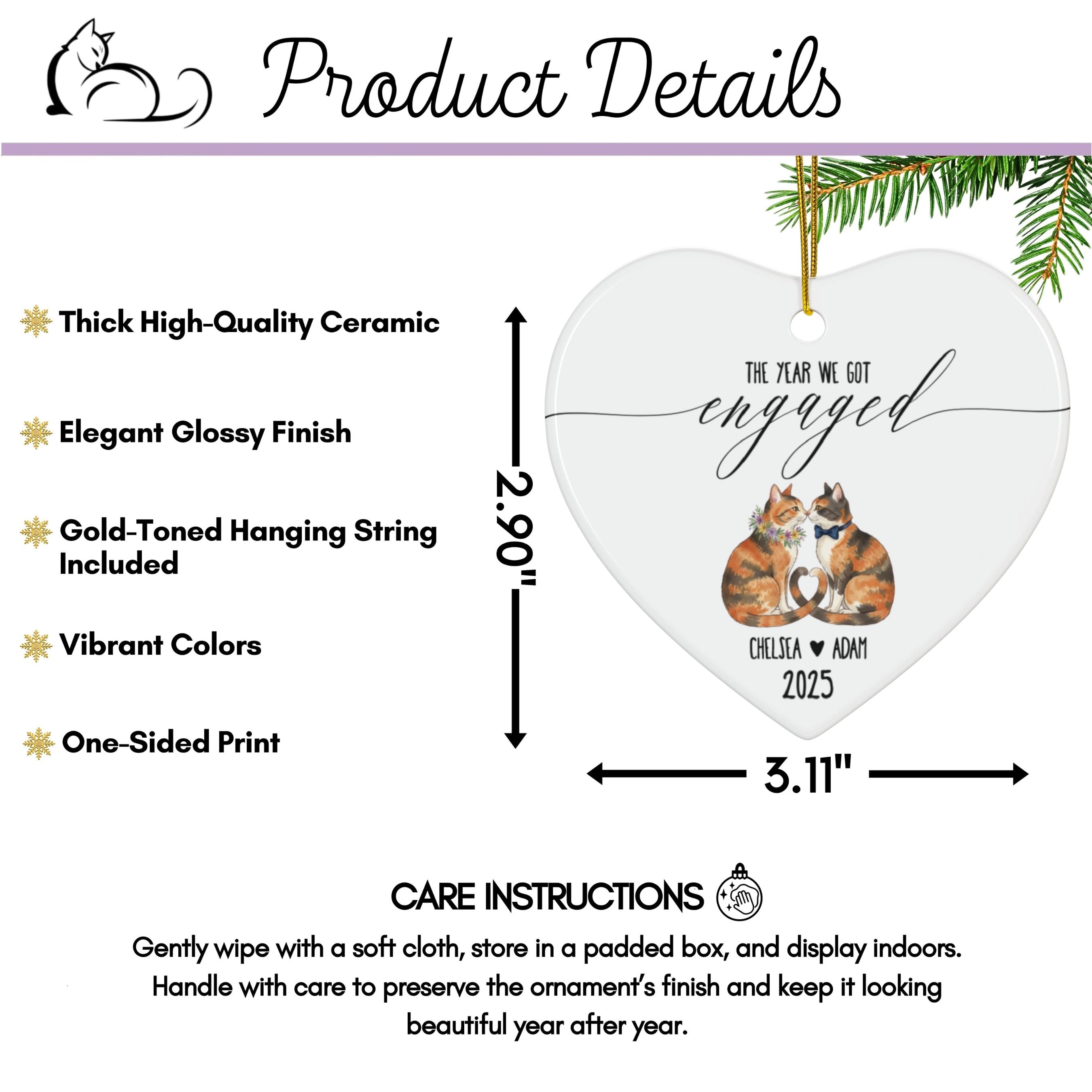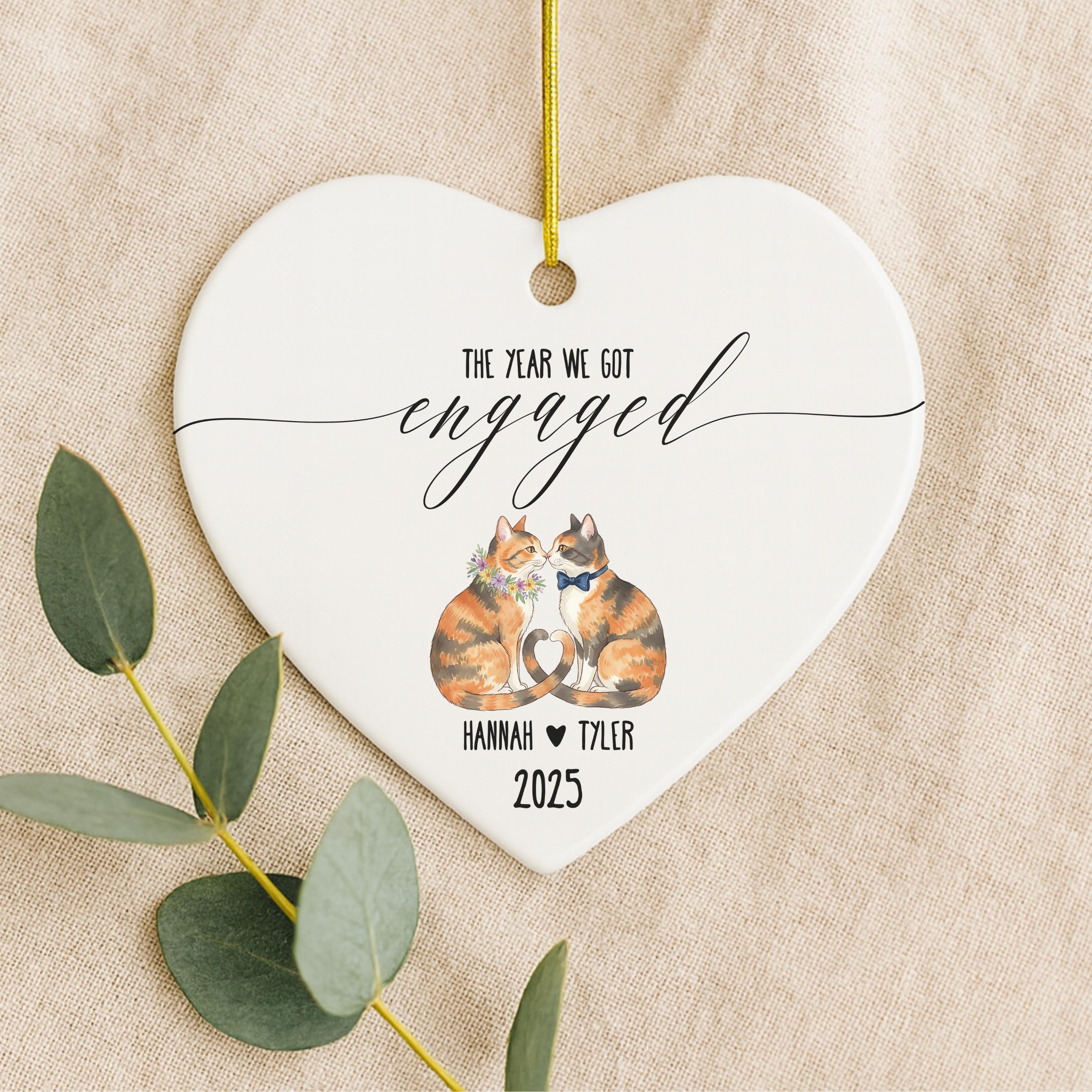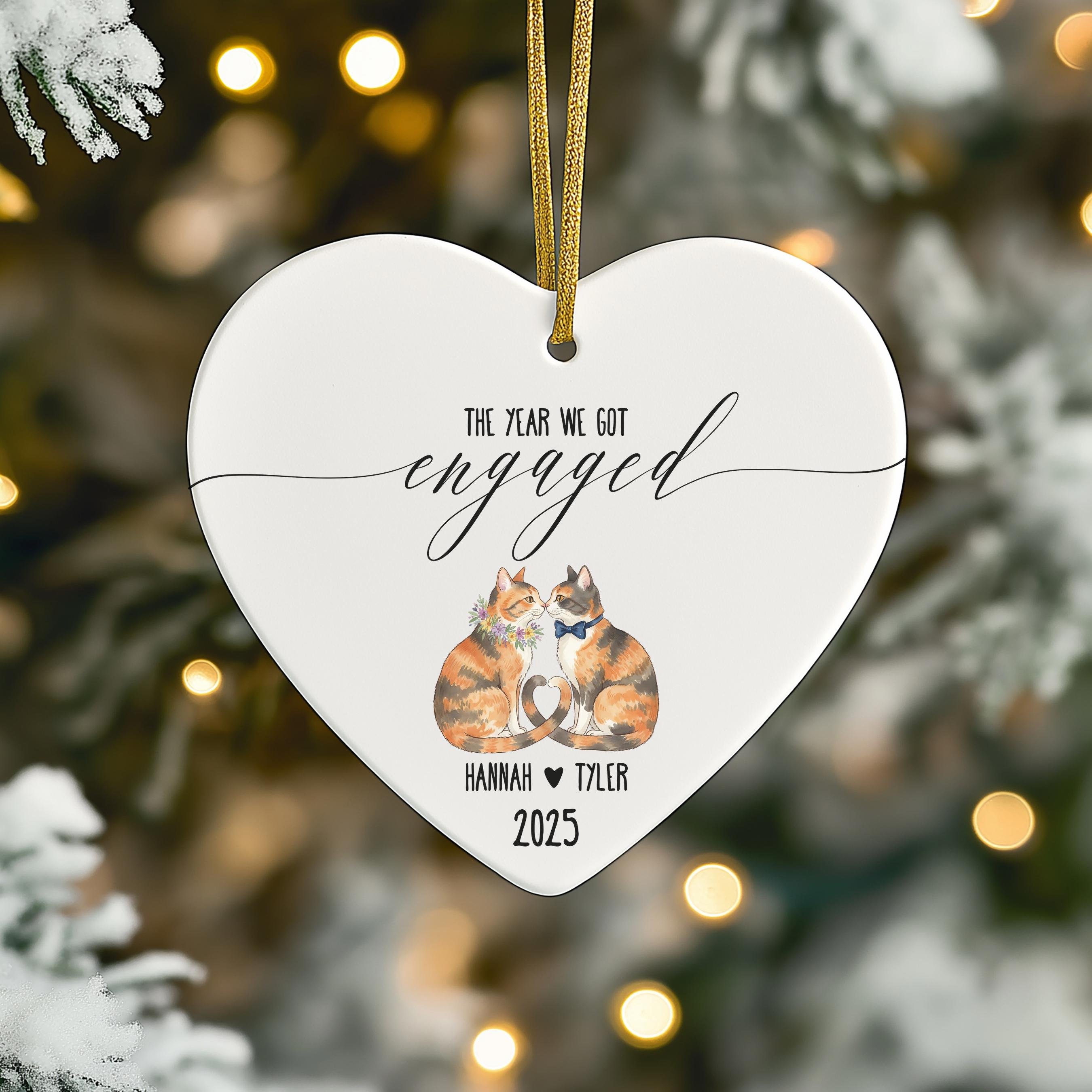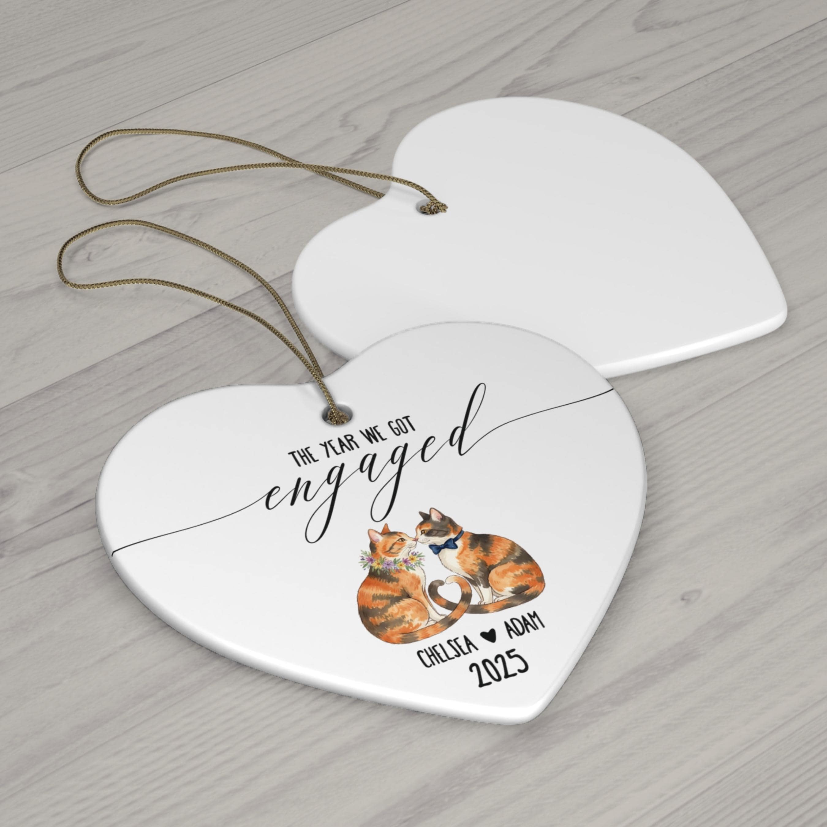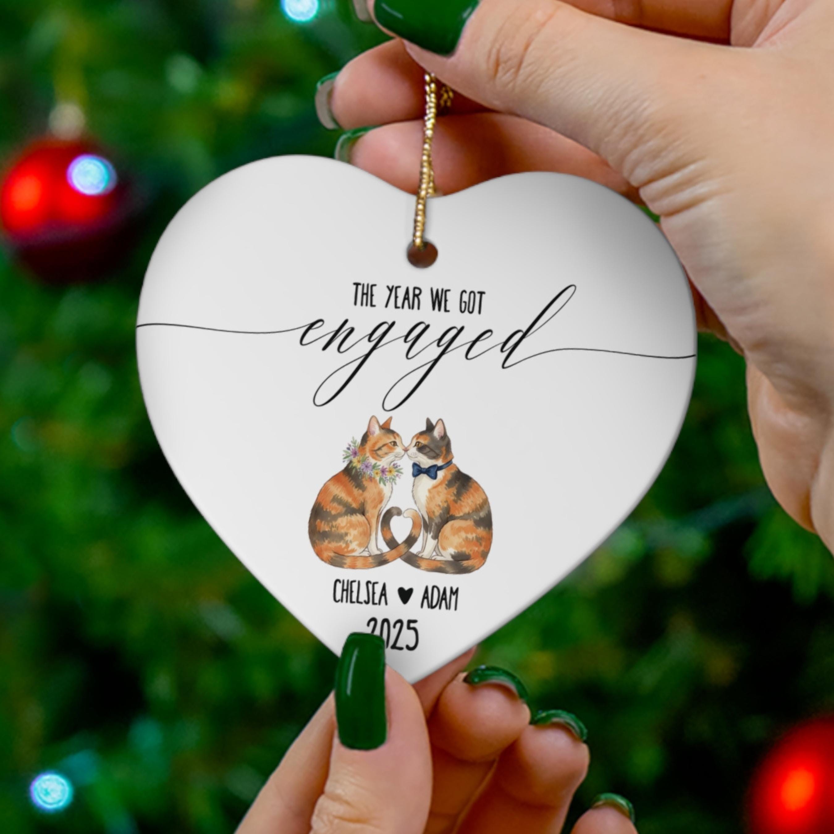This heart-shaped ceramic ornament is the purr-fect keepsake for engaged couples who share their home (and hearts) with two cuddly cats. Featuring a tender moment between two Tortoiseshell cats, it captures the cozy, committed energy of your feline family—and your forever love. Whether it’s a proposal gift, an engagement celebration, or just a little “we said yes” memory, this ornament is pawsitively adorable.