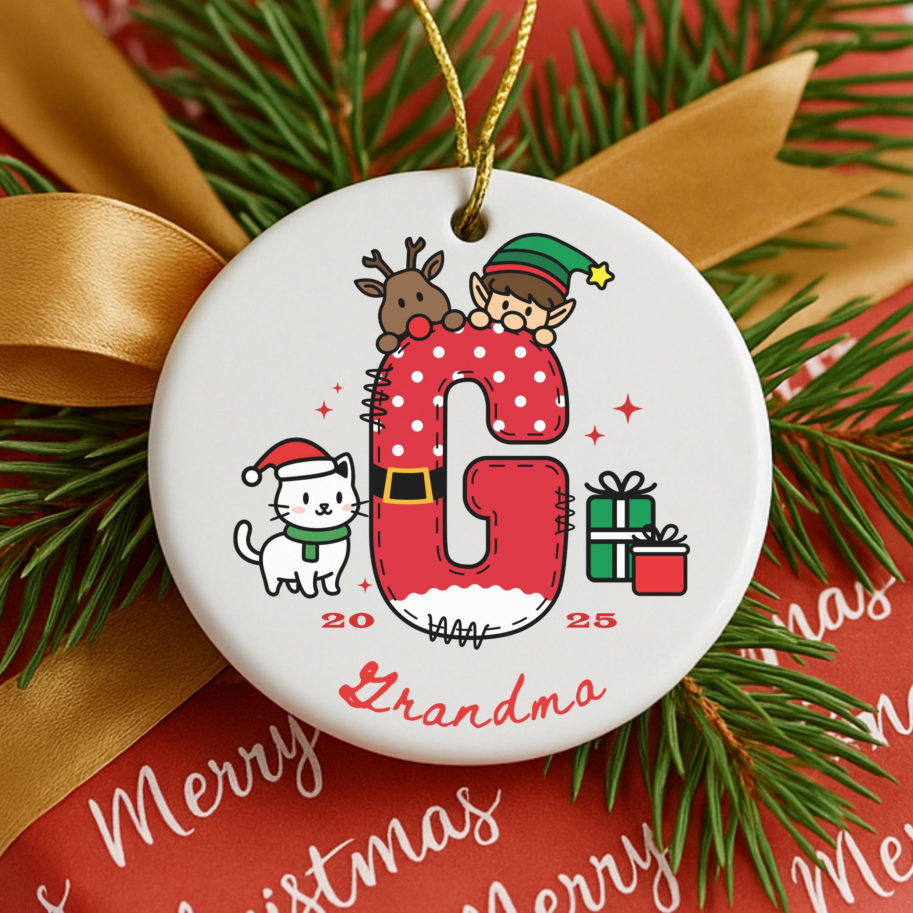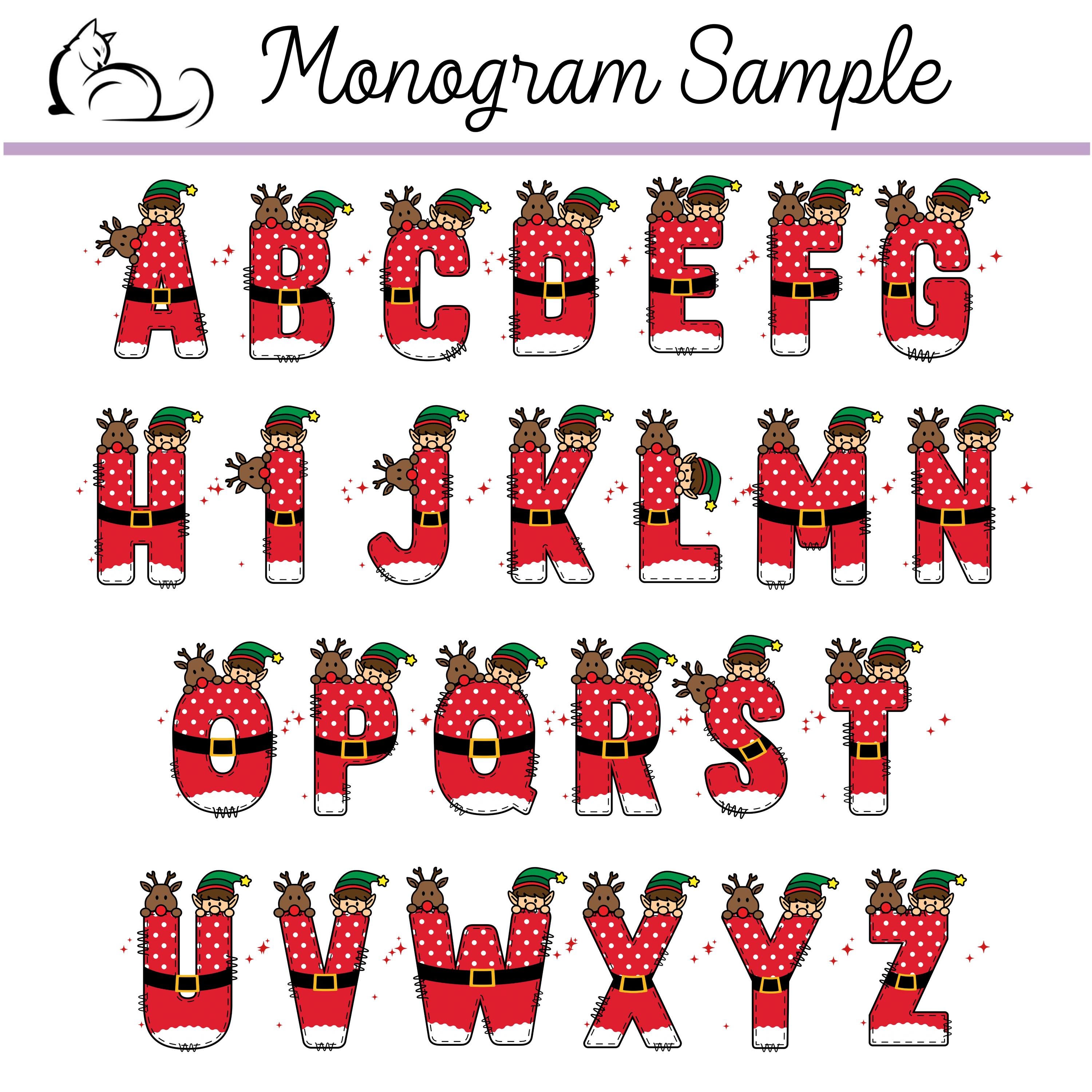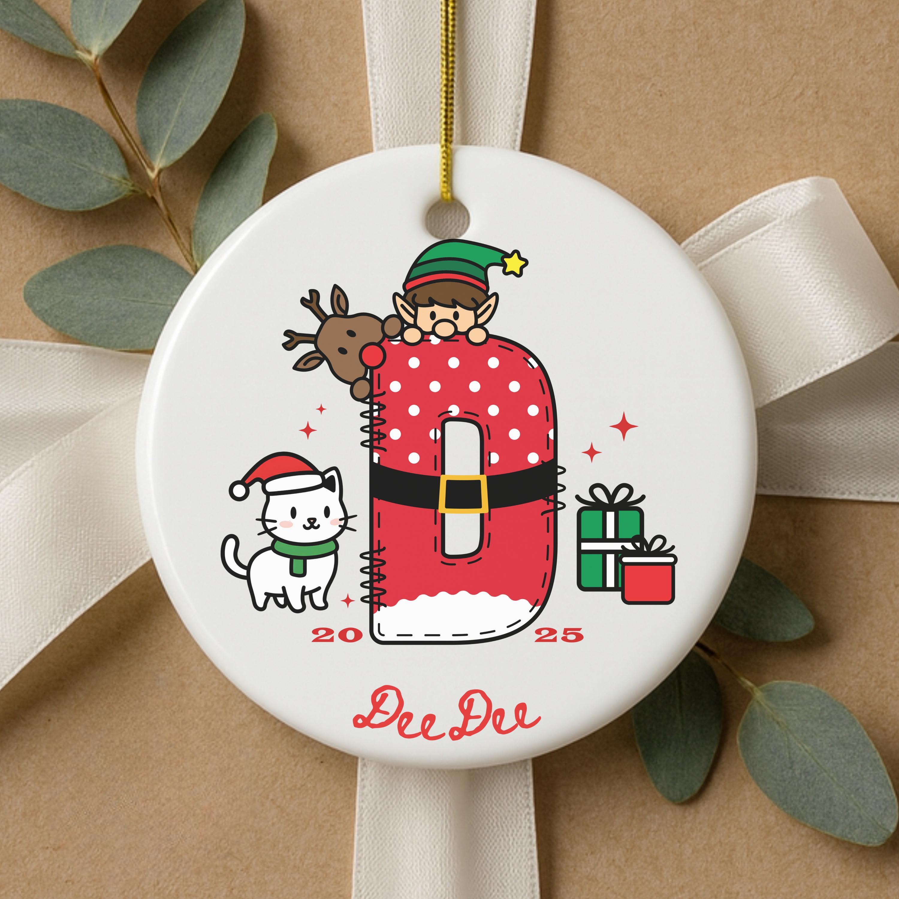 Personalized Christmas Ornament: Santa Monogram with Cat, Reindeer & Elf