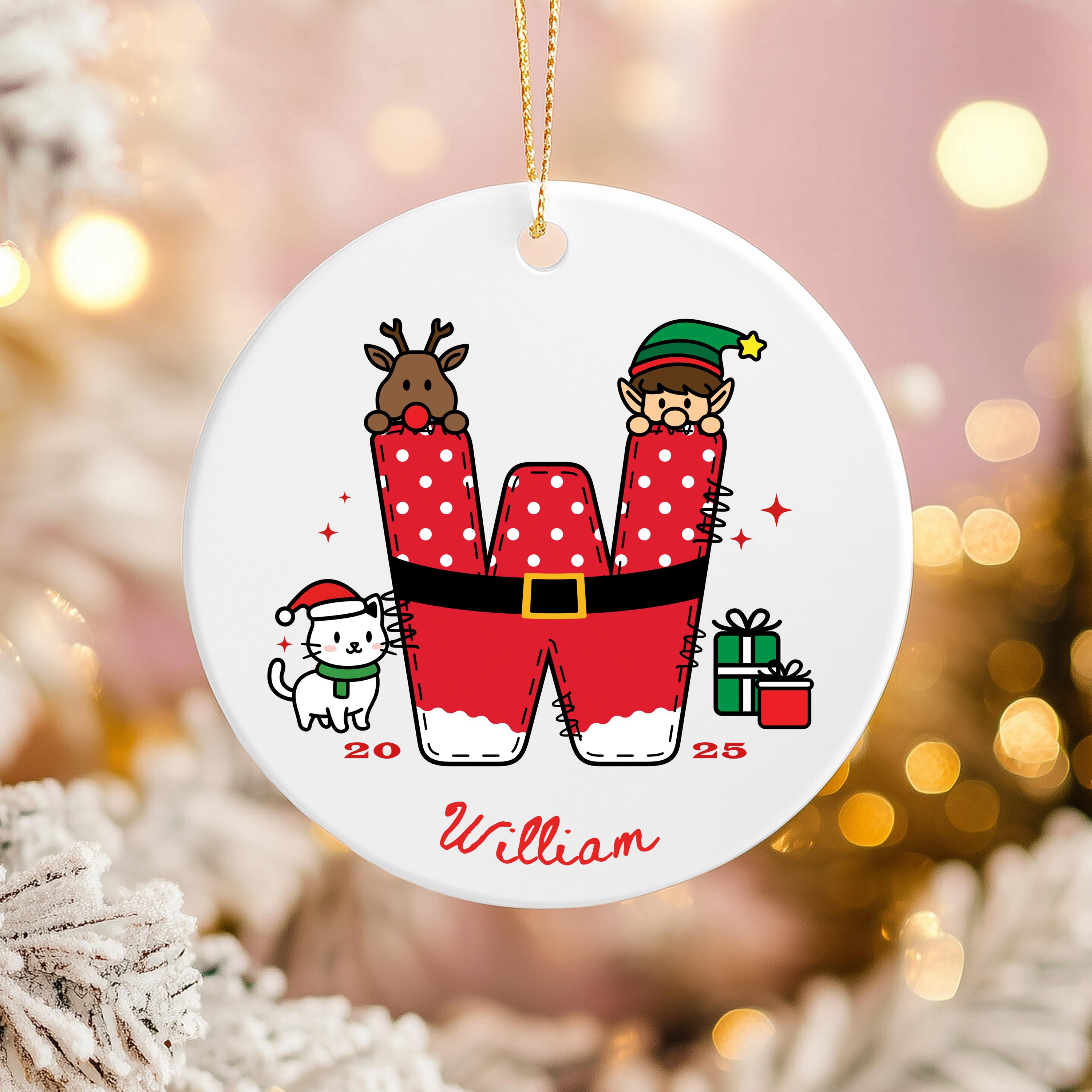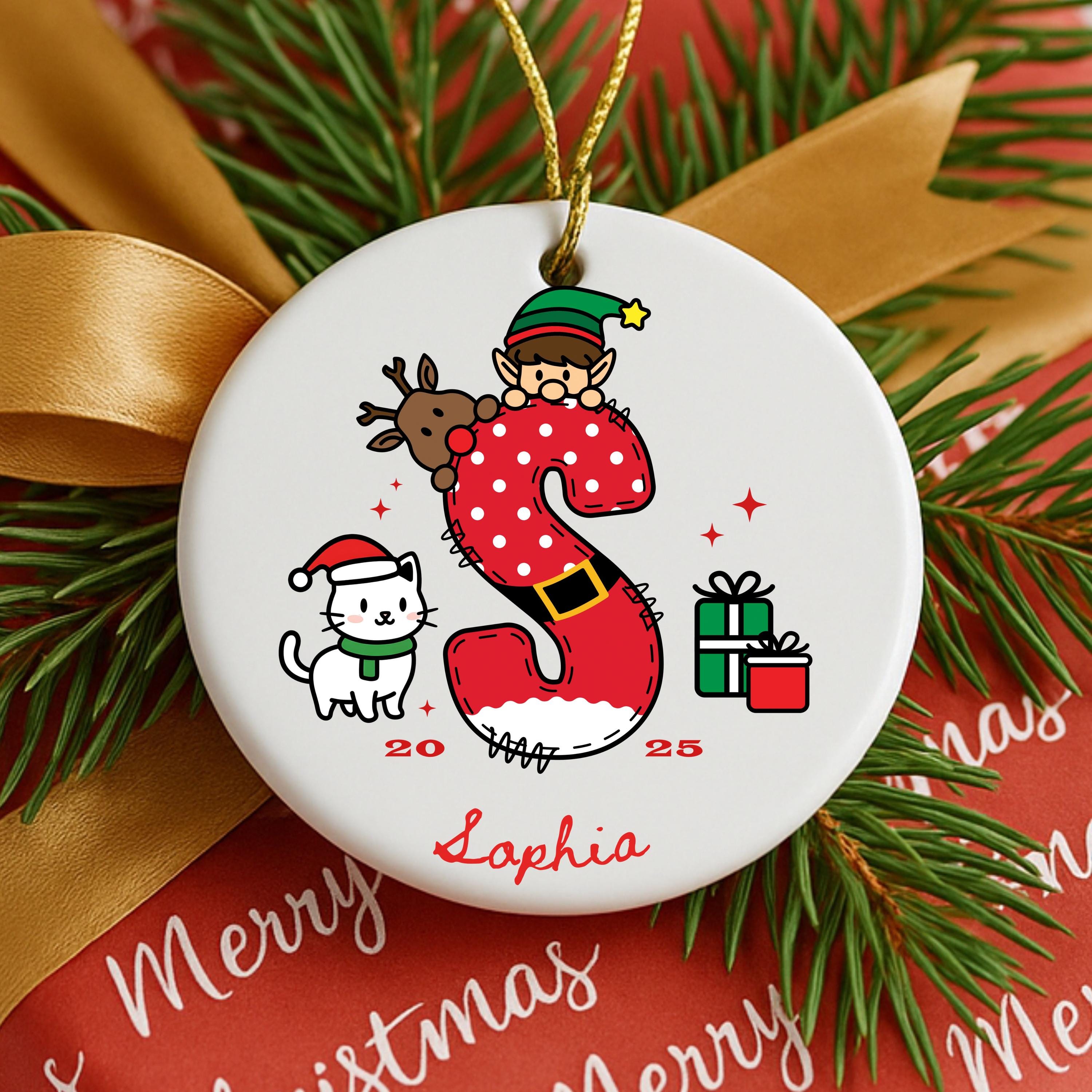 Add a sprinkle of Christmas magic to your tree with this Personalized Santa Monogram Ornament, featuring a cute Christmas cat, reindeer, elf, and gifts — all wrapped around your custom name! A keepsake-worthy addition to your holiday decor or the perfect small gift that spreads cheer year after year.