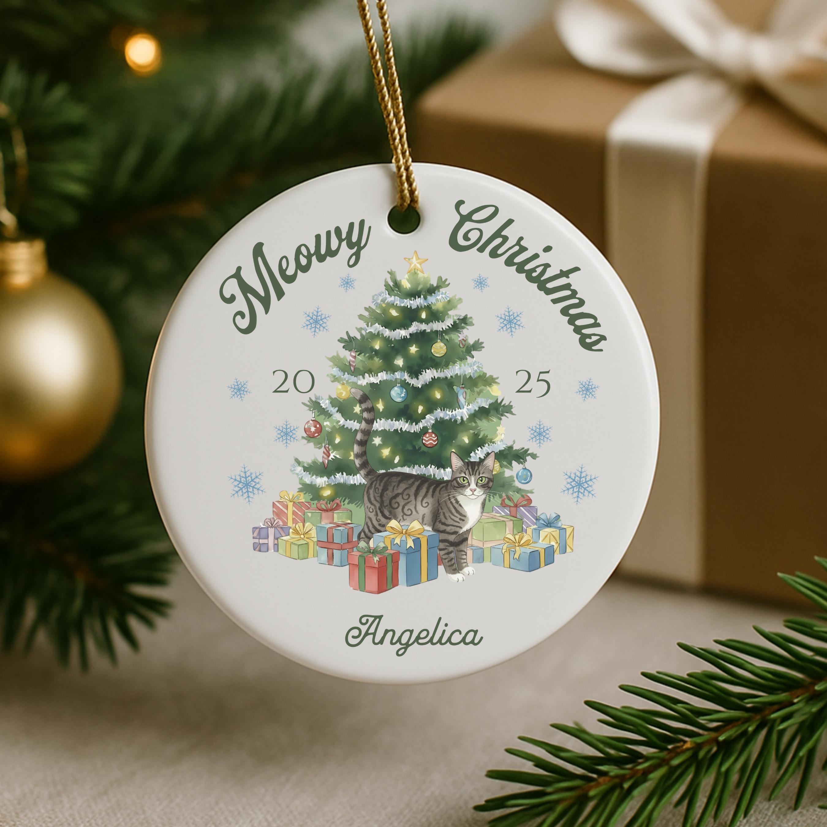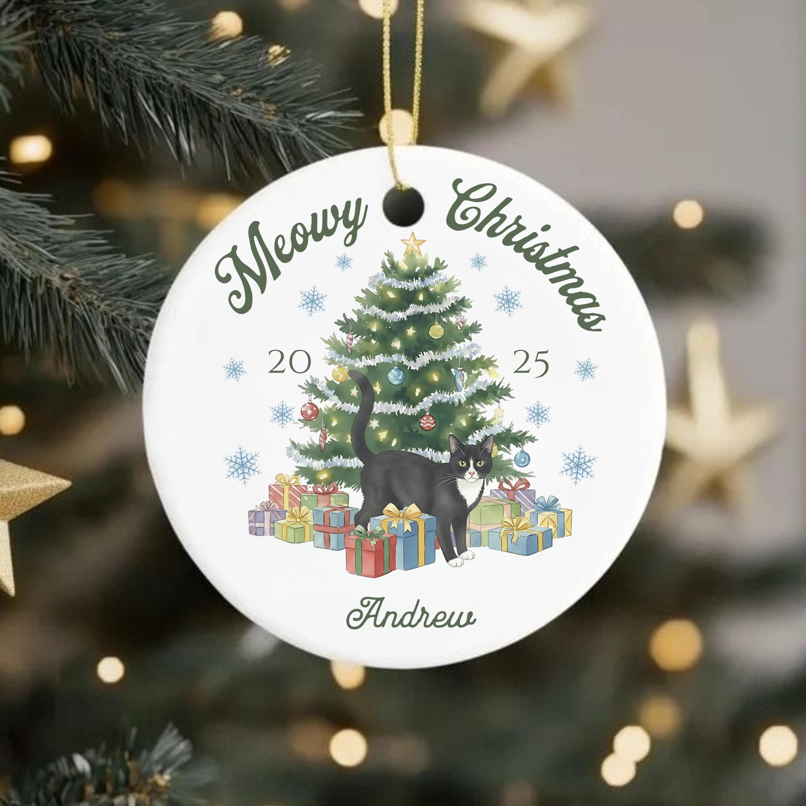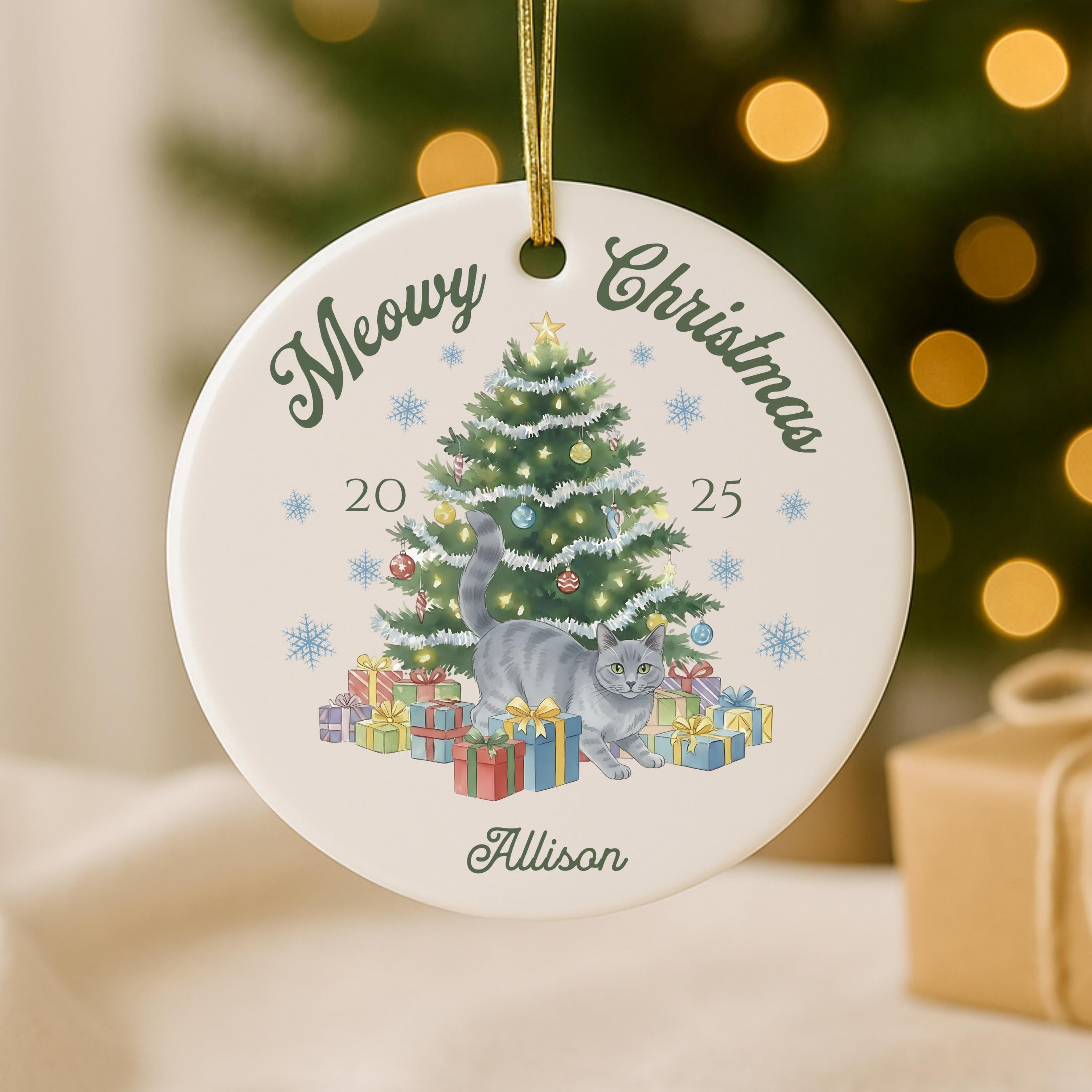 Celebrate your furry friend in festive style with our personalized Meowy Christmas ceramic ornament! Choose your cat type and add a name for the purr-fect holiday keepsake.