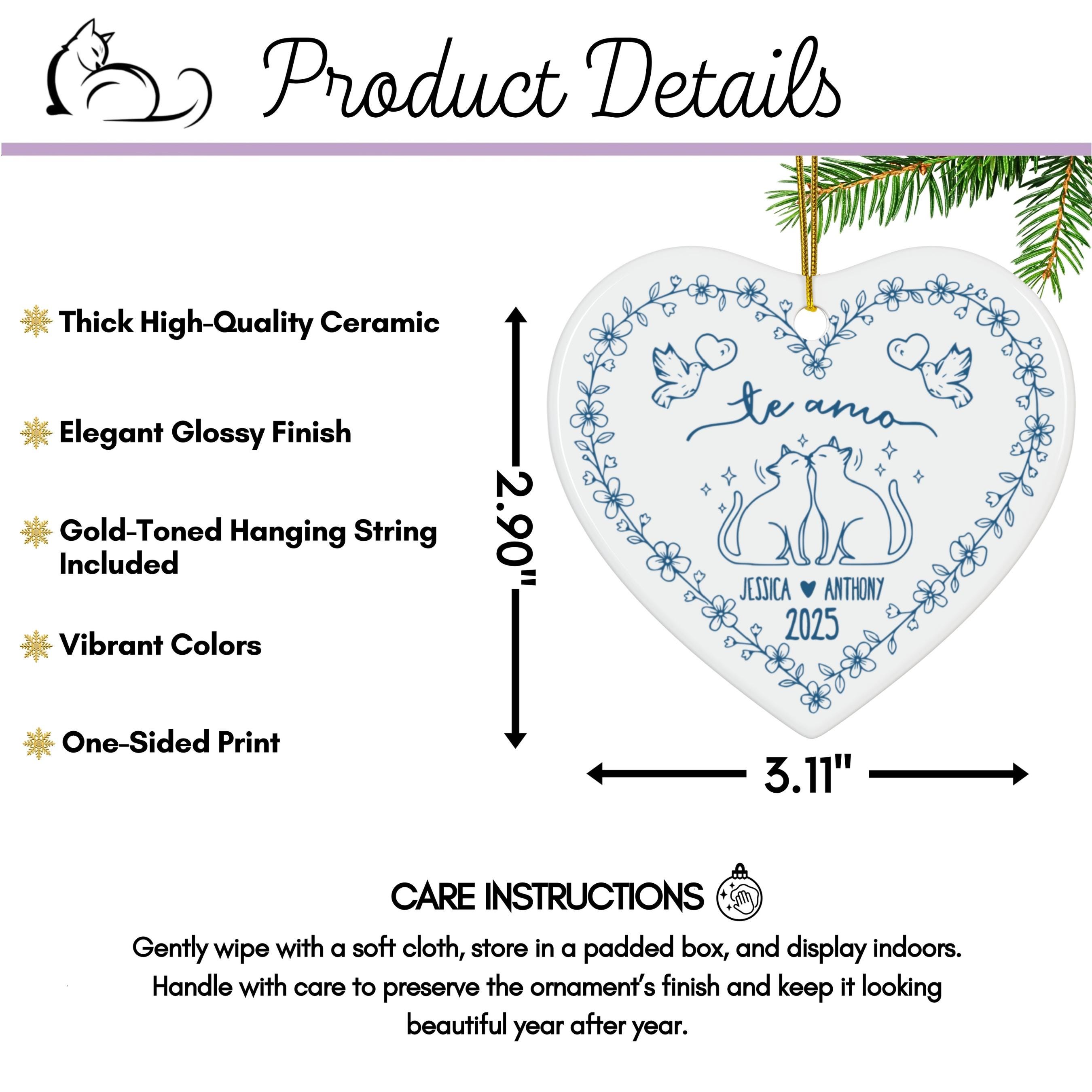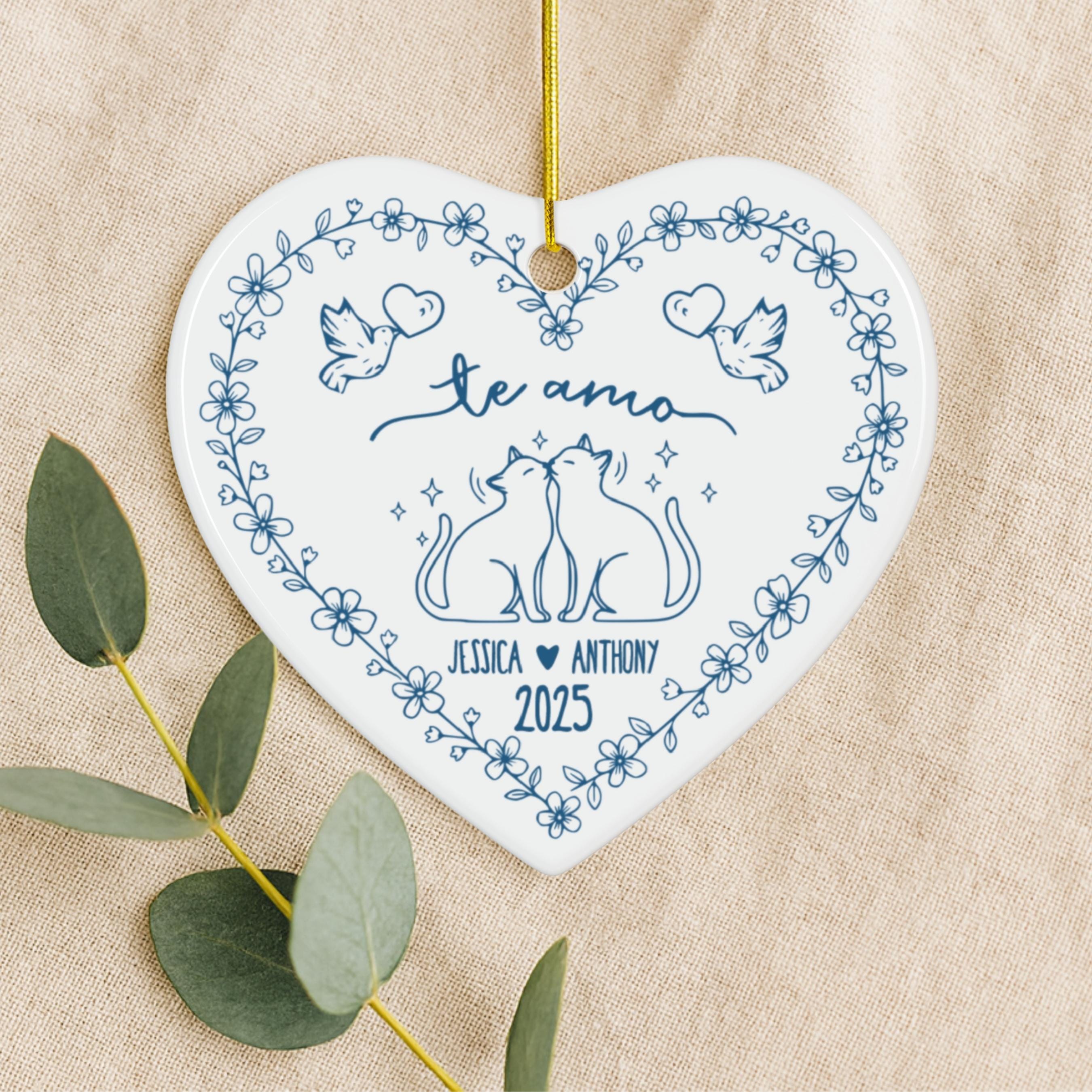 Say “te amo” in the sweetest way possible. This personalized heart-shaped cat ornament is a romantic keepsake made for cat lovers who believe love is forever (and sometimes has whiskers). Featuring two cuddling