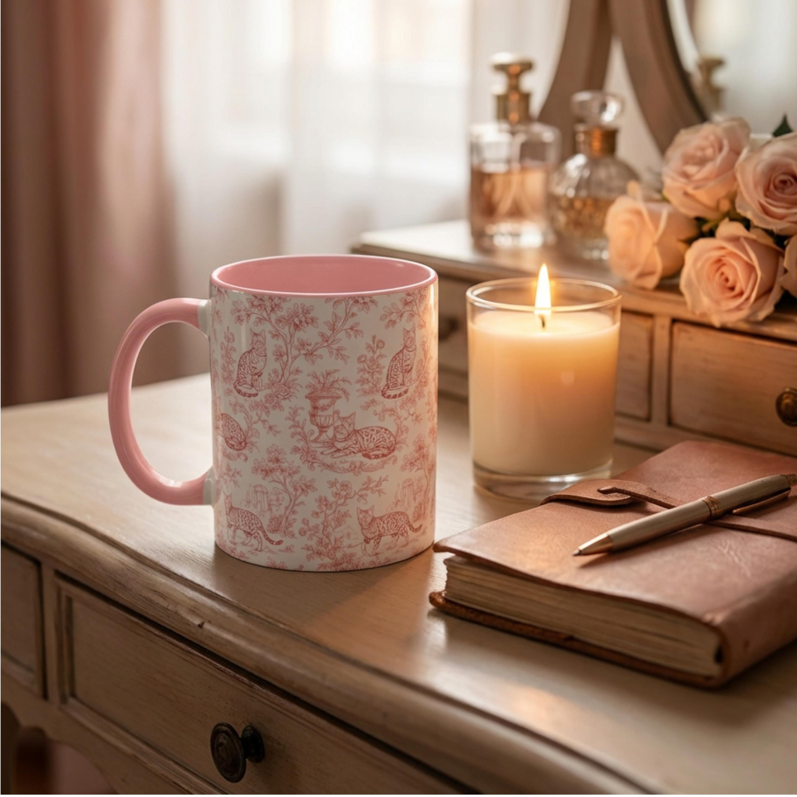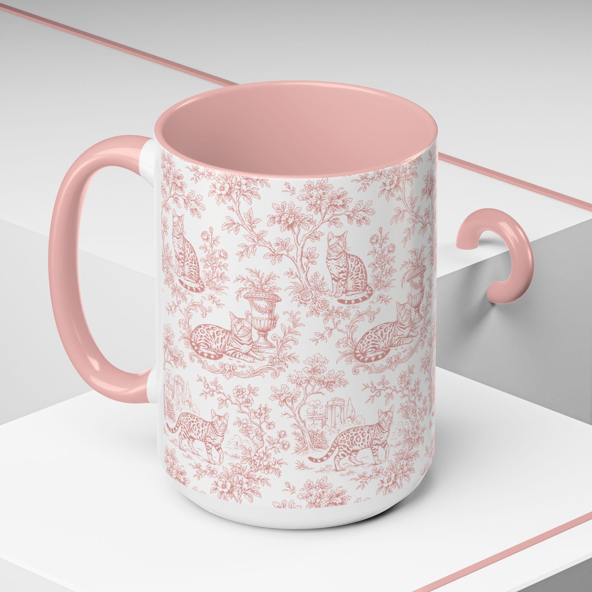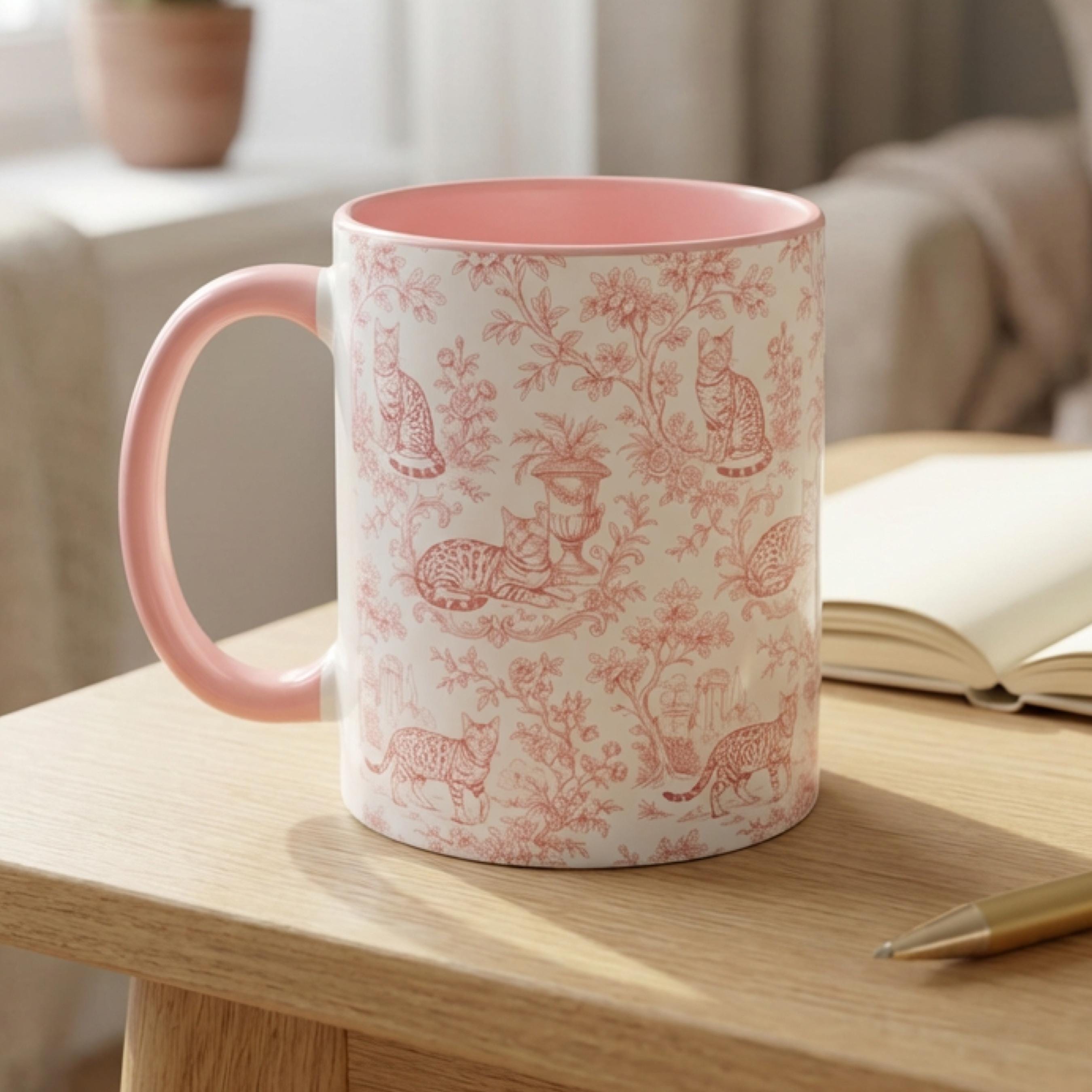 Start your day with coffee, cats, and classic charm. This pink toile Bengal cat mug features elegant vintage-style artwork paired with a soft blush interior—perfect for cat lovers who adore timeless aesthetics and cozy morning rituals.