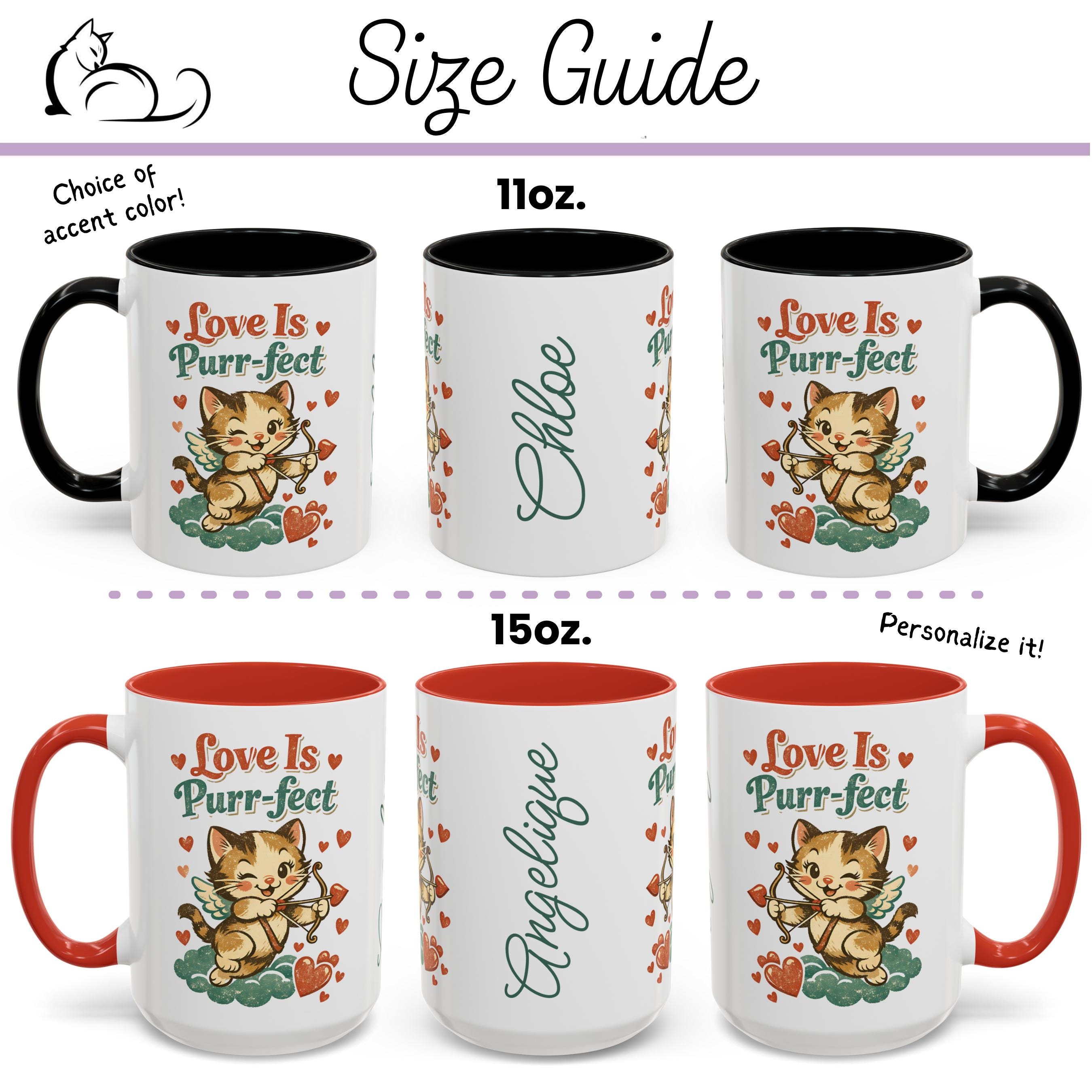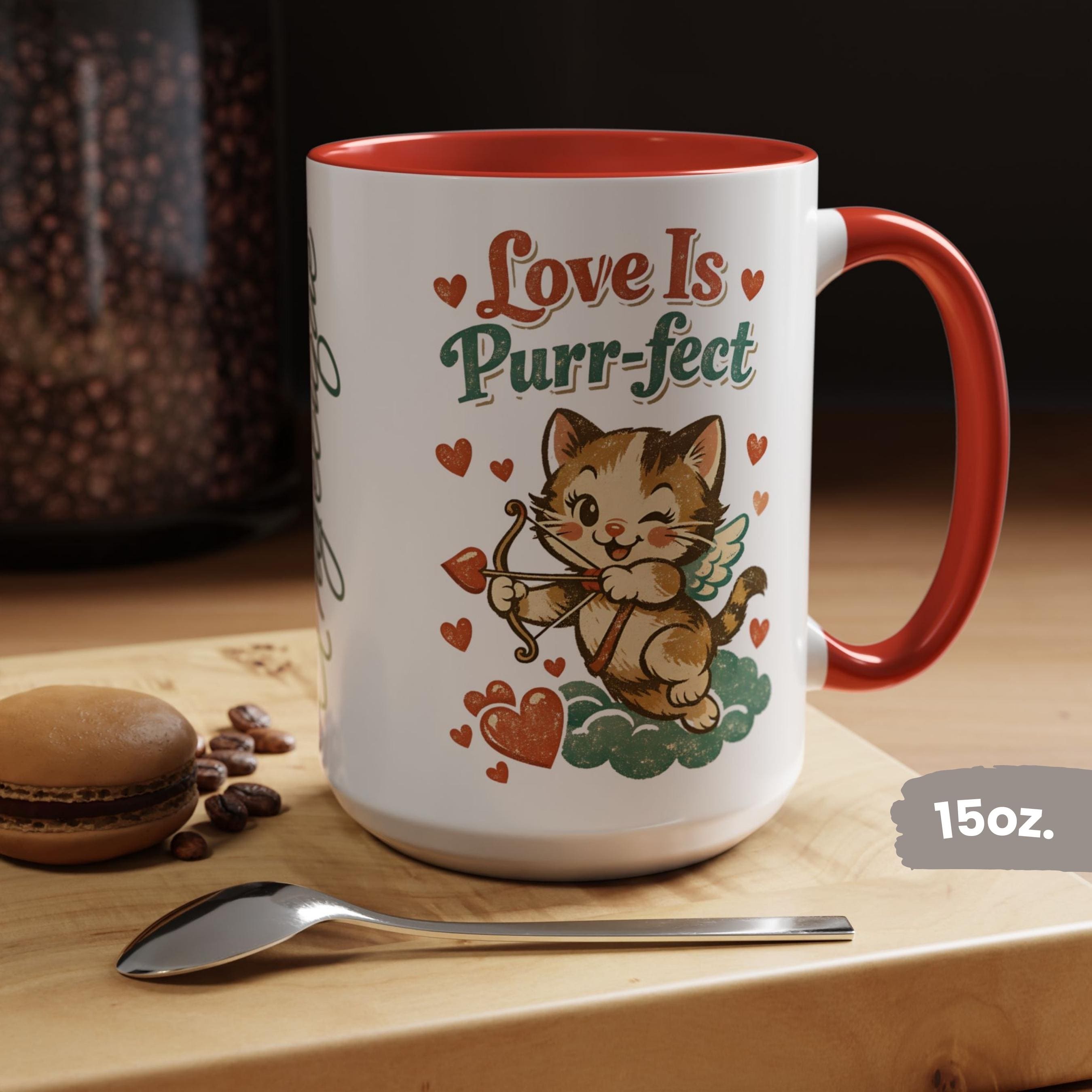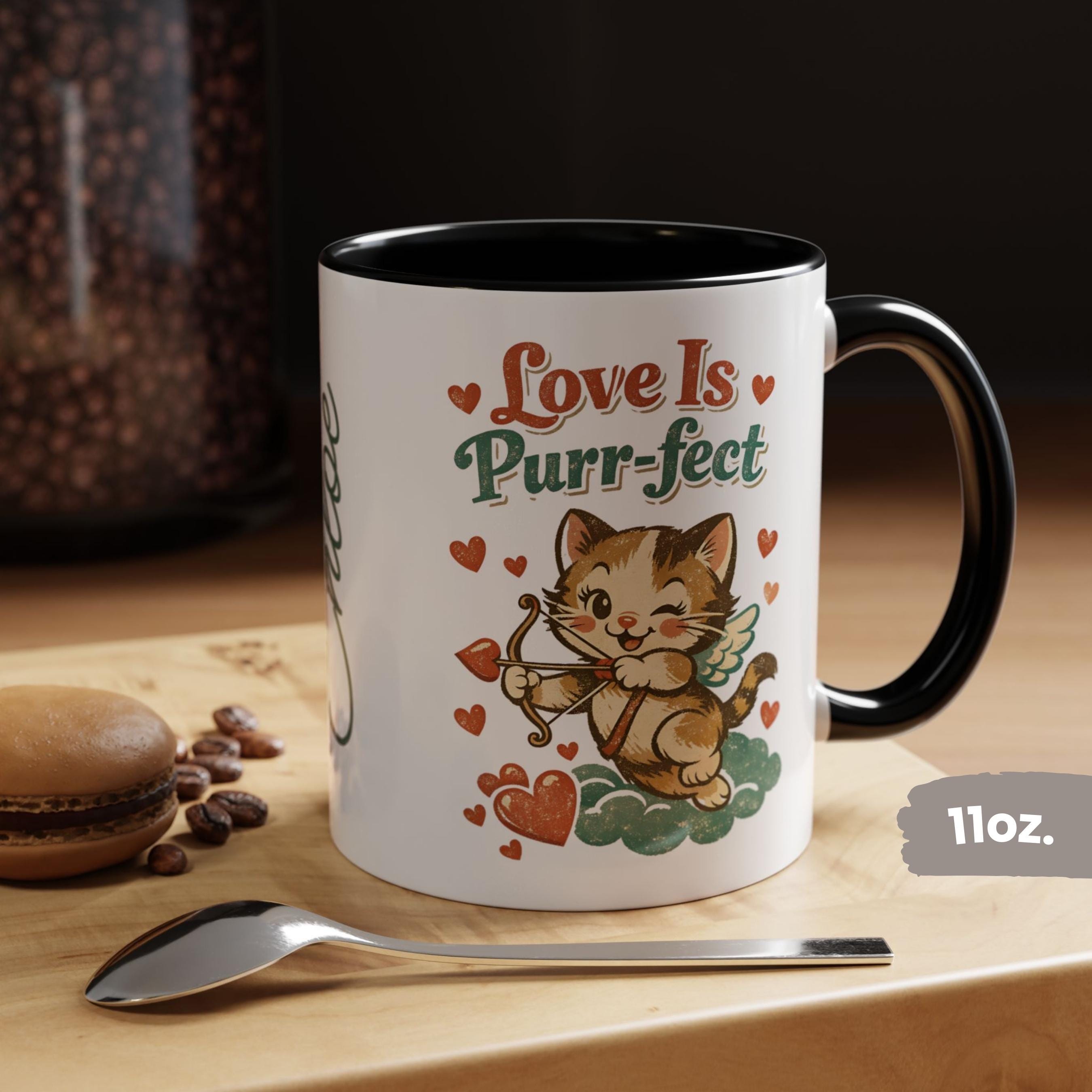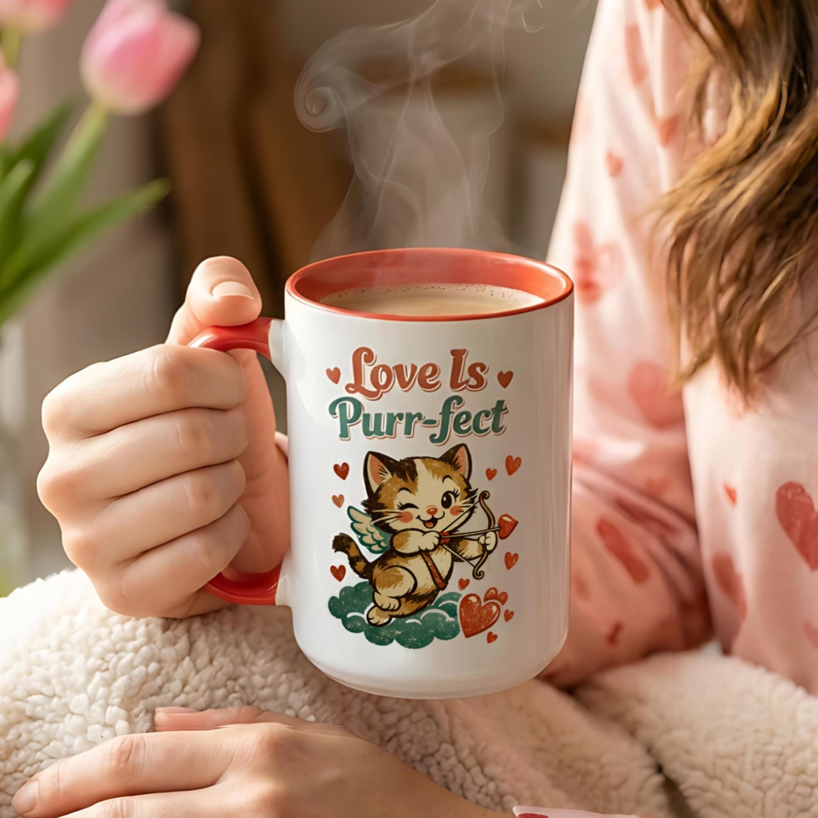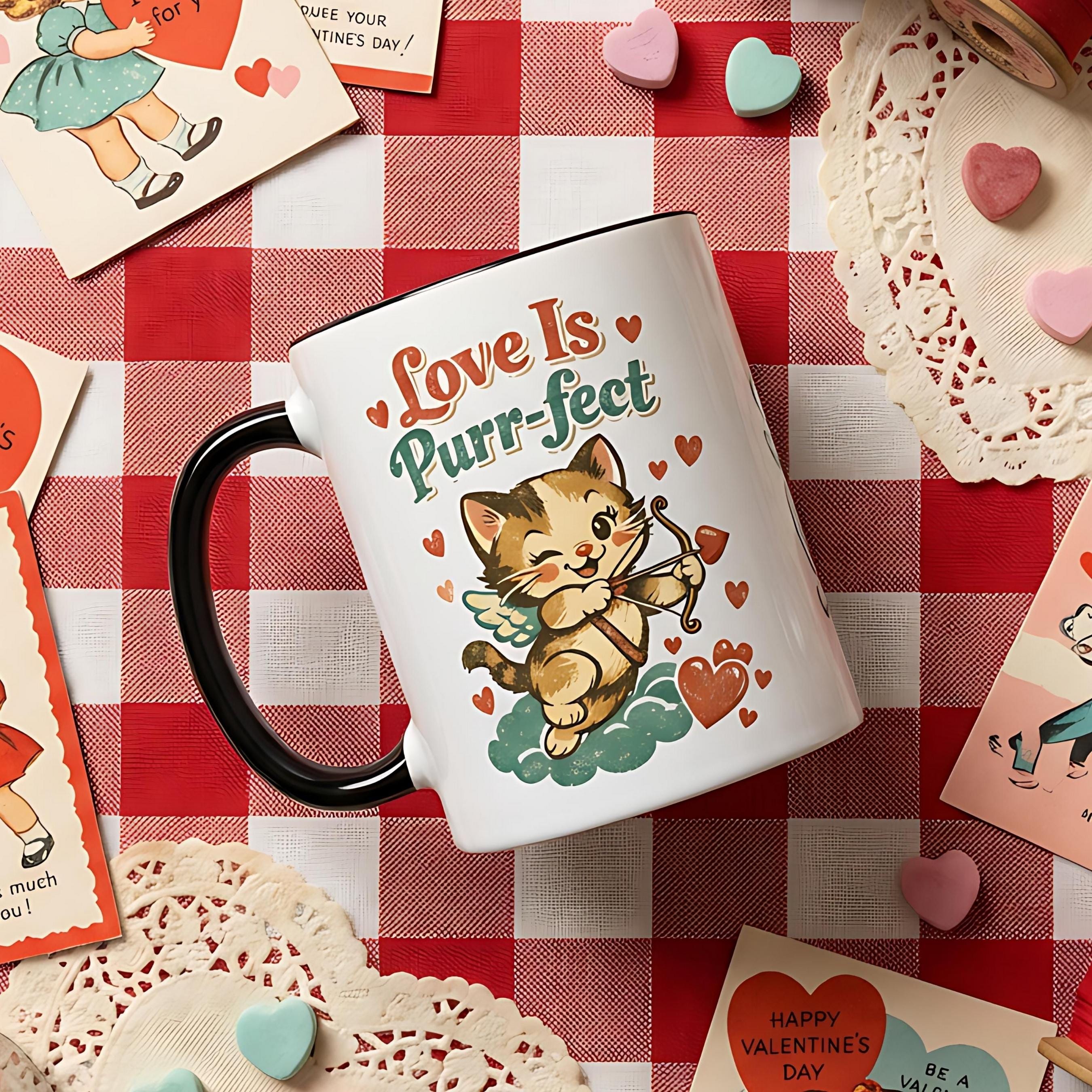 This “Love Is Purr-fect” retro Cupid cat mug is the ultimate feel-good coffee cup for cat lovers who believe a little whimsy makes every sip better.