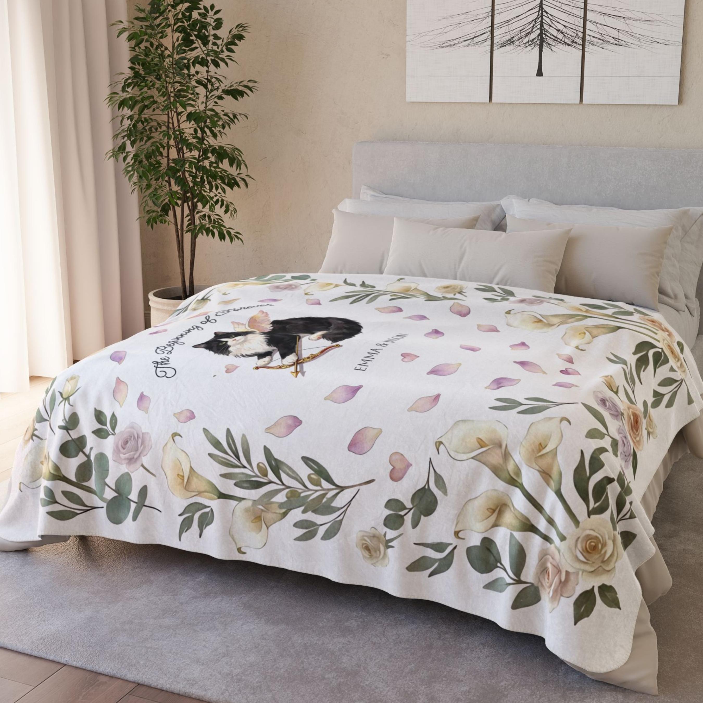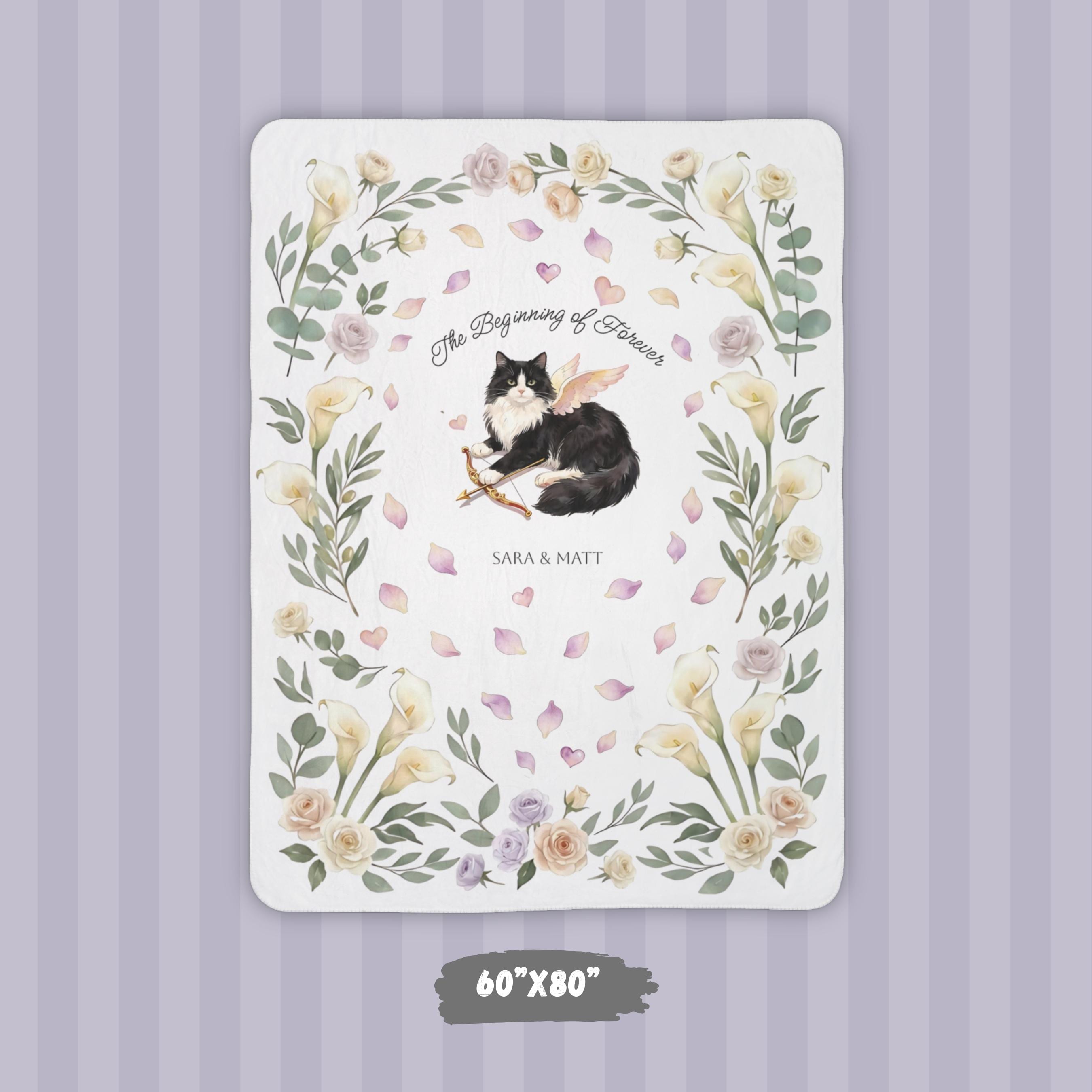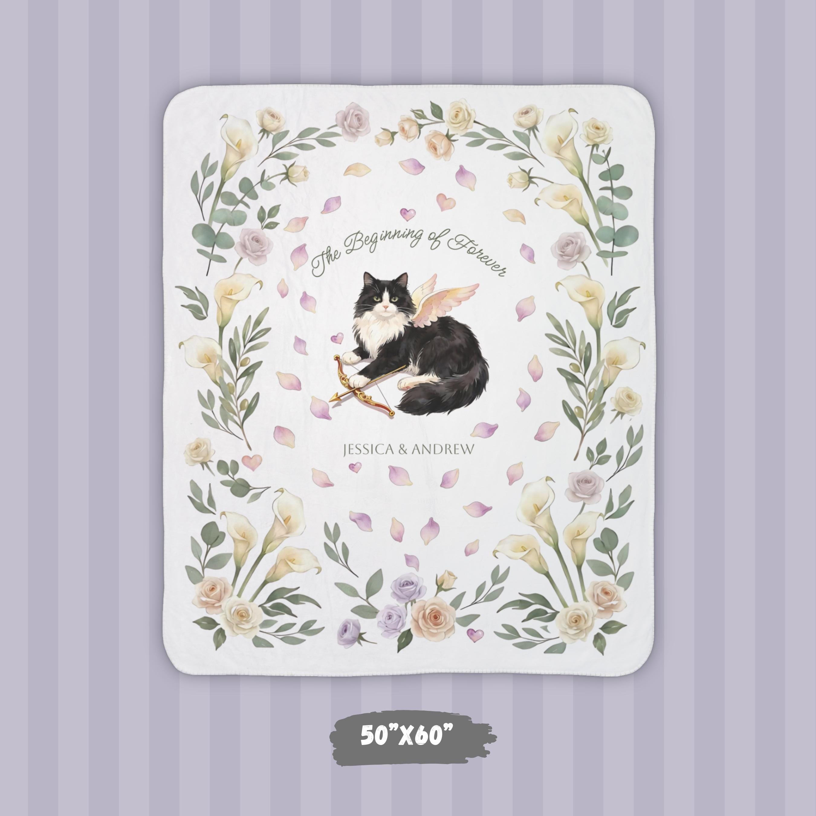 This personalized engagement sherpa blanket features a whimsical Cupid tuxedo cat surrounded by romantic florals, floating petals, and soft greenery. Add the couple’s names and an optional date to create a meaningful keepsake that celebrates the beginning of forever. Cozy, sentimental, and made to last—this blanket turns a once-in-a-lifetime moment into something you can cuddle every day.