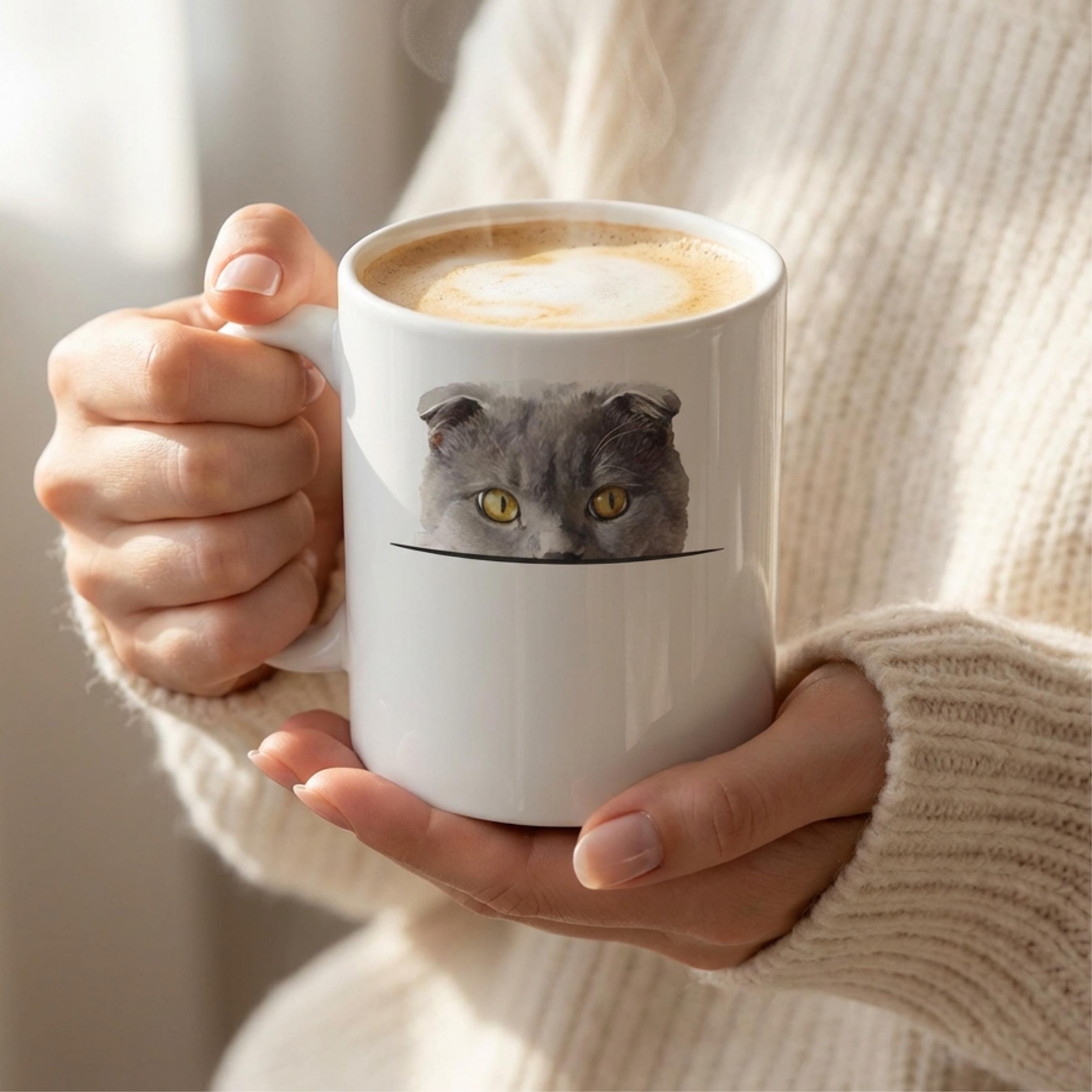 🐾 Adorable peeking Scottish Fold design on both sides of the mug